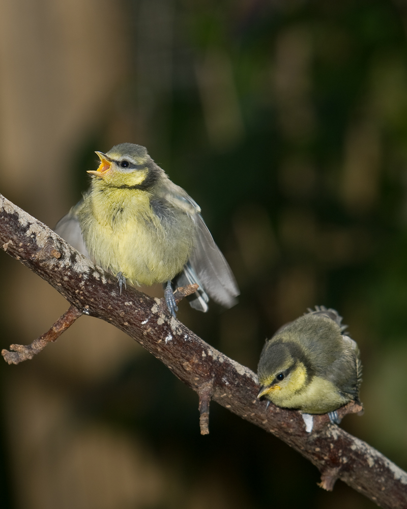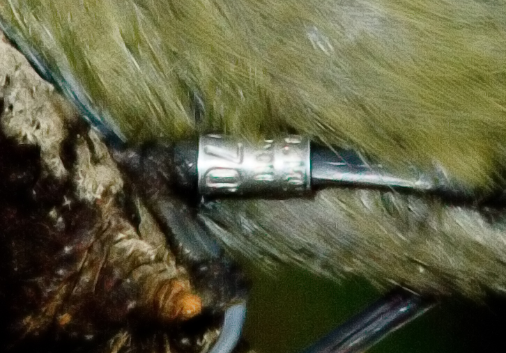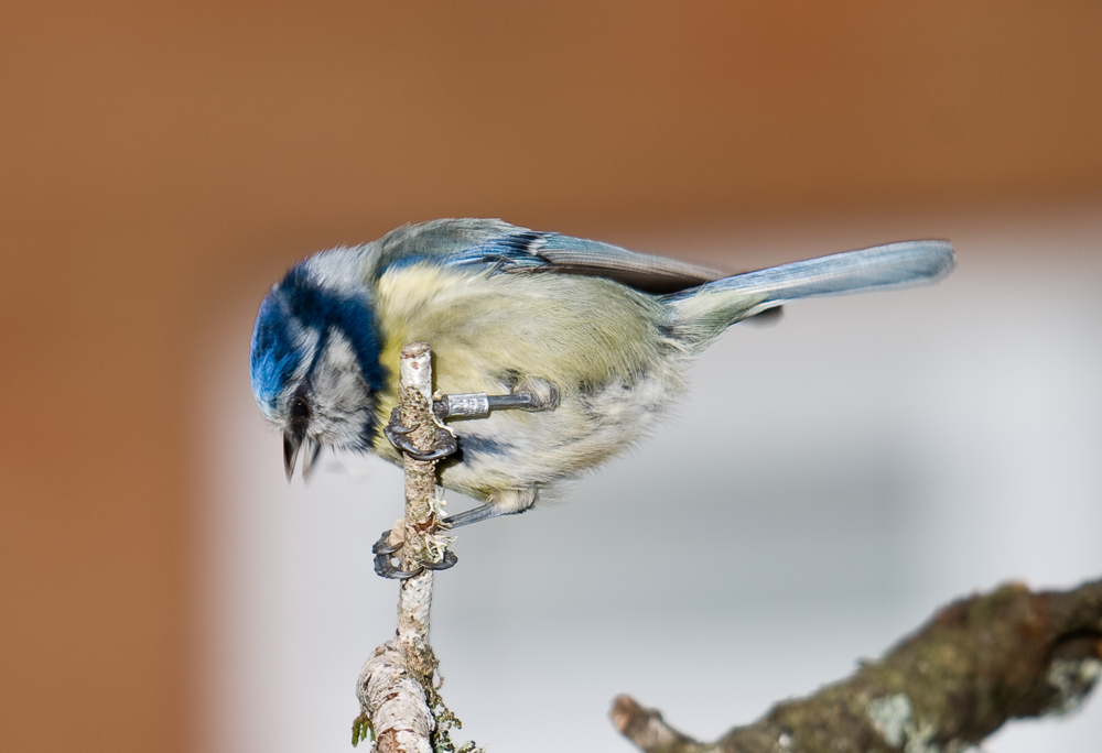 On the 11th January we had a ringing session in my garden. A Blue Tit was ringed, a male as it happened. This can be told for certain by measuring the wing length which is longer in male Blue Tits than females. The last couple of days has seen the return of this bird sporting his ring and now with around 6 young baby Blue Tits and a mate. This morning I took a few photos of him with his youngsters.