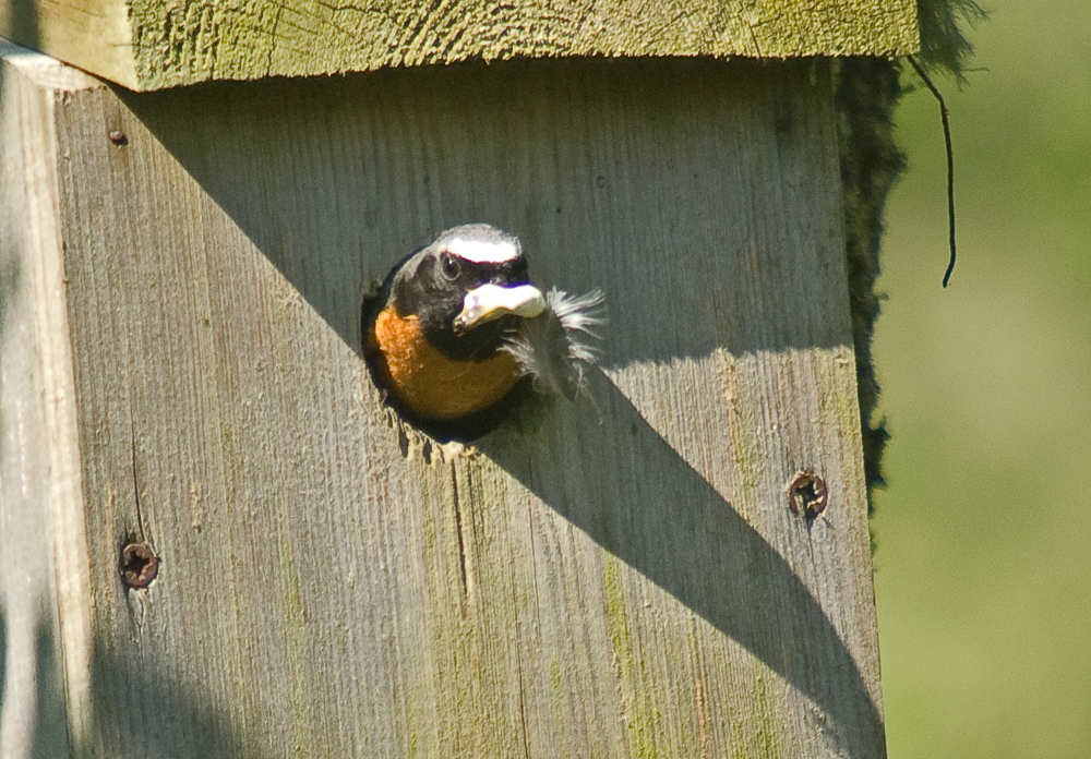 They appeared to take it in turns to bring food but sometimes they would be at the nest box together. I timed the visits at around 12 minutes apart. Here the male is emerging from the nestbox after feeding.