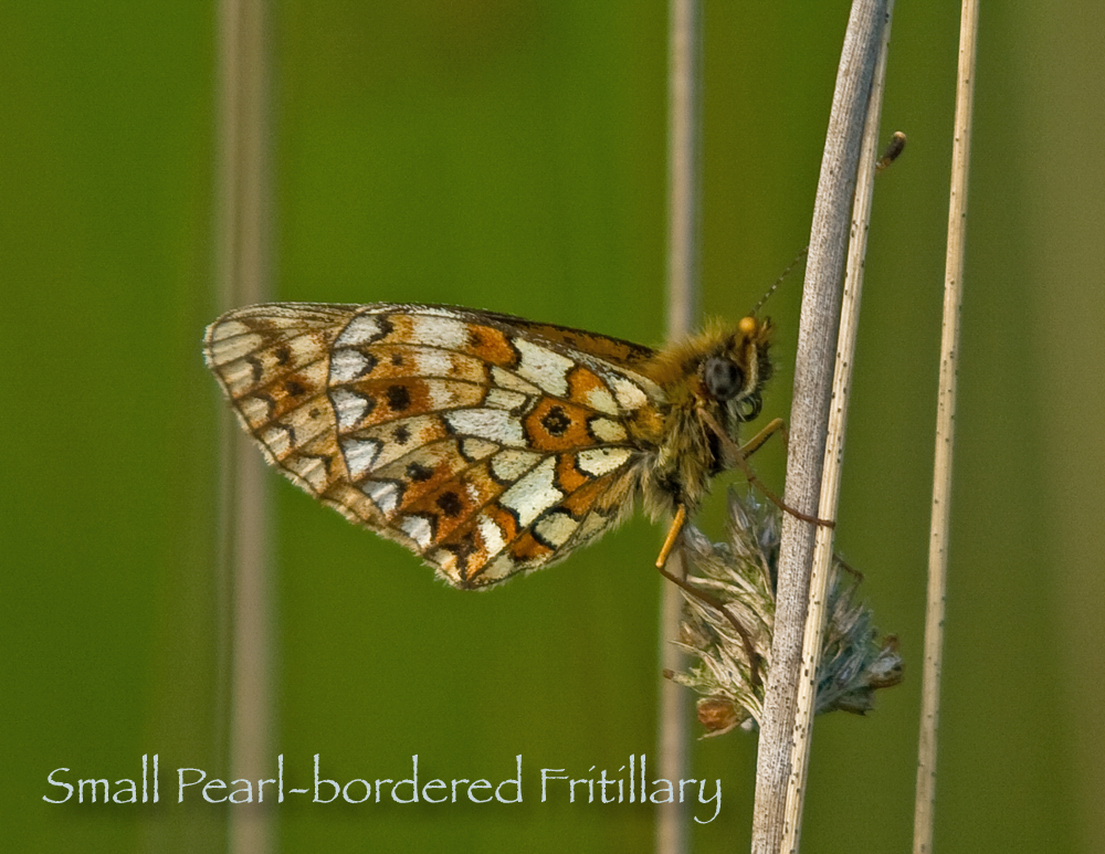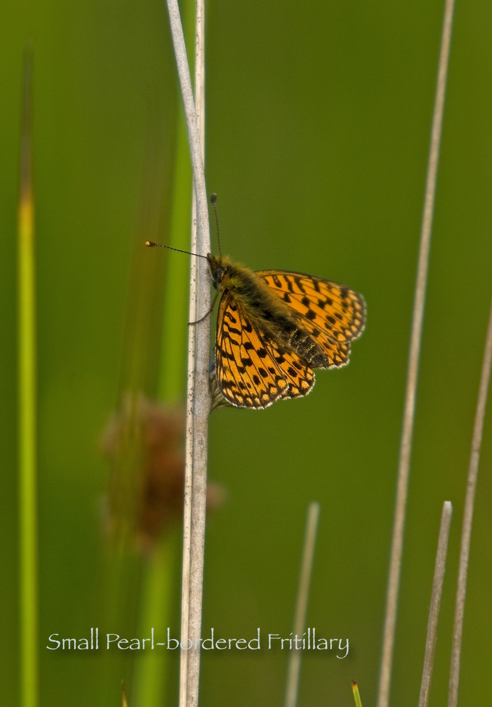 It was quite odd yesterday evening. I decided to go out to the moor yet again just to see if I could get more photos of Whinchat that had been showing so well just a few days again. I made my way down to the area that I had seen them before and it was disappointing now when I realised that there was no sign of them whatsoever. Just 5 days ago there seemed to be 5 pairs at least and now there were none! Quite odd. Later I did discover one pair but well away from the place where they had been almost numerous. As I wandered around I caught sight of Small Pearl-bordered Fritillary butterflies, at last I photographed the underwing and I was able to confirm the ID.