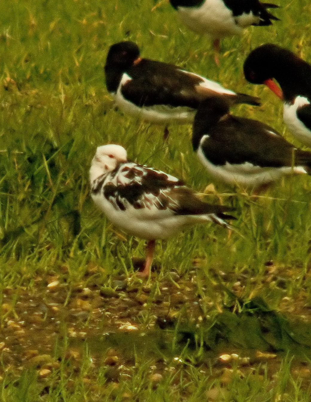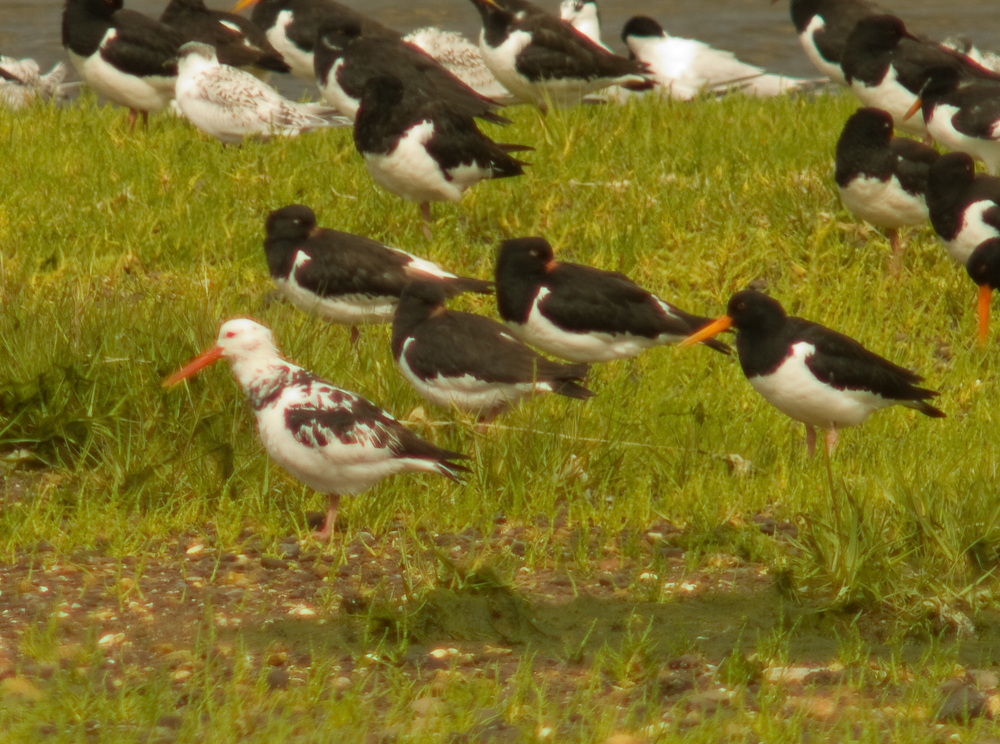 I saw this unusual Oystercatcher from the hide at Dawlish Warren National Nature Reserve this morning. I began to feel a little sorry for it if truth be known. There was a flock of around 100 and this bird was definitely being bullied by the other"normal" Oystercatchers. At one time it was actually attacked by one of it's flock mates. It tried very hard to fit in but the other birds would only just about tolerate it. Chatting to a couple of people in the hide, they told me that this is the second year that it has been seen, so it has done well to survive. I know a little bit about genetical inheritance and this bird would probably be the result of a chance pairing where both parents were carrying the gene for this mutation. When two recessive genes combine then the gene will express its self in an actual colour form. I could see that this bird also had red eyes, so it is also a partial "albino". An interesting bird and a quirk of nature.