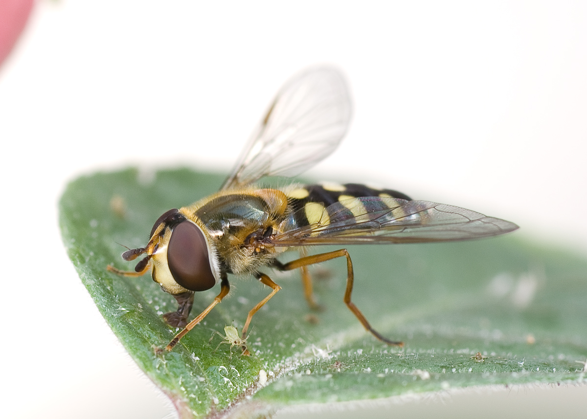Couldn't post to the blog without adding a picture. I took this photograph in Derby, on the way back from Yorkshire. It is feeding on "honey-dew" left by aphids. There is a tiny newly hatched/emerged aphid in the picture as well. This makes this picture, at least to my eyes very interesting. The species is Eupeodes luniger.
