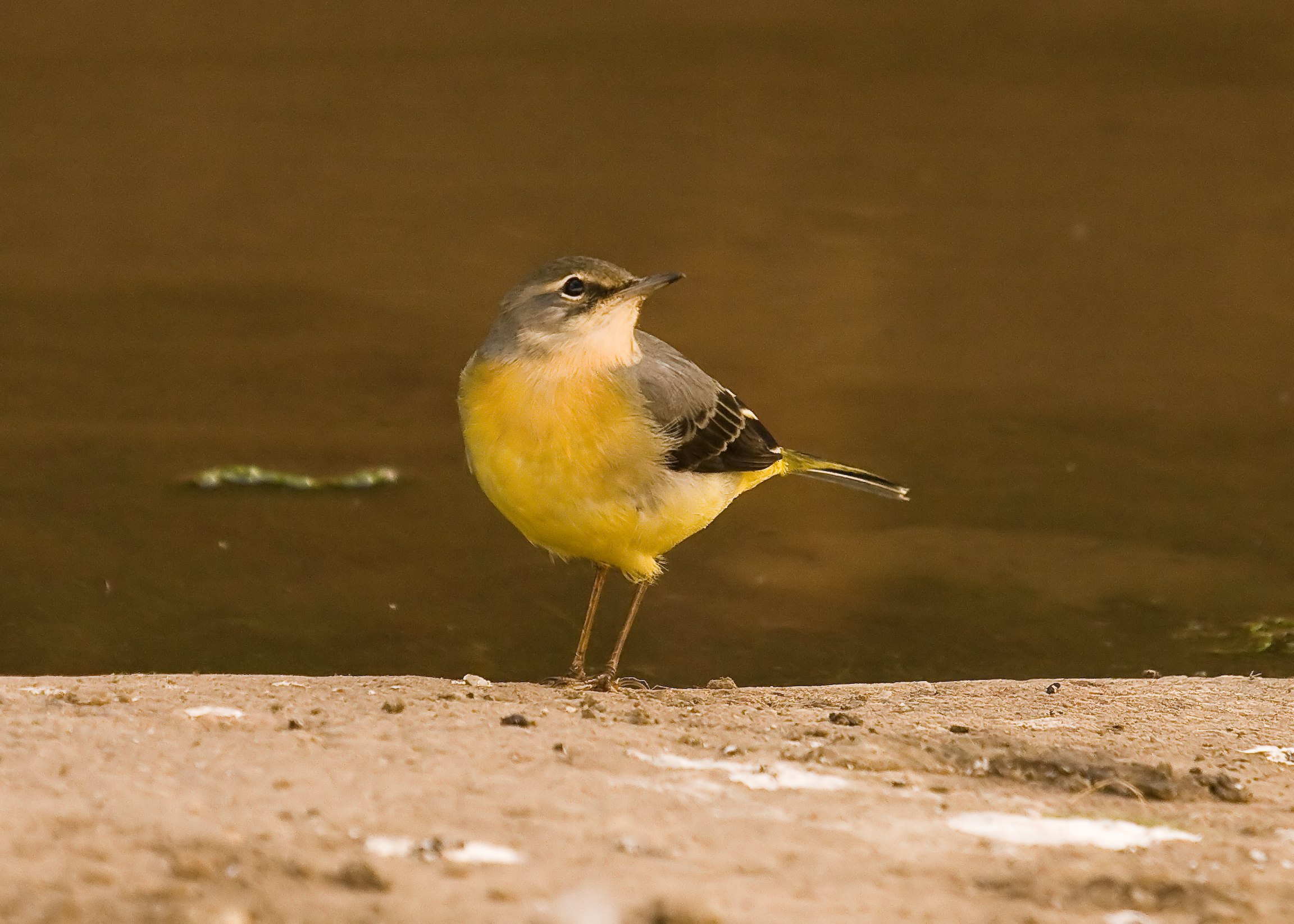 Having had the unfortunate experience this morning before 8, I gave it all a bit of thought and realised that the factory workers would be cooped up inside earning their crust for the majority of the day. So, after lunch I returned to the brook confident that there would be peace and quiet. I was right, and apart from a 10 minute period when they were allowed a “fag’ break, they were slaving away indoors. My reason for return was to try and get closer to the Grey Wagtails and consequently better, crisper shots. It worked well and I did get closer. The light was not quite right but the standard of shots did improve. It was also very interesting as I got to know, not only this species but the individuals concerned. For instance, I am pretty sure that the bird above is a female and at one point another Wagtail settled opposite and called. This caused the hen to crouch. This was either an alarm call and the hen crouched to escape predation, or she reacted in a submissive way to the superior bird. I also watched her feeding on small flying insects, at times leaping up to take them on the wing. I saw her foraging in the mud for larvae, probably Drone Fly larvae which I know live in stagnant mud and breath through a “snorkel”.