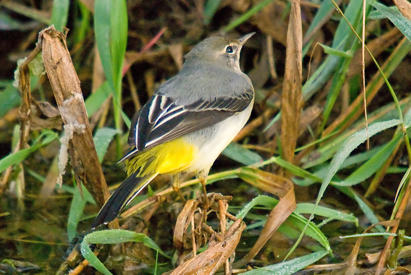 I started my wildlife day early and before 8 I was sat in my hide hoping for a Kingfisher experience. The Grey Wagtails have been giving me such great photo opportunities and I make no apologies for posting yet more photos of them. The great thing about wildlife photography is that every outing offers something different depending on the prevailing light and this morning, as the sun started to get higher there was a glorious brightness. My strategically placed log looked so inviting and it was only a matter of seconds really before the Grey Wagtail male was perched in my viewfinder so to speak. Seeing this pair of Grey Wagtails so often this last weeks has been a real treat. “Make hay while the sun shines” is an English proverb and I certainly am going to get as many shots of these “celebrity” birds while I can. When I first saw them last week it was just the female that I seemed to see. Then the male appeared but I didn’t get many pictures of him at first. They are obviously paired up and call to each other constantly but only once have I seen them within a few feet of each other. I am using these wagtails as an opportunity to improve my technique and have tried with different lenses and settings as well as fill flash. However, bright light certainly makes photography easier.In this first shot today he left the log to look for insects amongst the streamside vegetation.