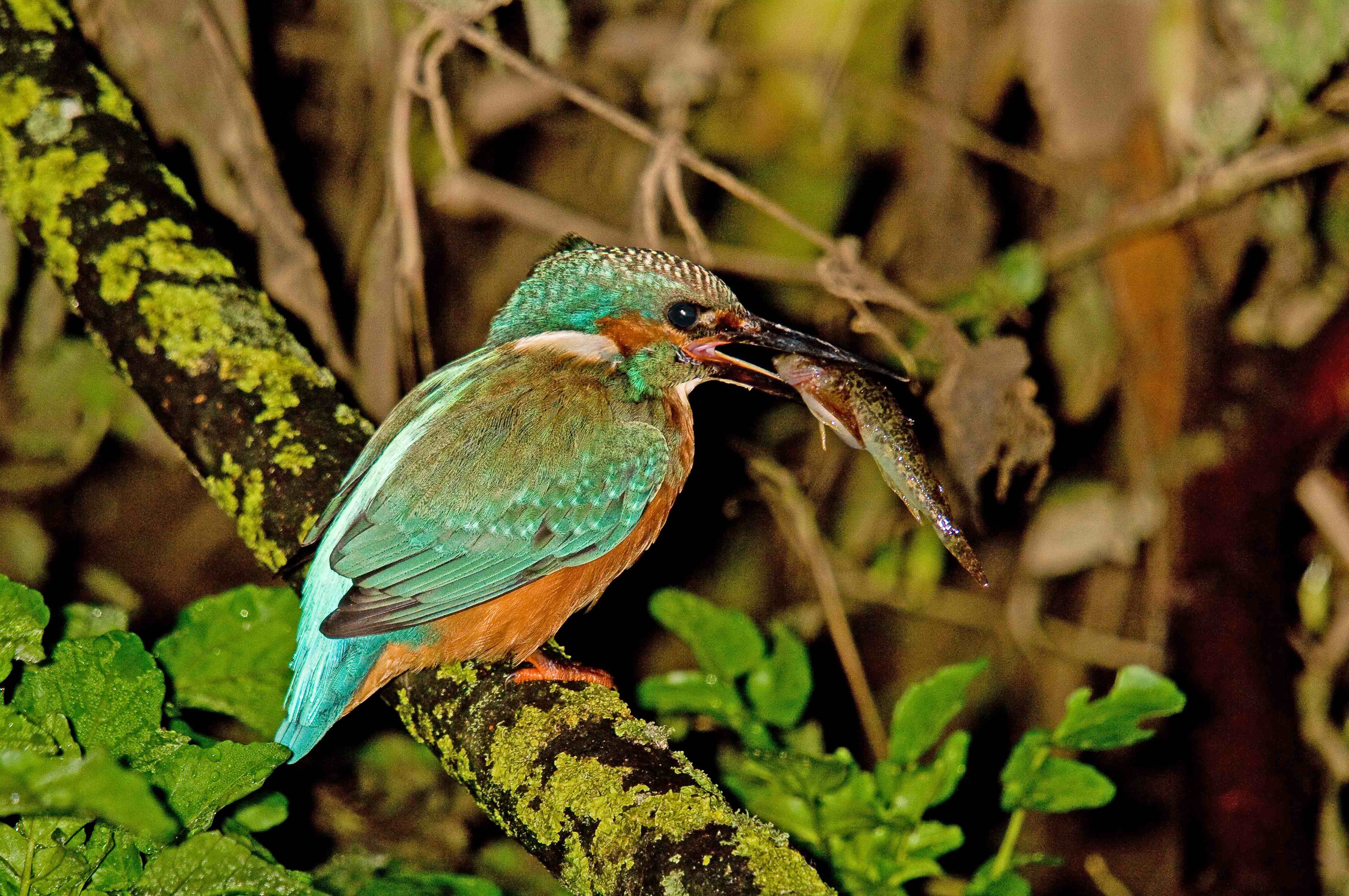 The last couple of days has seen me continuing to try and get more and more views on photos of the lovely Kingfisher that I have been watching for almost the last month. I decided yesterday that the bird had begun to get a little bit suspicious of the portable hide. I decided to build a semi-permanent one with a camo tarp based around bamboo canes. It worked really well because I went first thing this morning and before 8 he was perched in front of me with a very large loach. The light was a bit dull but I did manage to get a few shots of him with the use of the flash. You can see how big this fish is and he really did struggle to get it down having several goes at it. Eventually it disappeared down the hatch.