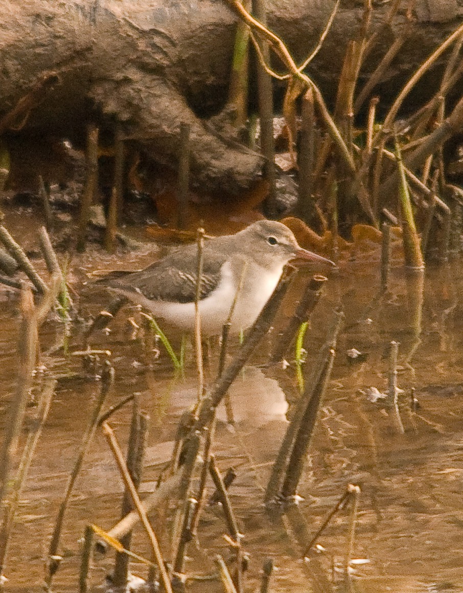 The Spotted Sandpiper is described by "Birdguides" as a very rare bird. Therefore after the postman had delivered my new lens I was off to the very near location of Topsham where one had been reported yesterday. As Murphy seems to have a hand in most of my bird photography exploits of late, I was hopeful and optimistic but prepared for disappointment as well. I parked the car easily and made my way past the rec towards a couple of "tooled-up" characters. One turned out to be Dave Stone and the other another gentleman that I see if ever there is something worth chasing. I knew I was in the correct spot. Pleasantries were shared and then as if by magic our bird flew to a spot just to our left and quite close. I scrambled to get myself set, fixing my lens to the camera and then lying prone to get the shots I wanted. Murphy was on hand and had by now put a cloud over the sun which 10 minutes earlier was blazing down. So with poor light getting worse I snapped away.