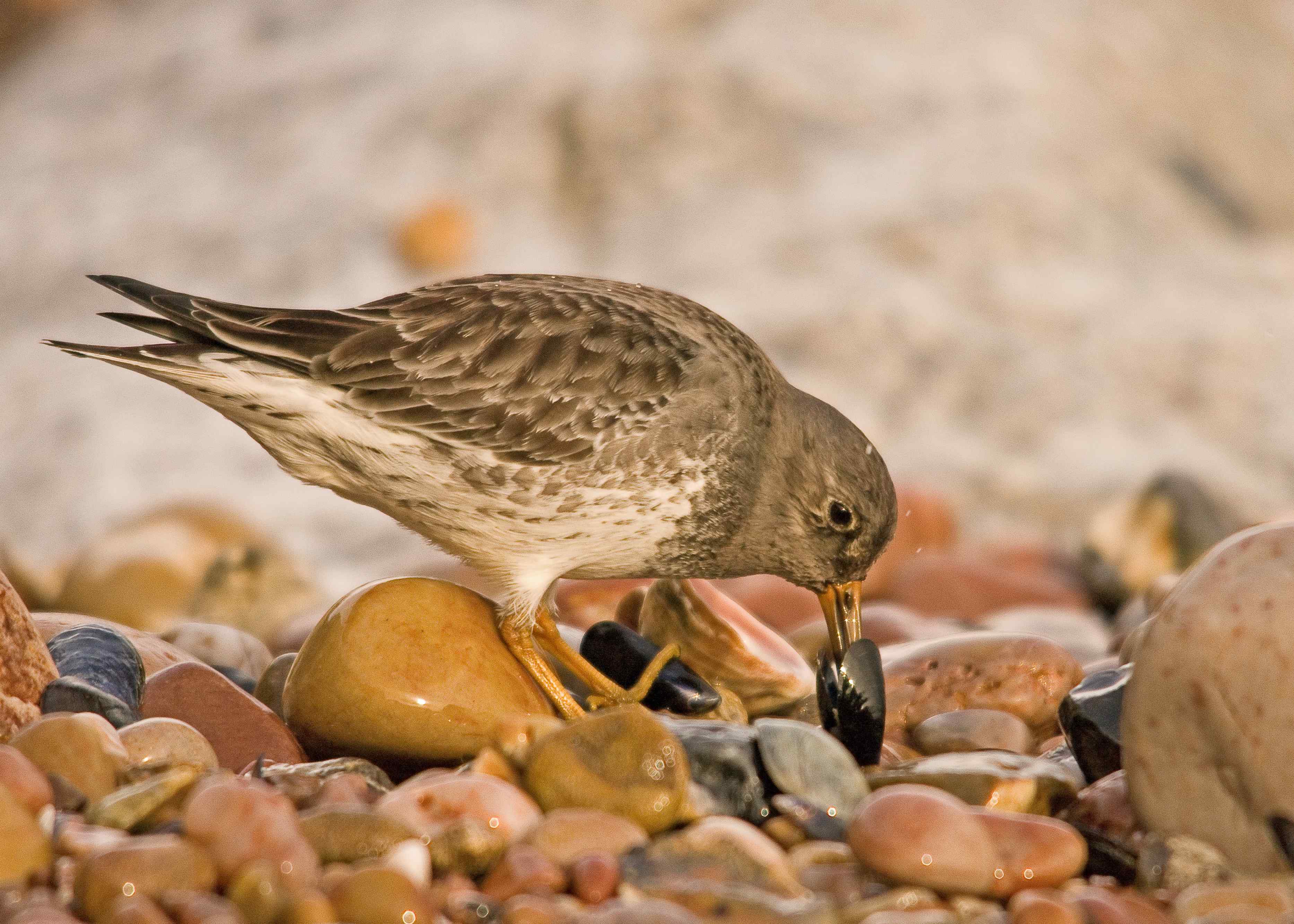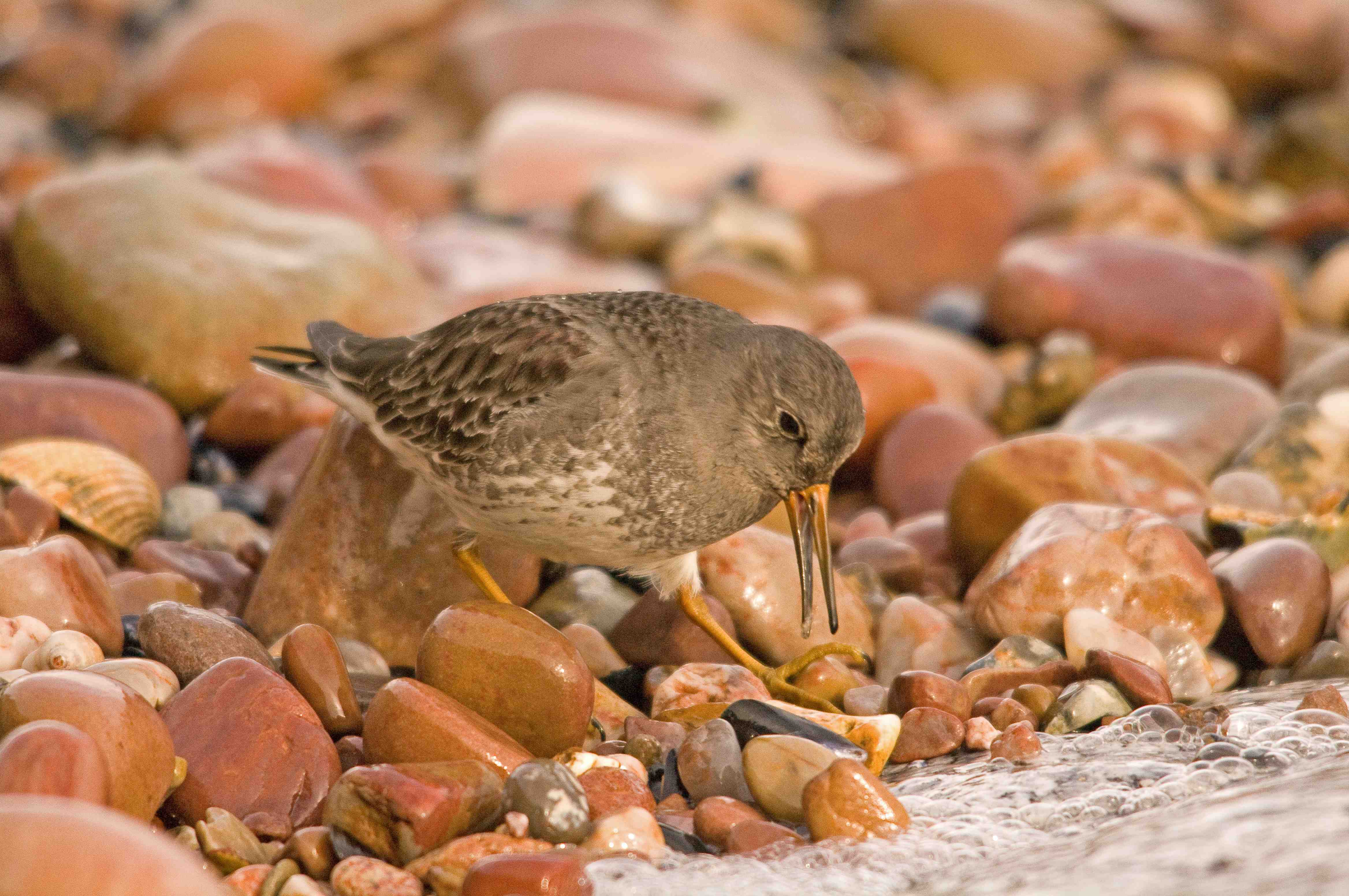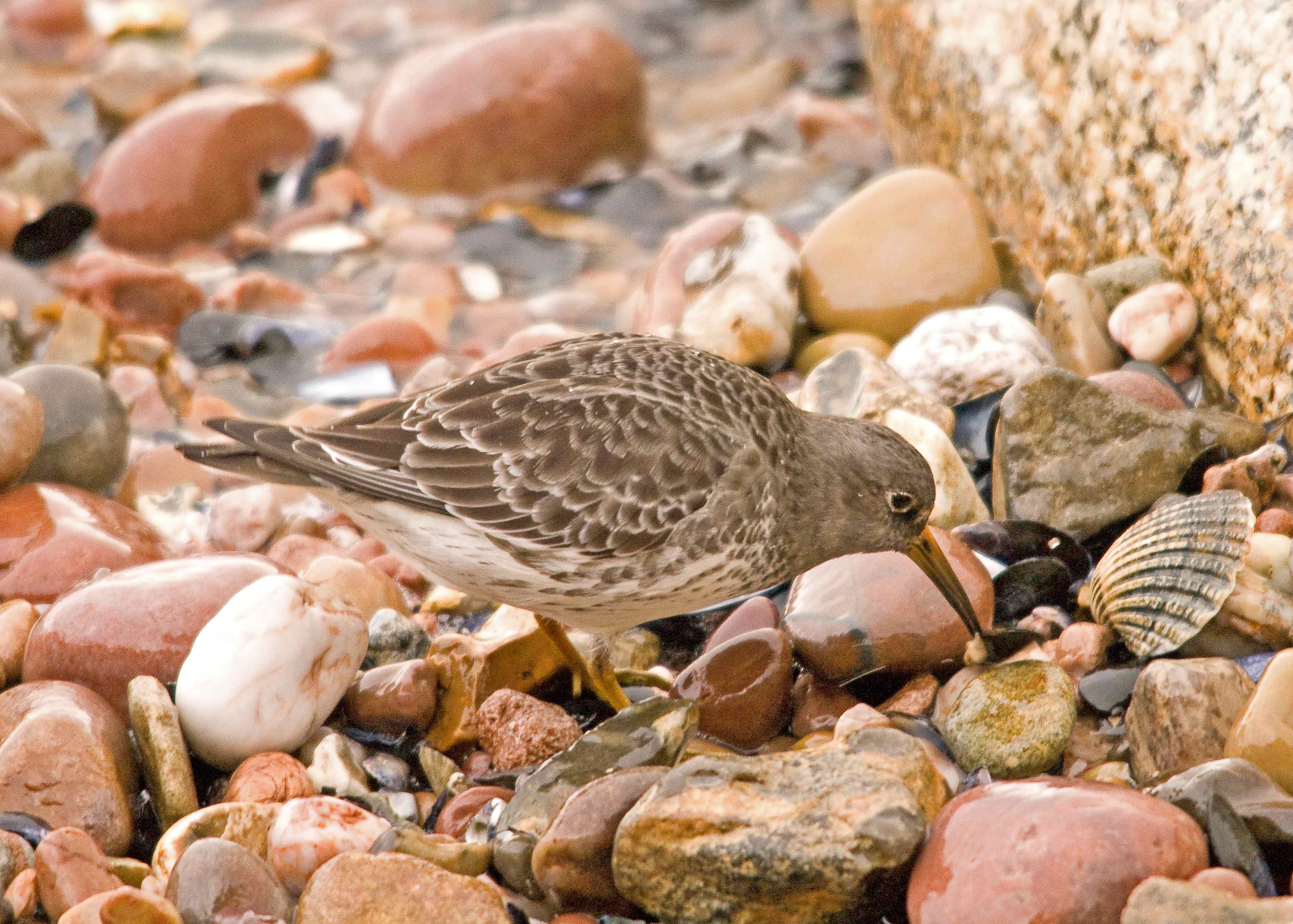 Purple Sandpipers are a very rare breeding bird in Scotland with only a handful breeding in secret locations. In the winter, migrating birds from the Arctic Tundra spend the winter on the East Coast, Devon and Cornwall. They are often in the company of Ruddy Turnstone and in fact feed in much the same way, that is, close to incoming waves. They can be seen precariously scurrying clear of waves as they crash on to rocks on the surf line. Today, I watched and photographed a small group on the beach by Jacob’s Ladder at Sidmouth. The rain was teaming down and this kept dog walking disturbance down to a minimum. The birds were feeding on mussels that were being washed in and smashed open by the strong surf. They are described as very “tame” and easily approachable which certainly was the case today. I got a great deal of pleasure from watching and photographing them and I think I managed one or two half decent shots.
