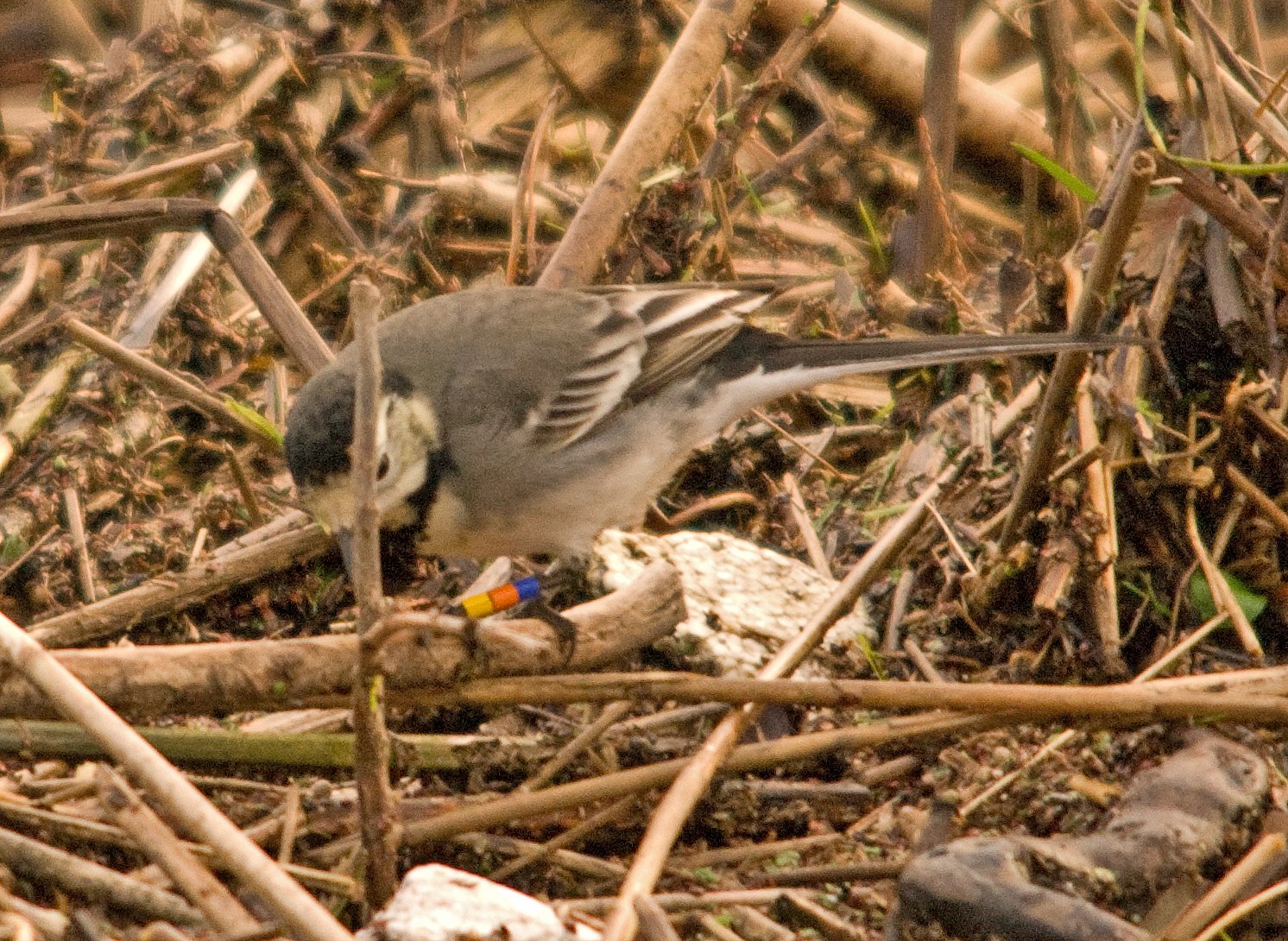 The next story concerns Pied Wagtails. If you look at the image above of a Pied Wagtail – Motacill alba yarellii, you can see that it is sporting a collection of coloured plastic rings. This is very interesting and well worth some investigation. There are three places currently involved in colour ringing of Pied and White Wagtails, Slapton in South Devon, Abbotsbury in Dorset and a site in Scotland. Quite a degree of information has already been gathered from the scheme so far. Colour ringed birds have been reported in Iceland and France for example. There is a pink ring on the right leg of this bird which indicates that it was rung during this year. The rings on the left leg can be placed in a variety of combinations meaning that individuals can be tracked by their sightings. I have reported our bird to the chap responsible and await his reply. I am guessing that this bird was rung at Slapton but it could possible have been from Dorset, it will be interesting to see. I will certainly be taking more notice of Wagtails in the future to see if I can discover any more with rings.