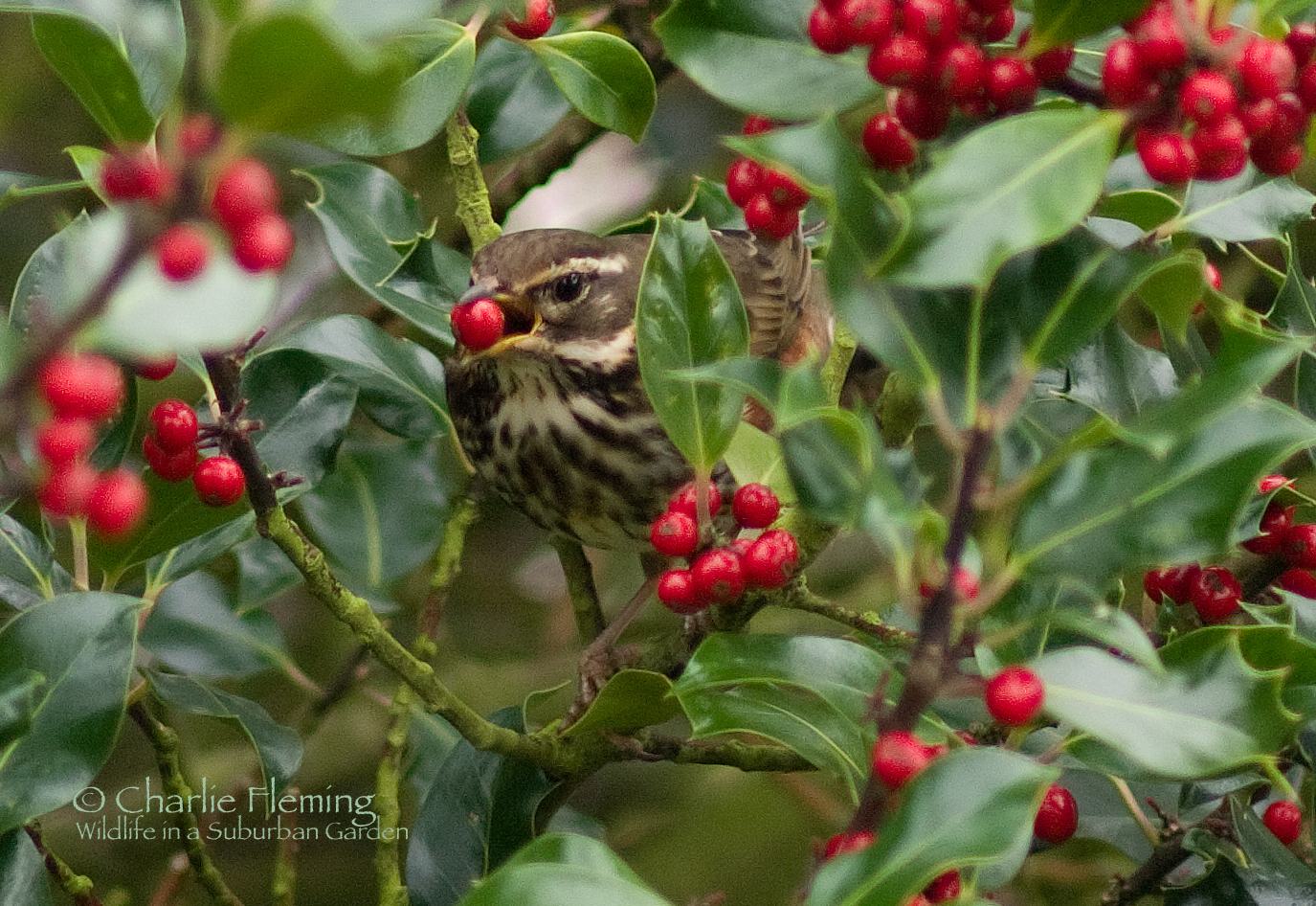 As you can see, the focus of attention is the holly berries on a tree in my front garden. This is a really mature tree which is laden with the most berries that I have ever seen. I first noticed the Blackbirds in the tree at the end of last week and it now seems likely that the Redwings were there with them all along. Fieldfares are quite often in the same flock as Redwings so I am not surprised to see one as well.