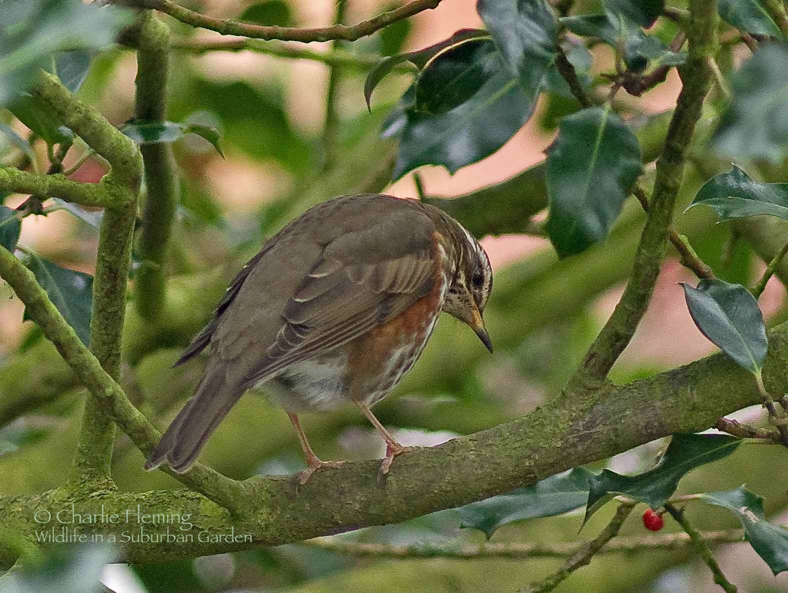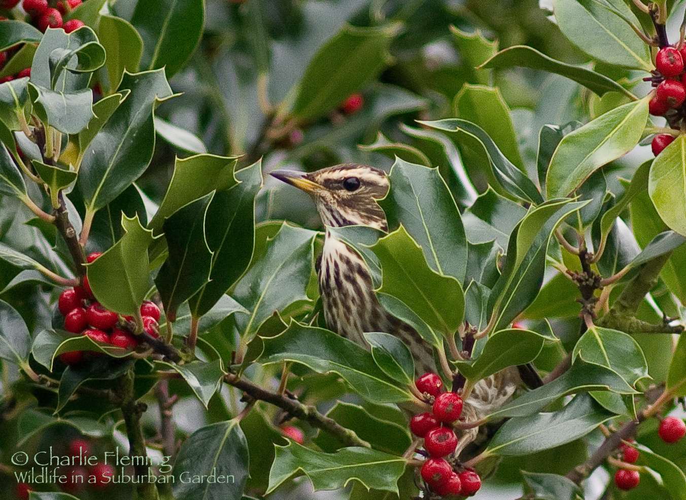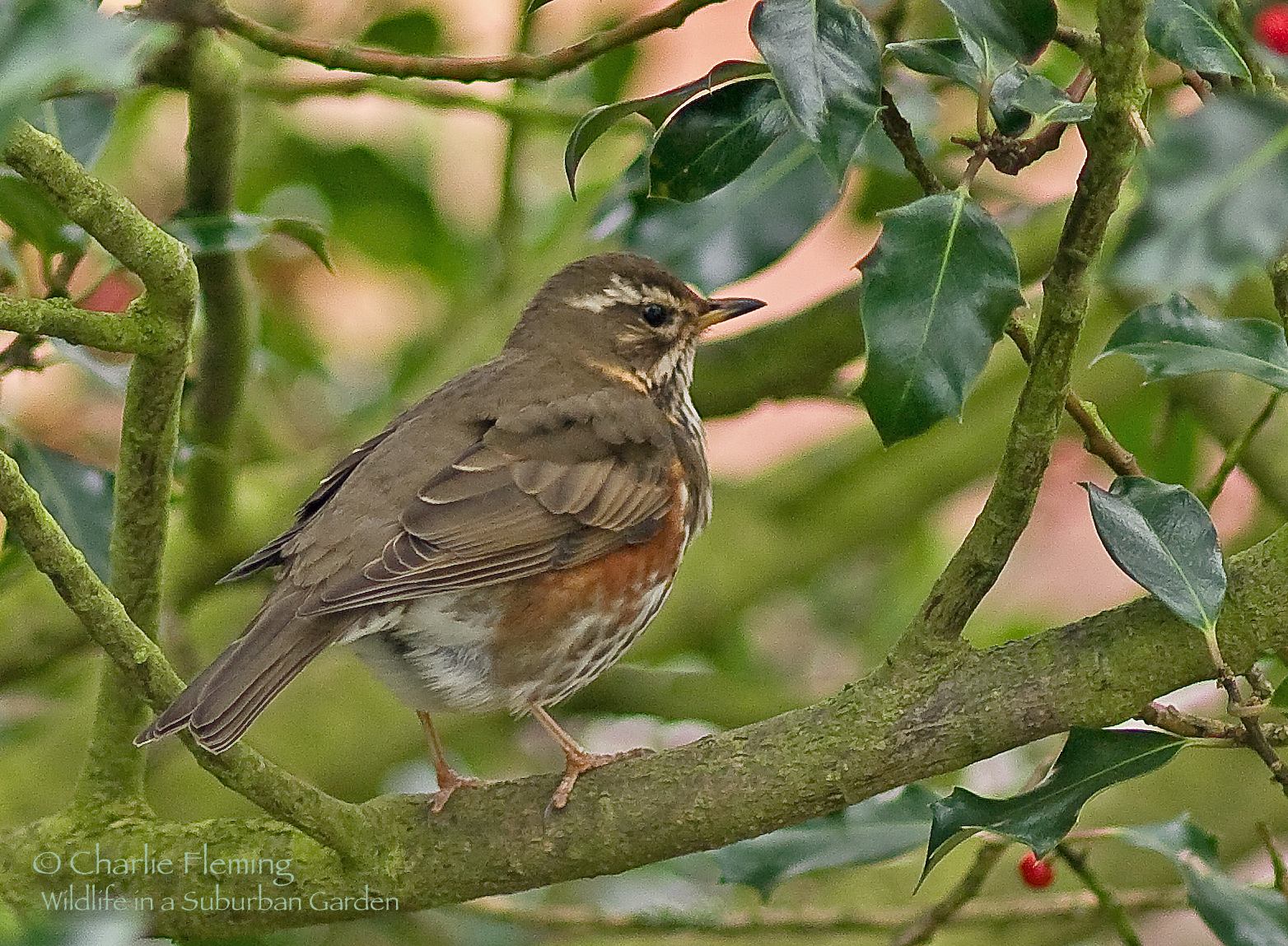 Yesterday's Redwings have been back and today they were joined by a Fieldfare and several 'strange" Blackbirds, that is, strangers who I haven't seen before. I have been trying for the last hour or so, to get a photo of the Redwings that I now know are feeding on the Holly Berries in my front garden and after setting up a screen from a front bedroom window, I finally managed a reasonable close up……… more to follow I think.