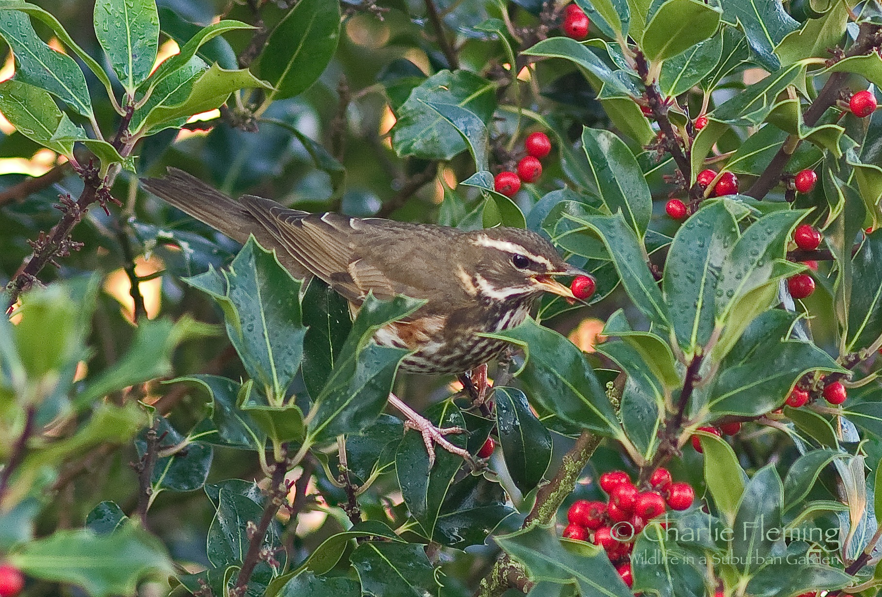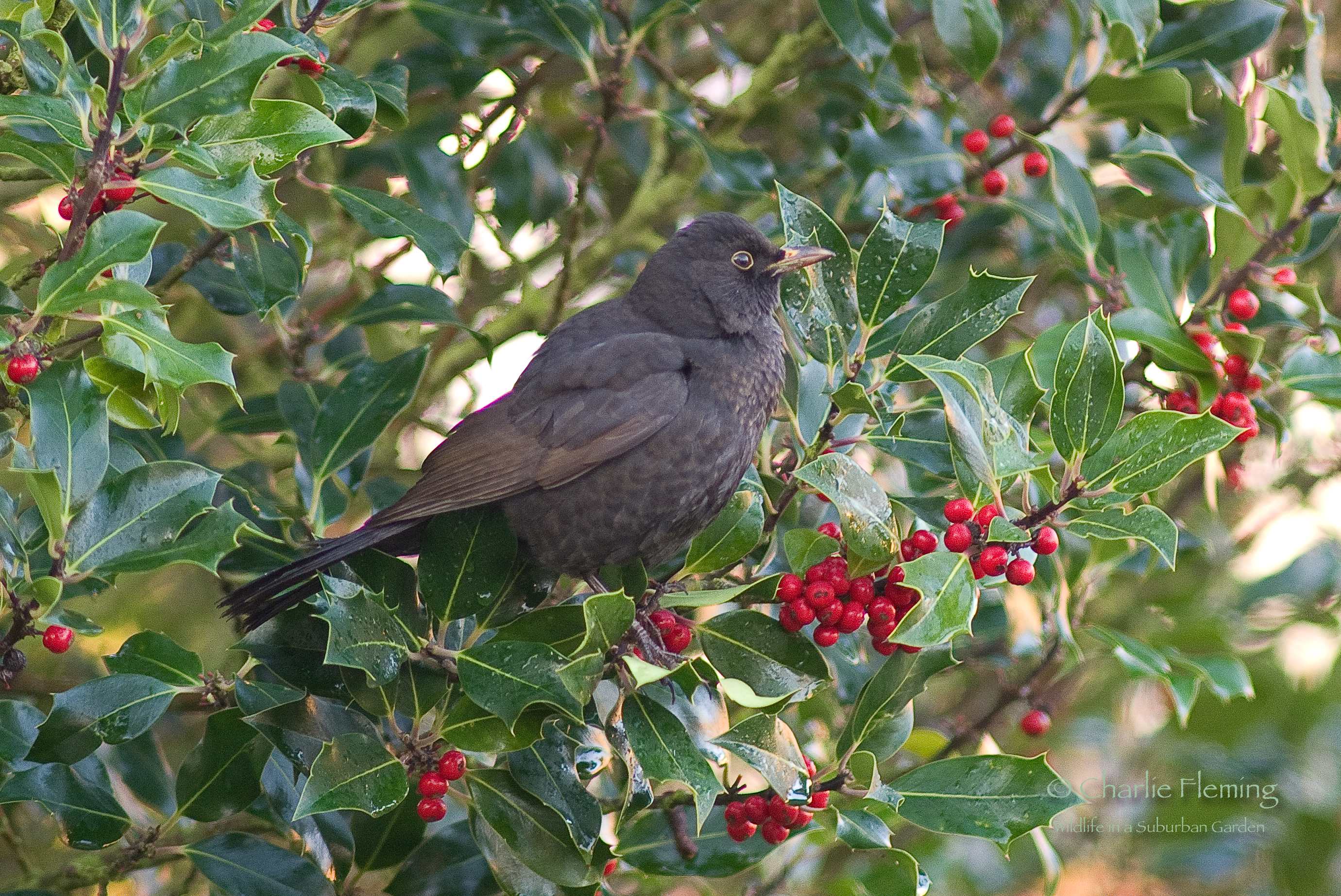 Today we had just a glimpse of the sun and decent light at last, the first since Sunday. I was pleased to see that we were still being visited by the Redwings and Blackbirds. So with the prospect of some good photos I took my place in the comfort of the bedroom and almost immediately started taking photos. After a short while this Fieldfare appeared and posed for just a minute or two. The Redwings are very wary to say the least and at the first hint of anyone, or anything, they are off. However, Fieldfare are a significantly bigger bird and not as agile as the Redwings and therefore are always perched in a more open place. The Redwings seem to dive in to the tree and then disappear in to the depths of the foliage. It is probably a defence strategy against hawks.