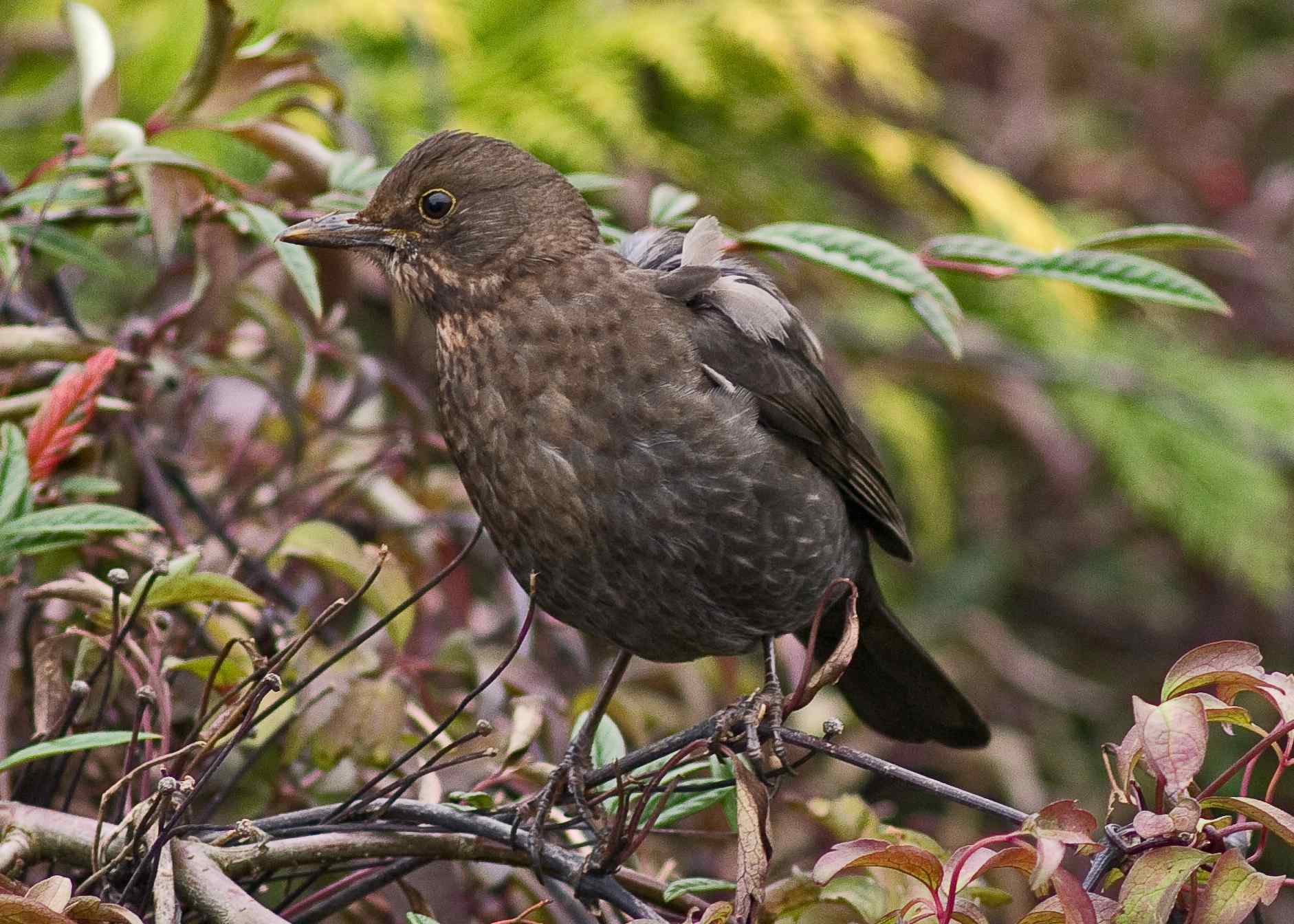 What dreary weather we had today, at least if we had some snow it would be something different and to be frank I am disappointed that we are about the only place in the UK without any! I t did try a little bit at around 2.30 and we had an "ice-sugar" dusting but not enough that it mattered. So, it was that dull that even if there had been anything of note in the garden, then it would have been almost useless trying to photograph it. So with that in mind I tried when I saw our scruffy hen Blackbird who is on her own now that the continental Blackbirds have eaten all the berries and departed. I hadn't realised, but she has still got a bit of damage on her beak which you can just about see in the snap below.