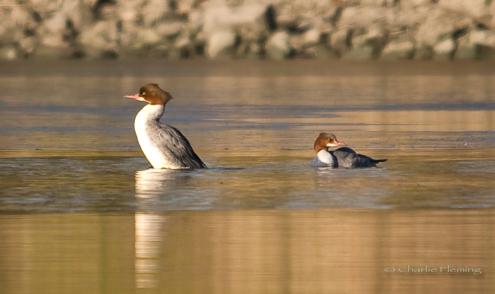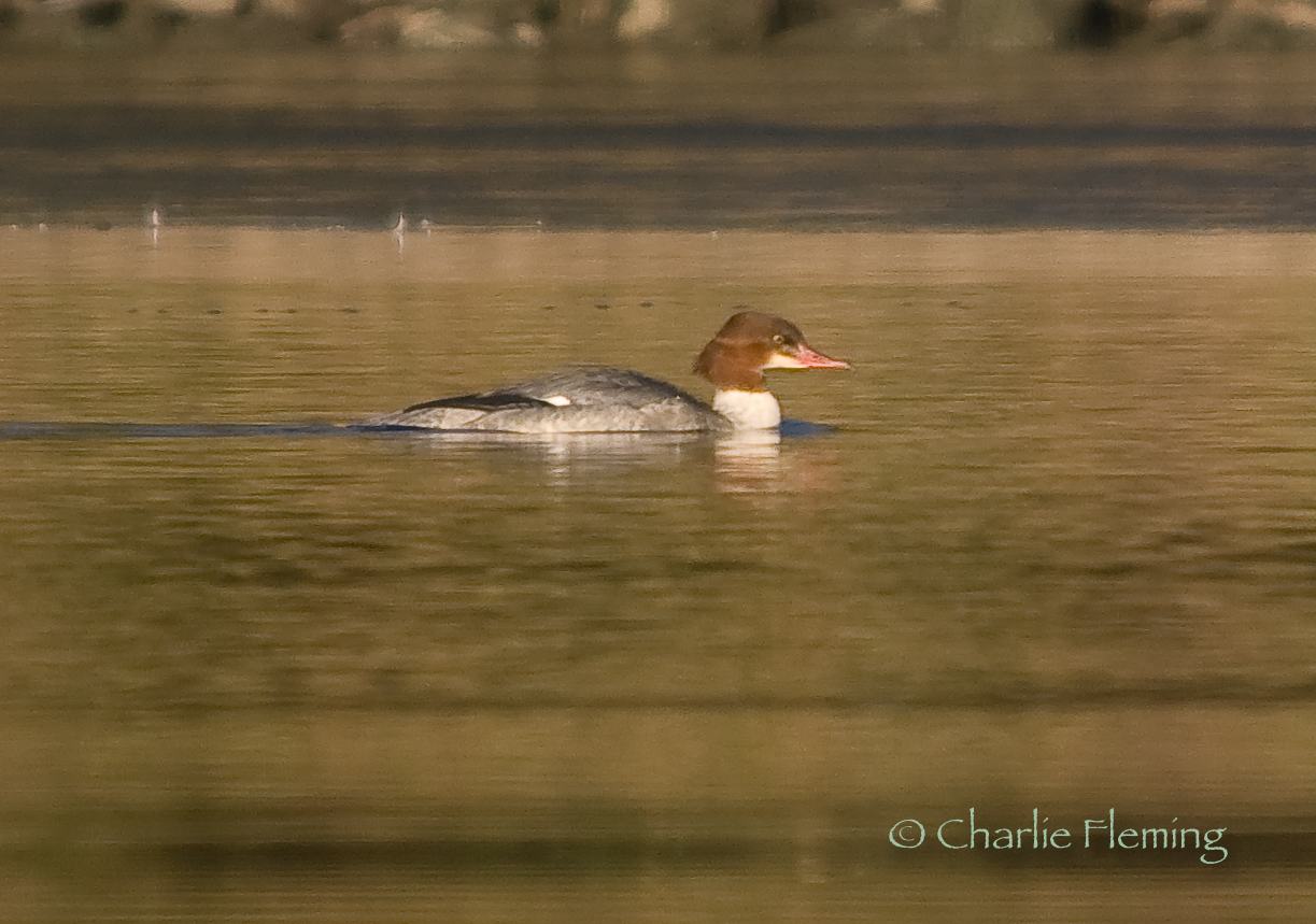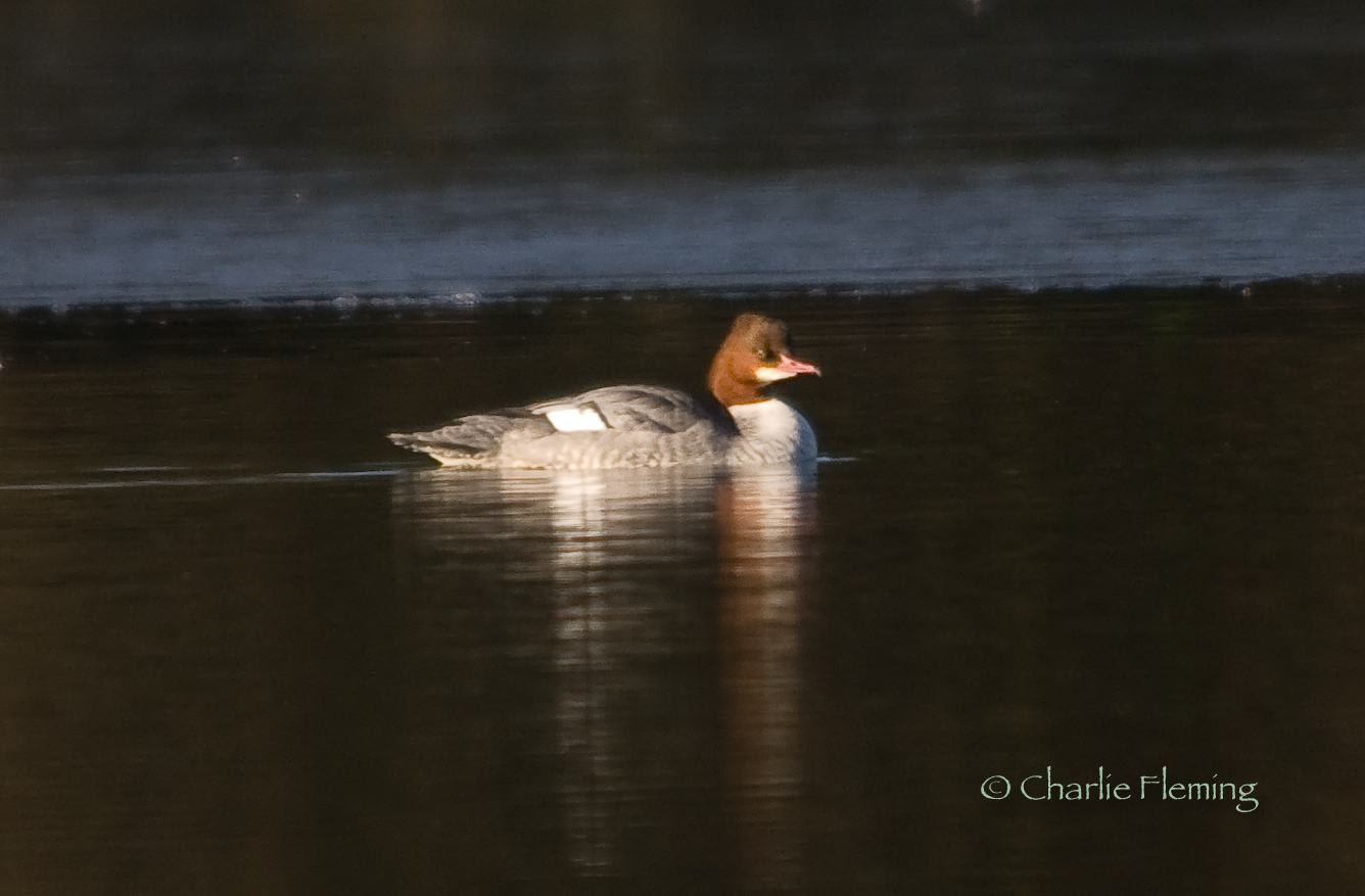 There was two Goosanders, both red heads and therefore either female, or possibly a female and sub adult male. At one point I saw them greet each other with a bit of head nodding so I would assume that one is a sub- adult male and the other a female. It was interesting to see them climb out of the water on to the ice. They were uncomfortable with this and kept falling and slipping so pretty quickly returned to the water.