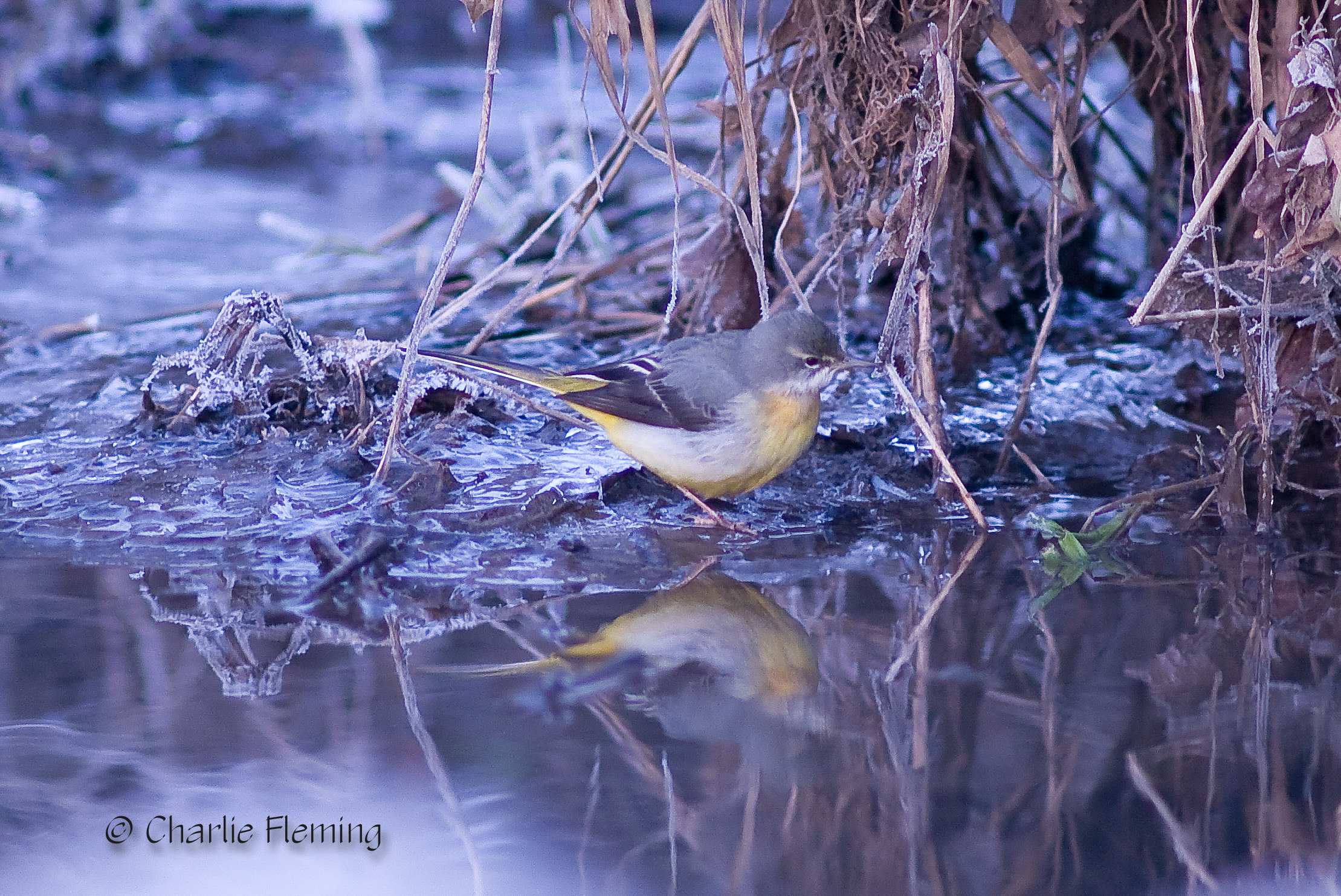 Finally today, just before the magnificence of the Kingfisher this morning I was pleased to see the the Grey Wagtail who has been with us for the entire winter, or at least until January. As soon as dawn broke he was on the hunt for food, I sure hope he found enough to sustain him through the night. But apart from that his appearance certainly made for a pretty picture with his reflection in the ice and the frosty surroundings.