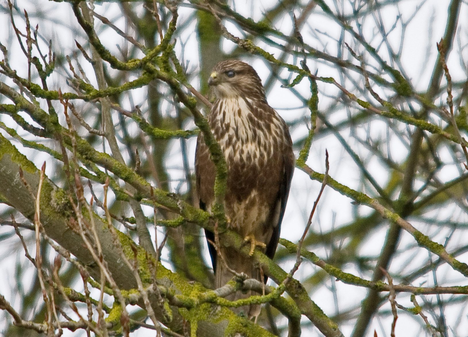 Eventually, after realising that even the garden Goldfinches looked dreary in this light, I went out for a walk to the opposite end of the brook, hopefully the Buzzard was going to be showing himself ….. or is it a girl? Well, it was there fortunately and it did interest me for an hour before the rain started to fall with those big heavy spots that soak you through in around 30 seconds. As soon as I arrived the Buzzard was in the air gliding and swooping from one of his favourite perches to the next. As I watched him it became obvious that he wasn't really worried, nor interested in me, instead he was peering intently at the ground and in hunting mode. Firstly he was on the railings by the overflow, then on the Railway lights above the track and then, just as quickly in to a tree to my left then back to the pylon, never still for more than a minute or two. At the Rabbit warren I caught sight of a disappearing tail and he had seen it as well. I suspect that he feeds on these Rabbits whenever he gets the chance and as soon as I manage to get hold of a dead rabbit from a friend I will 'bait" him. His reward will be free rabbit and in return I get the photos I want.