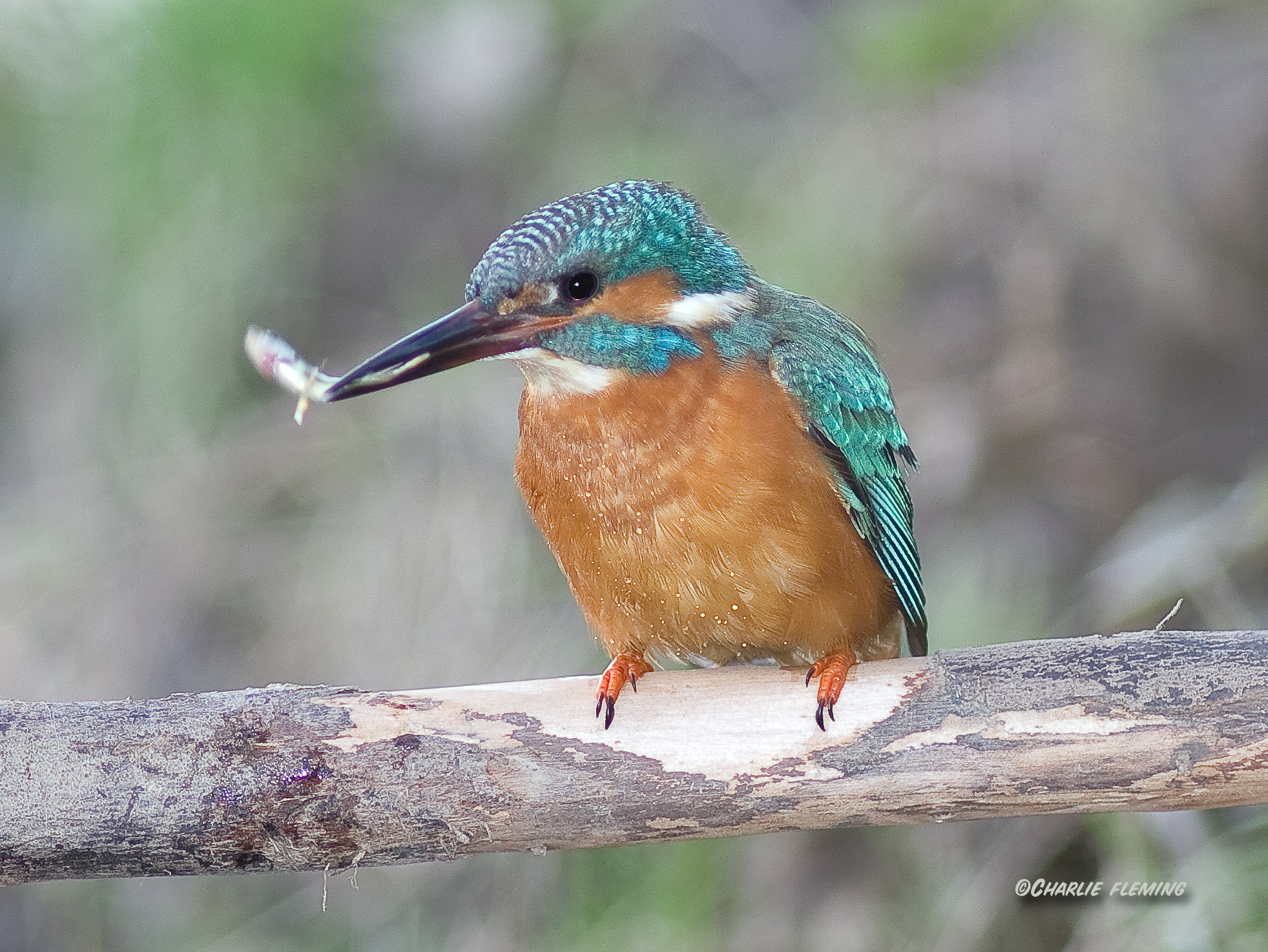 It was after 4 when the male Kingfisher first showed himself. I always get a buzz whenever I see him and I pretty much know exactly what he is going to do now. I have learnt almost every aspect of his behaviour. I watched him fishing but he was just a little bit too far upstream to get photos. He was scanning the water from about 3 foot above, perched on bank-side vegetation . I saw him dive and then return to his perch with nothing. I had him fixed in my viewfinder as all this went on. Suddenly, he wqsn't there any more, then I saw him. He was flying downstream towards me, very quickly with the fish he had just caught! He zoomed in and landed on the nearest branch to me. It was getting a bit too dull for photography so I used the cameras flash and got a couple of half decent images.
