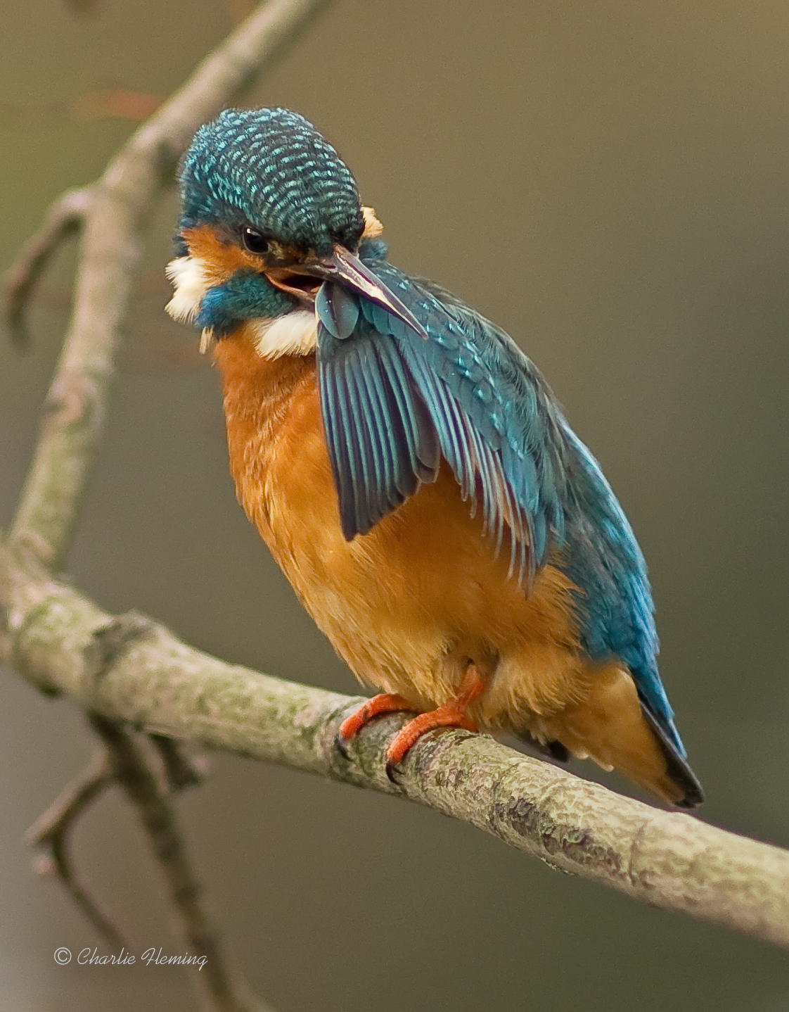 After he had eventually swallowed the fish, and it always happens this way, he turned his head and was stock still for a second or two, and then he opened his mouth to properly get his meal down. I snapped the shutter and got this lovely photo which is so full of character. This could be presumed to be an aggressive posture to another Kingfisher but this is not the case.