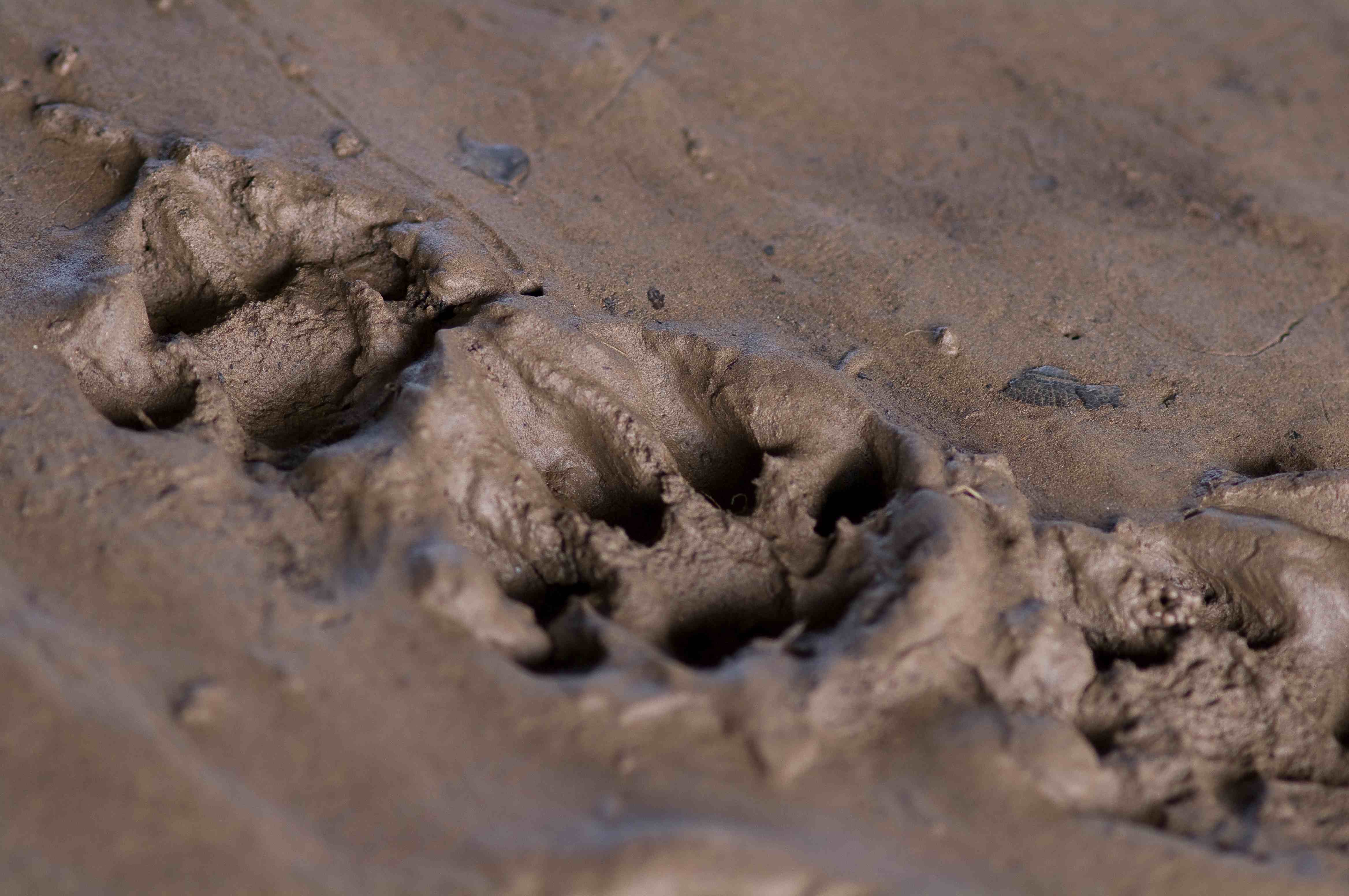 All of these tracks are made by the otter, the disturbed mud is the heap prepared by the otter and the footprints are otter tracks.