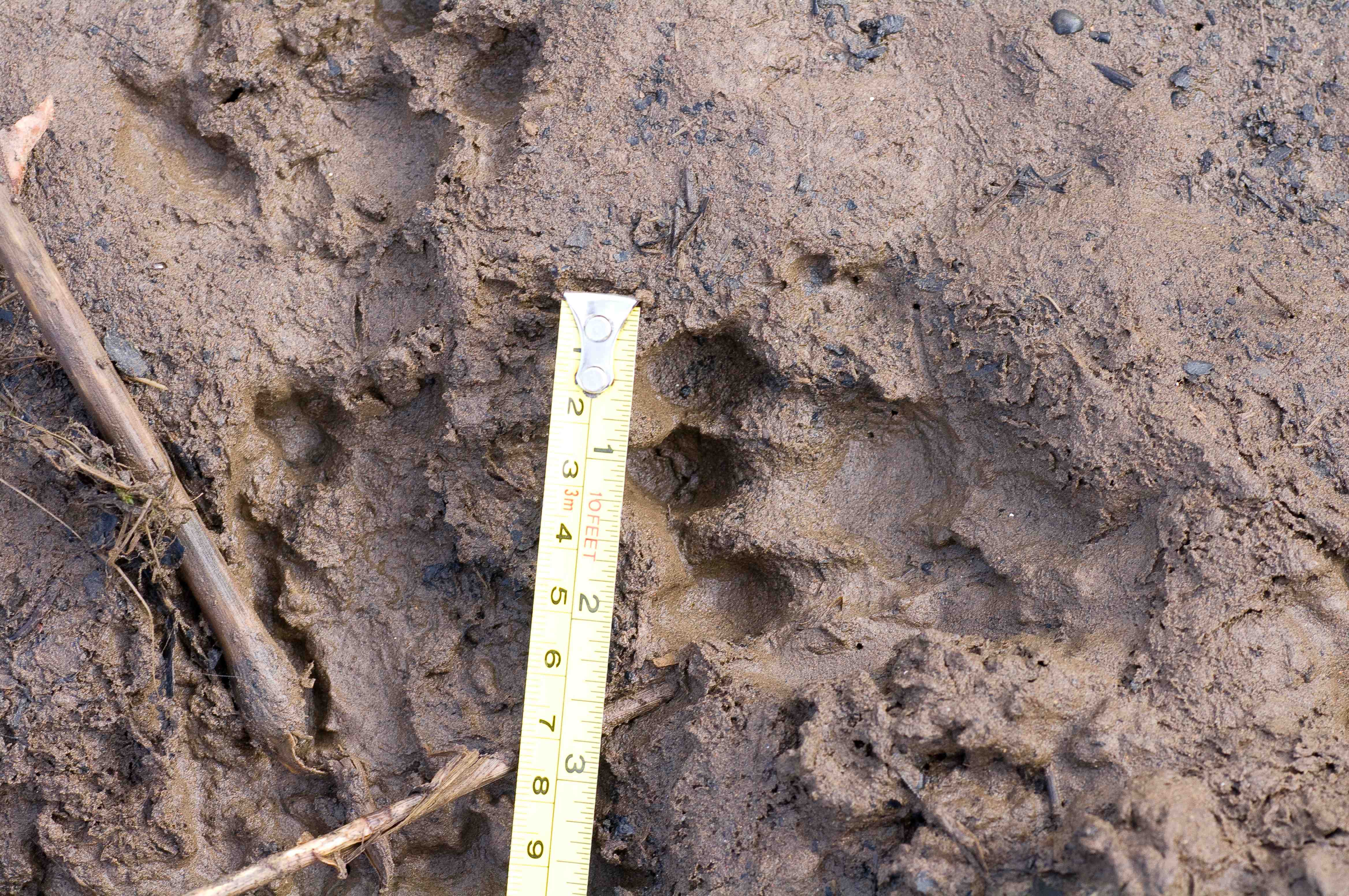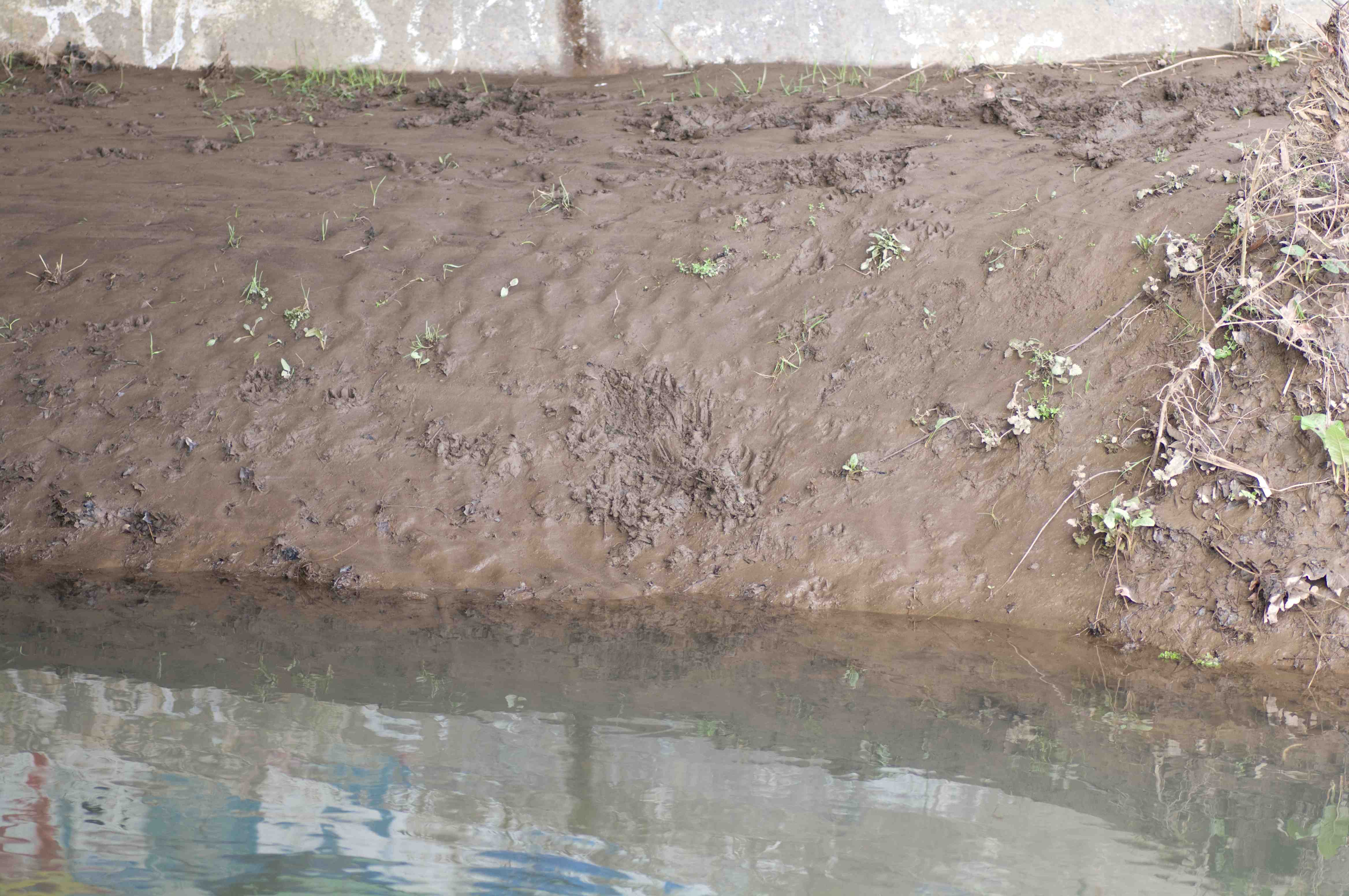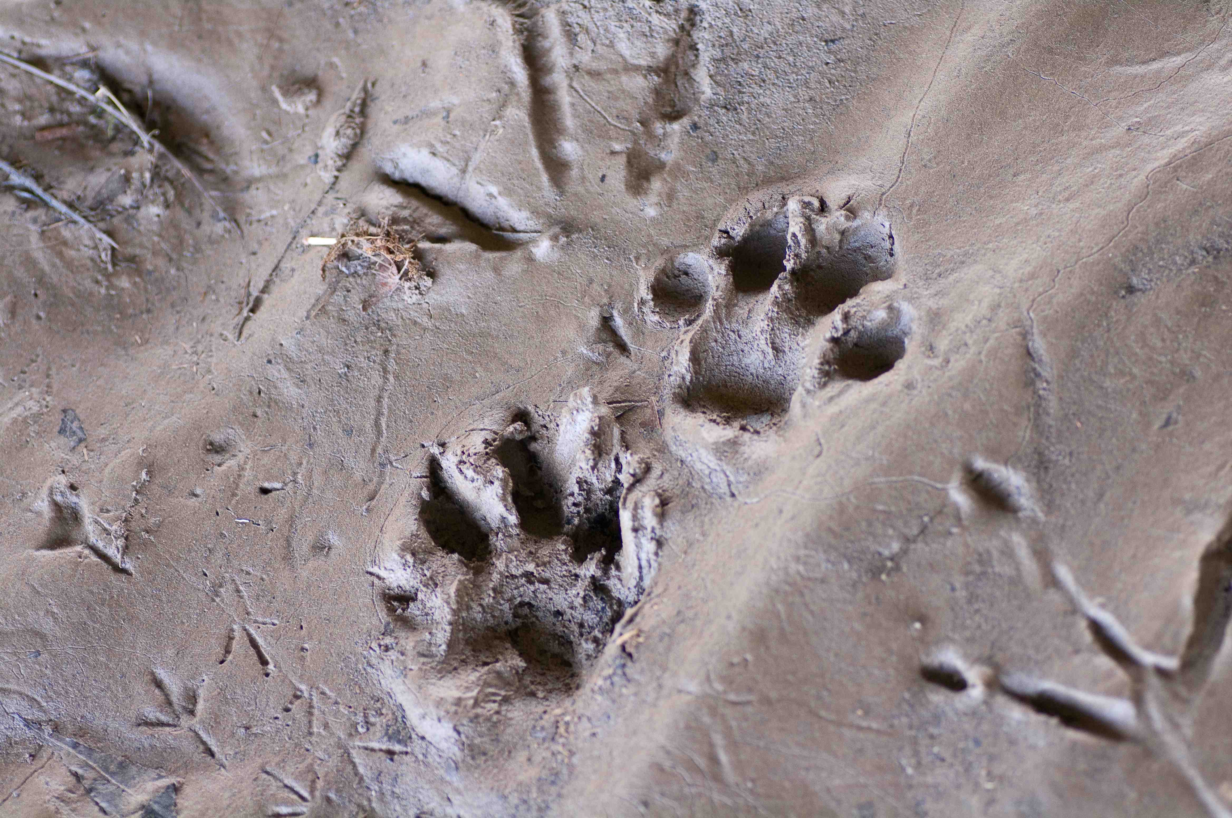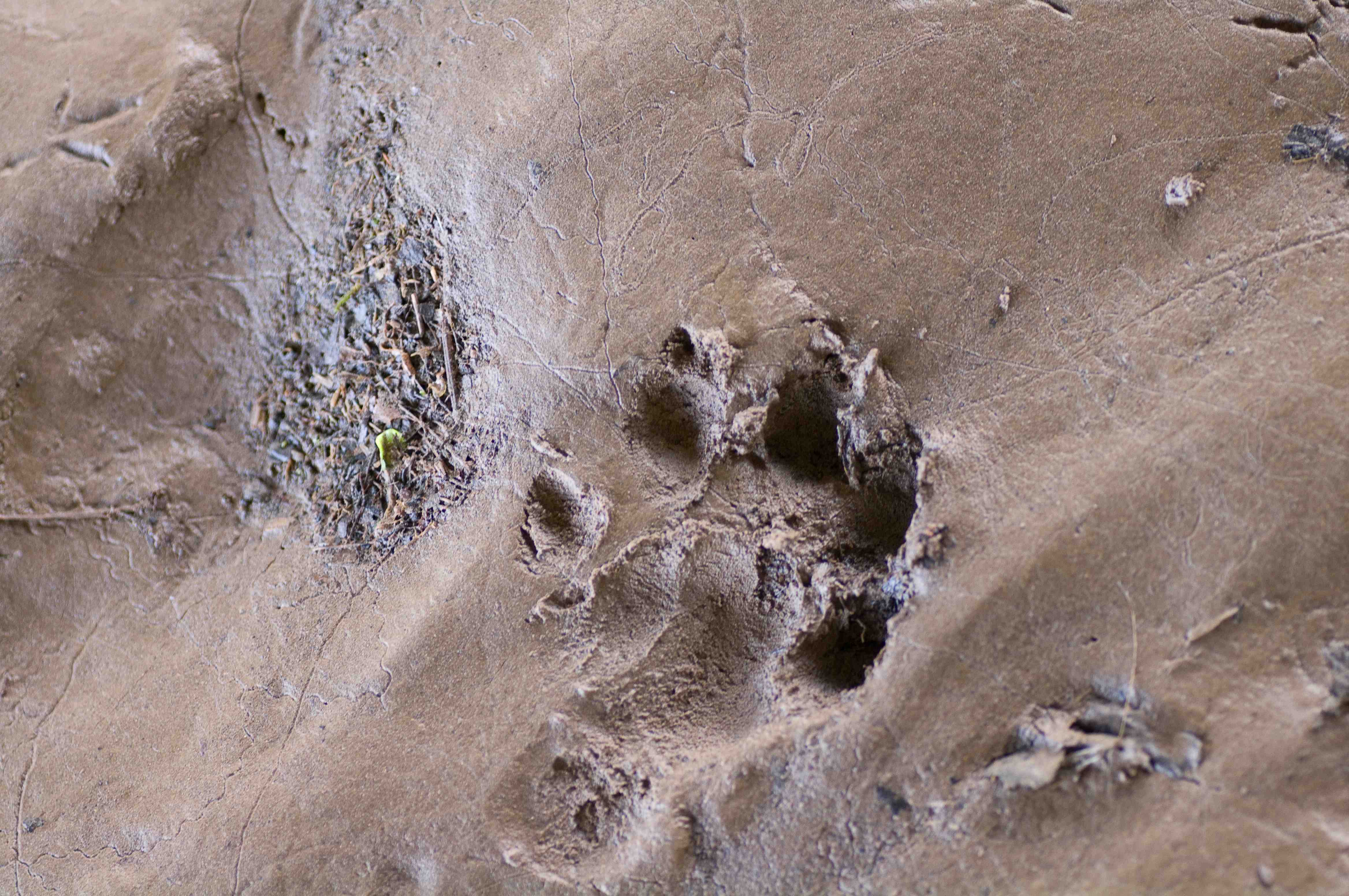 This print left in the mud under the bridge is about as clear as you could possibly get. It shows a right hind foot. You can clearly see the heal, the bottom of the foot and 5 clearly marked toes as well as nails.