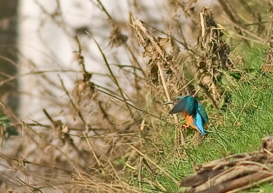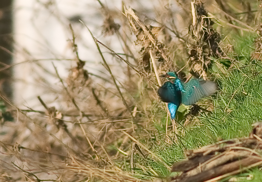 It started with a quick look at the Brook, hopefully signs of Otter would be found if the water had gone down enough and thankfully it had. I arrived at 1030 and had a look around but couldn't see any new tracks, probably because the water level hadn't gone down until after daylight. It was a beautiful bright day and I could see the Kingfisher working hard, but nearby, to catch his quota for the day. This was too much to resist because he was really intent on what he was doing and allowing me to get very close. At one time he perched on my hide as you can see. When he had moved off to a safe distance I sat in the hide and waited for him, hopefully to come to his favourite perch, but I had got a boot full of water and 25 minutes was all I could stand.