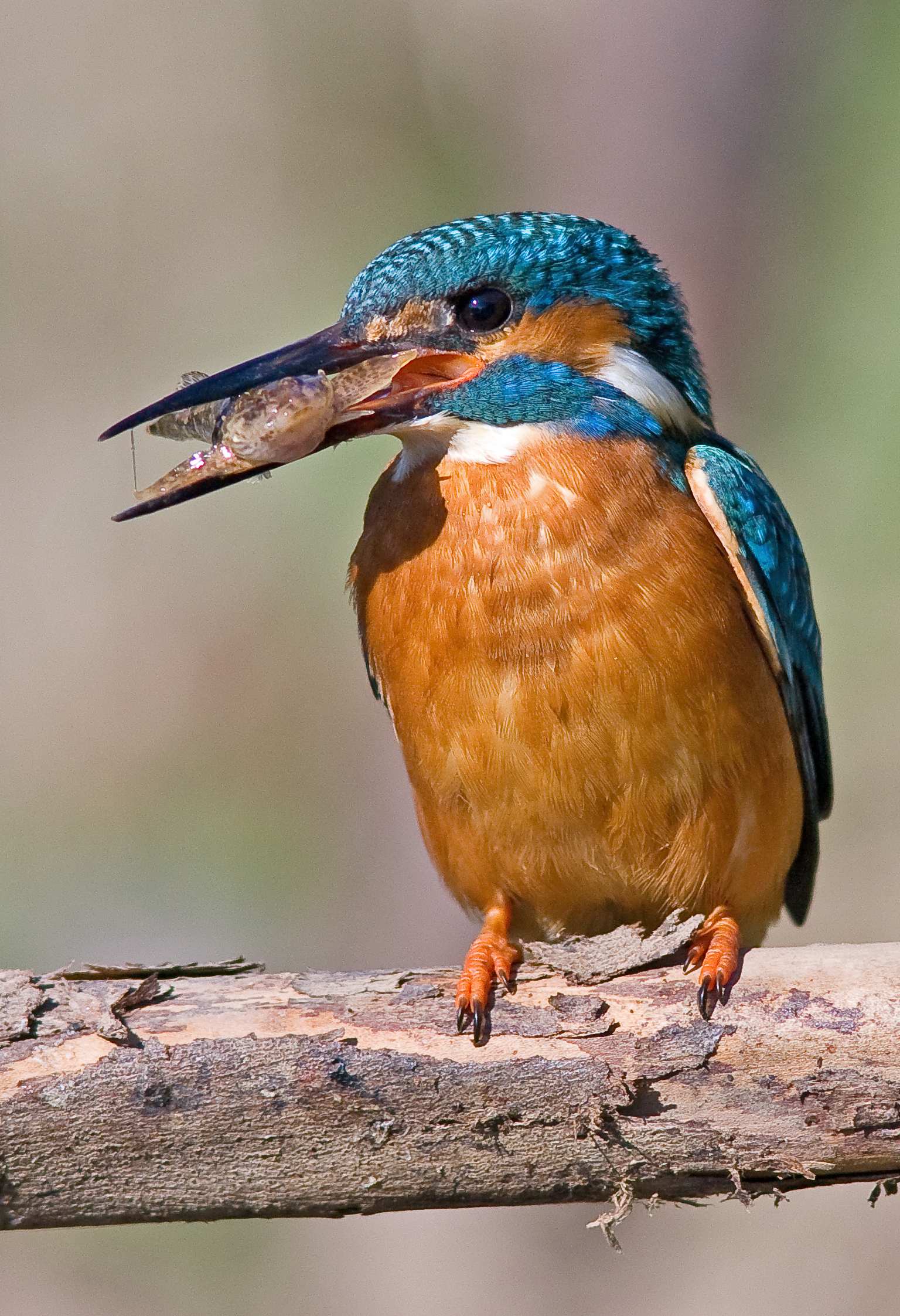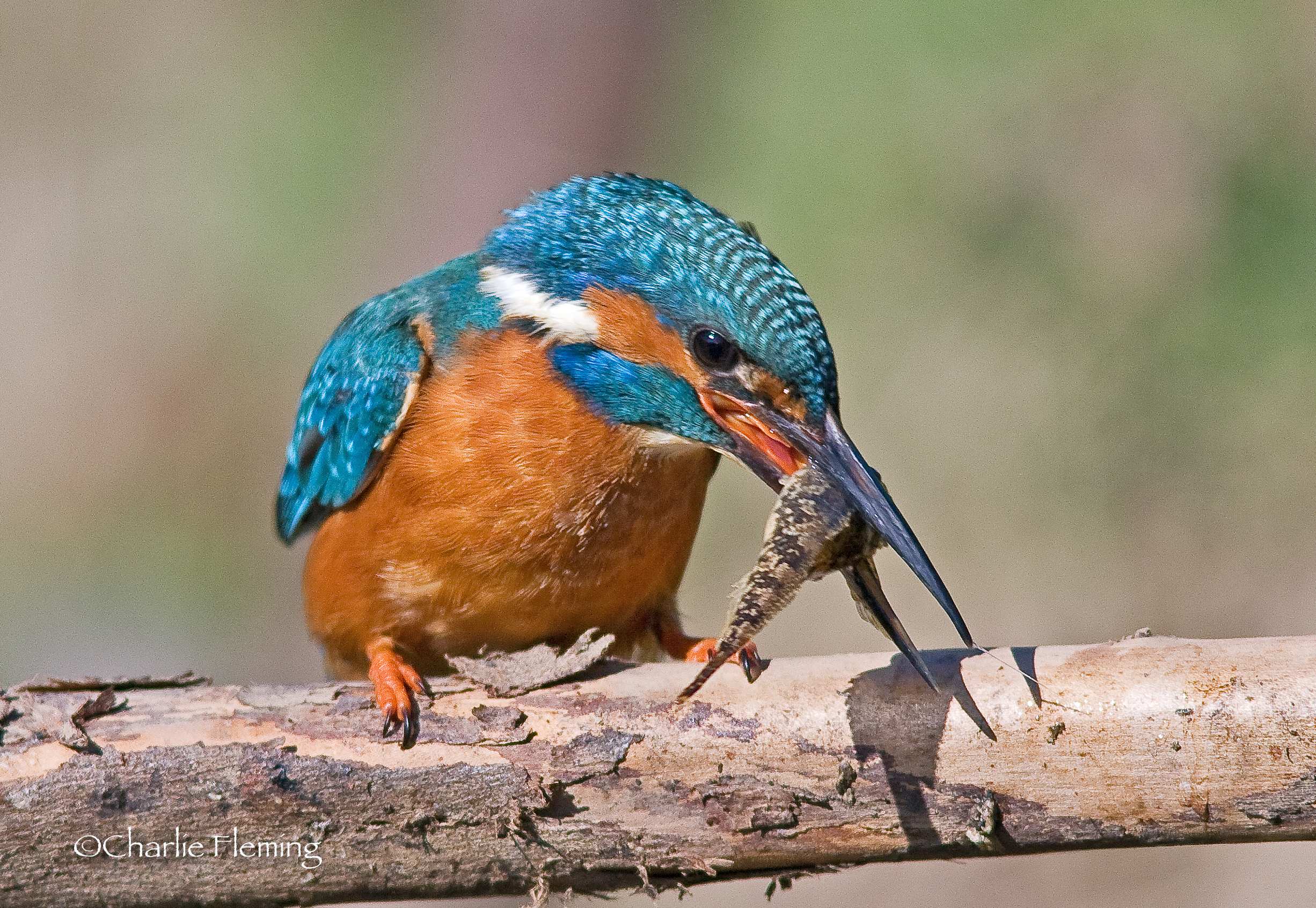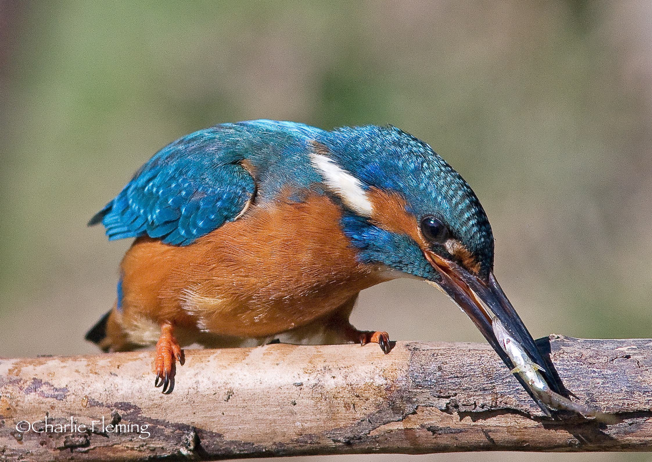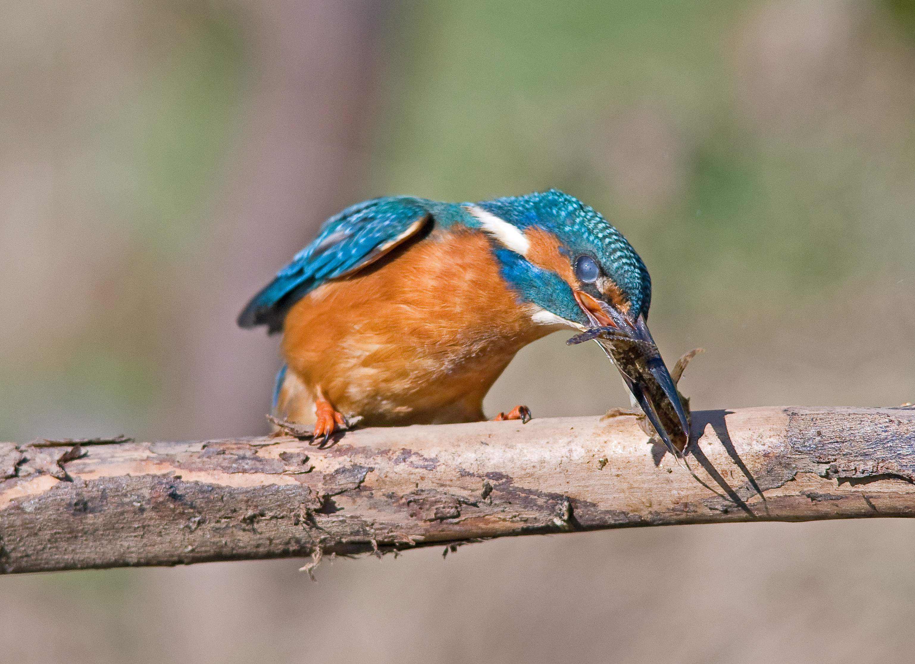 I wouldn't for even a micro second, say that this is a perfect shot but its one that I am very pleased with. I took it this morning, the light was good and he came to 'my" perch quite quickly. Previously though, he had been close, perched in an exposed position looking for prey. A Wood pigeon flew over and really spooked him and he flew off in a panic calling wildly. The sight of a big bird so close to him had given him a shock and I suppose he thought it was a Sparrowhawk. This is the first time I have heard him make a sound since last autumn. I still haven't managed a good in flight shot yet which is what I am after. In the picture above he has got a Stickleback which he is beating against the perch to swallow so I am pleased that I managed to freeze the action. In the picture below he is dealing with a Bullhead and the action has not been frozen quite so successfully.