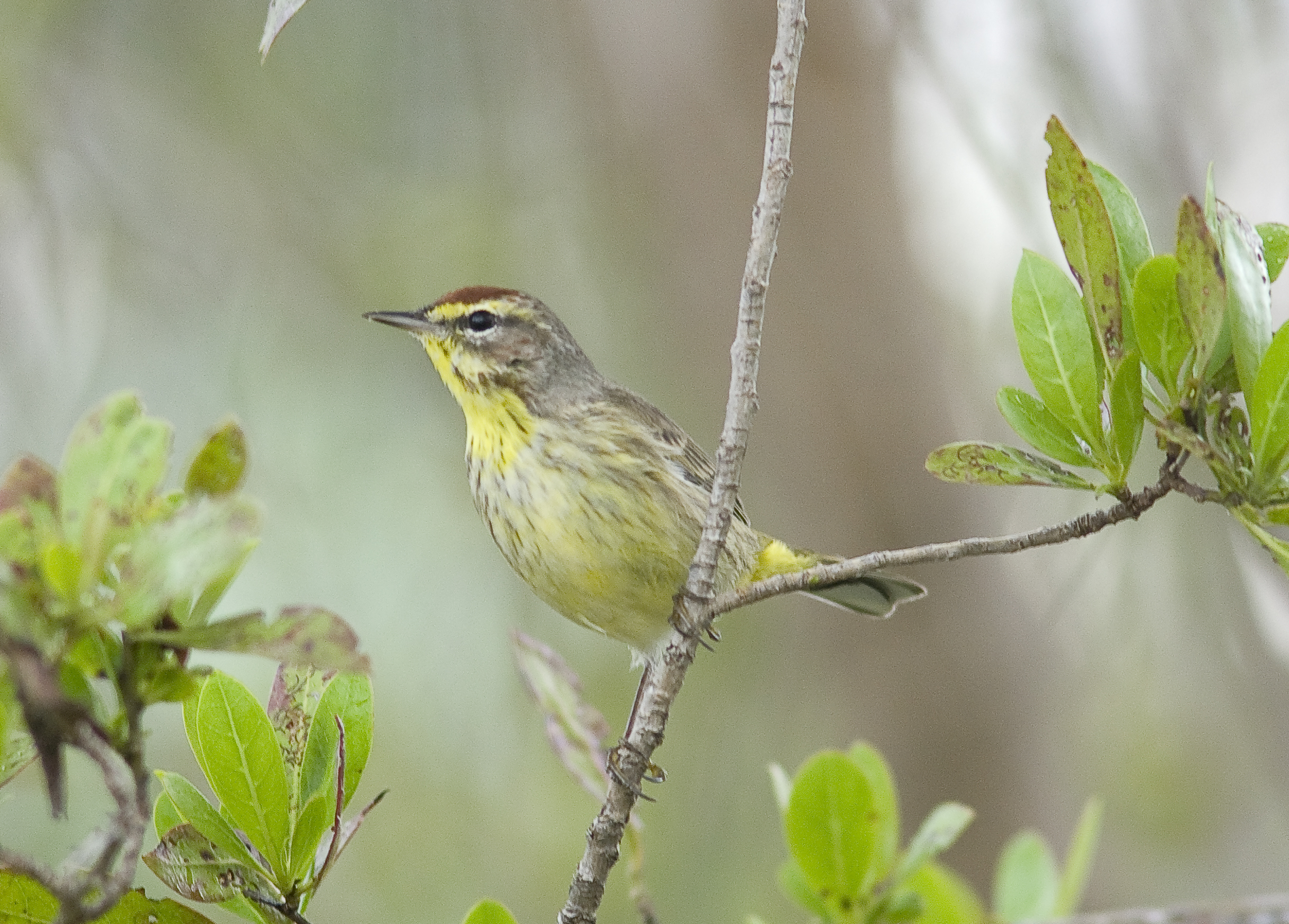 Palm Warbler - Dendroica palmarum are lovely, lovely little warblers that I see regularly in South Florida, by comparison with other warblers in the USA they are not the most colourful, but compared to the warblers of the UK and Europe they are positively exotic. This morning I returned to what is my "local patch" when I am here. The Broward County Audubon Society mention West Lake Park as the "Park with no birds", but I dont know where they have been looking because I find it teems with birds! At dawn the weather was dire and it was less than the usual 70 degrees and wet, hardly the best photo conditions. I went out without great expectations, I needn't have worried. My tally included Blue Jay, Yellow Bellied Sapsucker, Palm Warbler, Pied Billed Grebe, Red – bellied Woodpecker, Common Yellowthroat and some interesting close ups of Turkey Vultures. Then later this evening I saw much the same as well as a very interesting close up view of a small hawk. I was creeping towards a Palm Warbler when I decided, and I don't know why, to look upwards and there, at the top of a ten foot tree was a hawk, probably a Sharp Shinned Hawk.