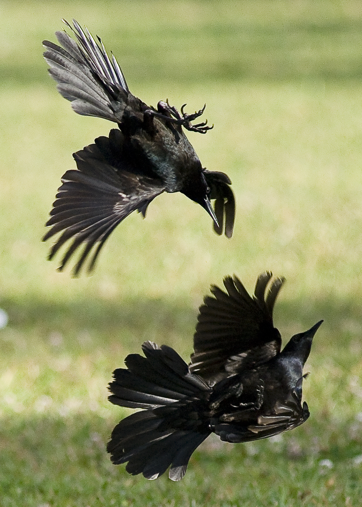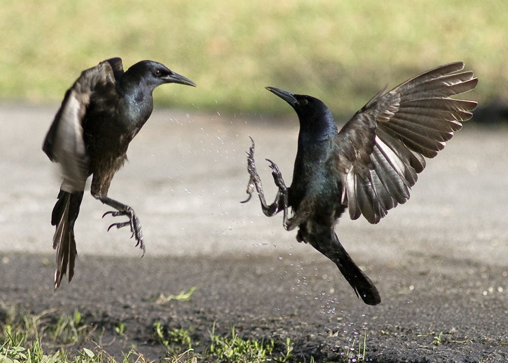 This morning the Grackles were performing in a very entertaining way. I sat and watched them going about their business, feeding and squabbling as well as displaying to each other. One particular individual took a dislike to what I assumed to be other males and proceeded to engage in some acrobatic stand-offs. This gave me some great opportunities for real action shots. Grackles to me, are synonymous with South Florida. They are noisy and very noticeable and their songs, calls and clicking "shouts" are very exotic to me. Whenever I hear them I am reminded of all the good natural experiences I have had here.