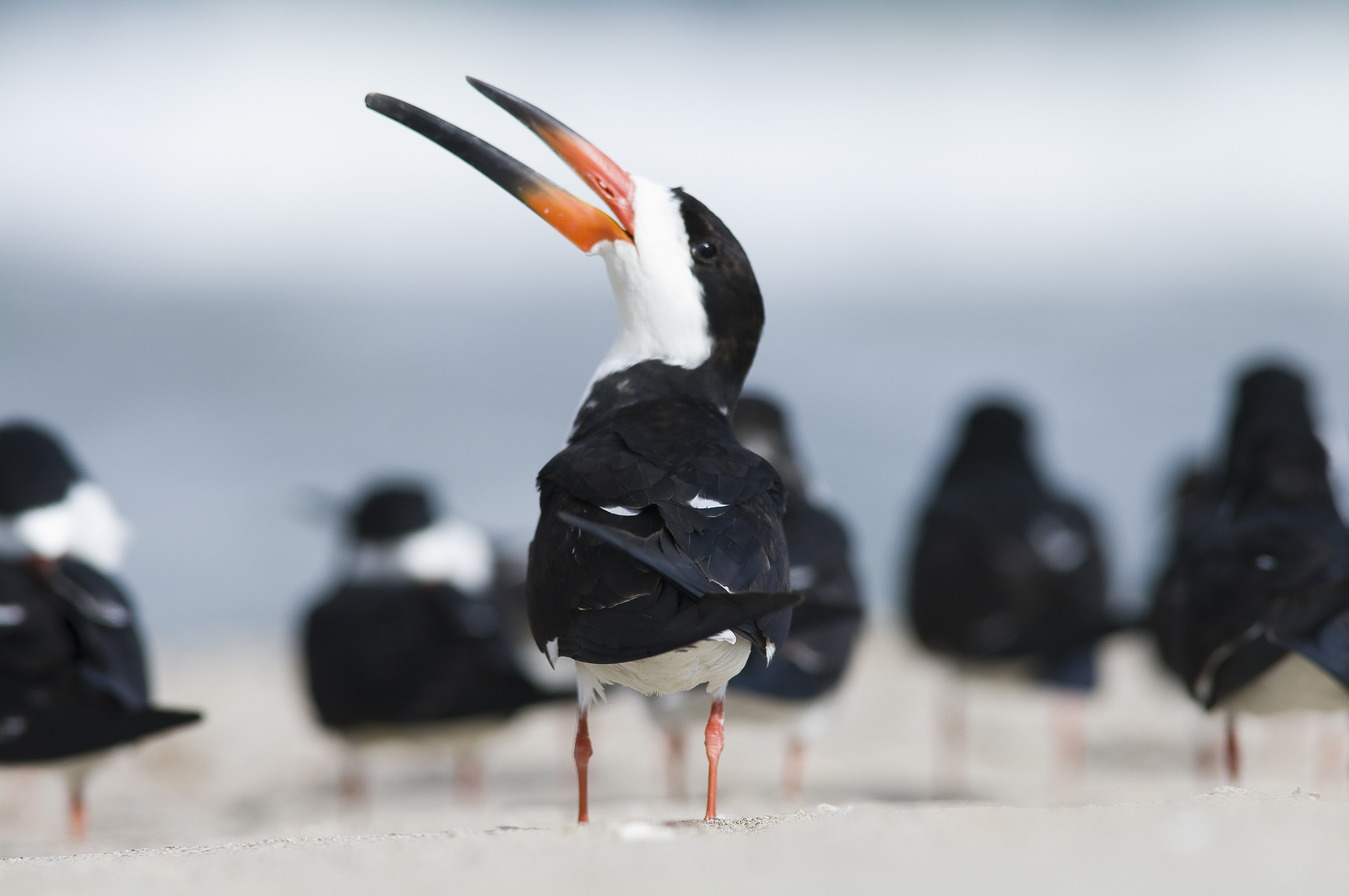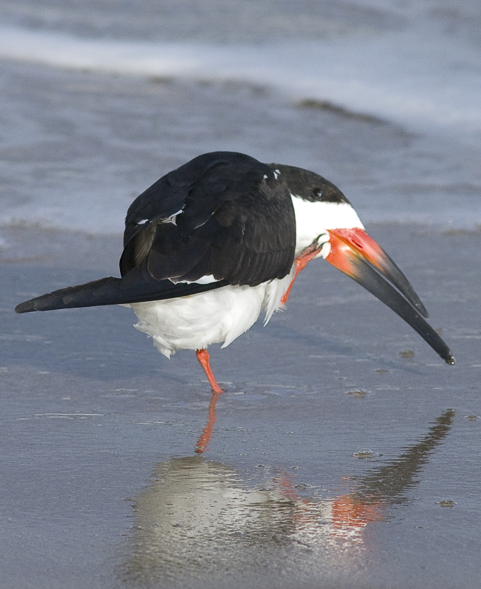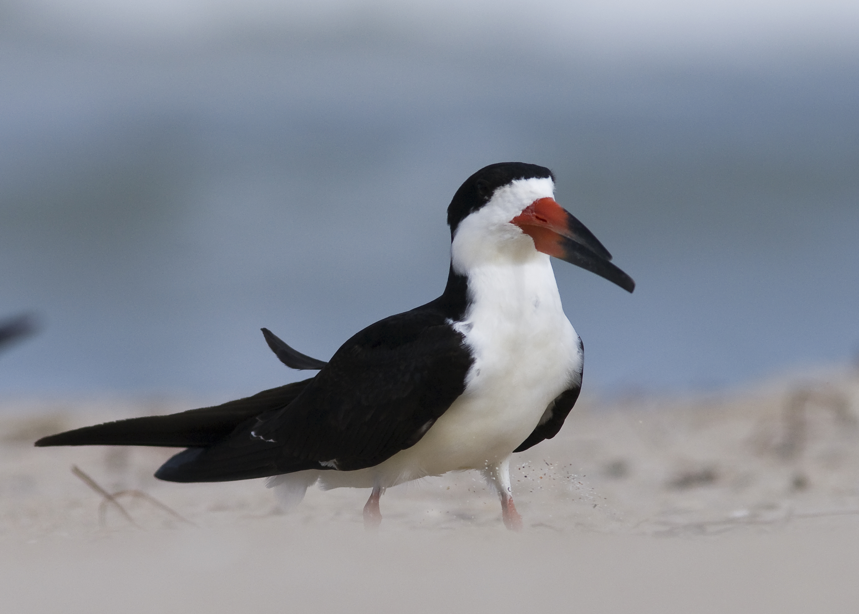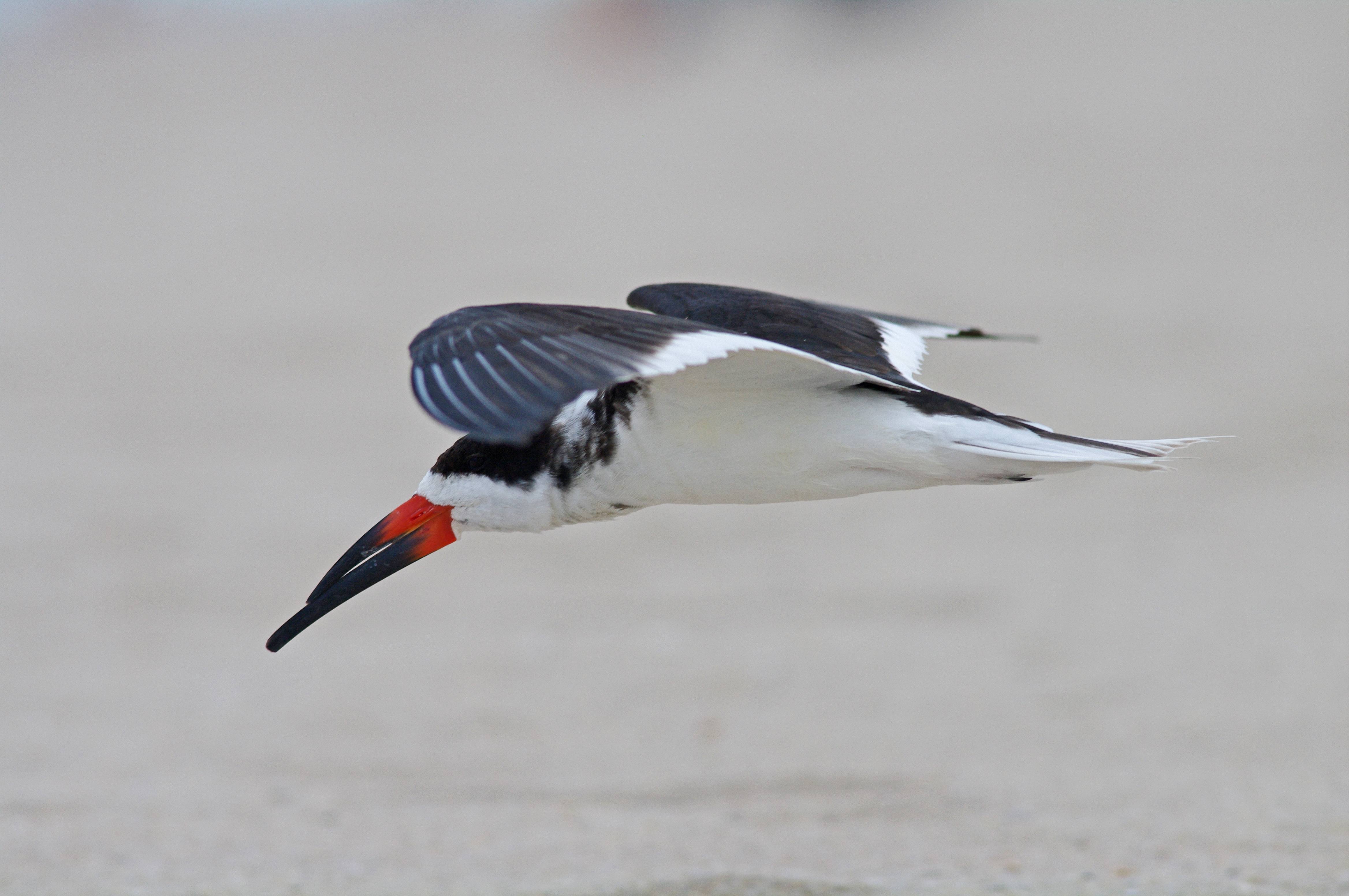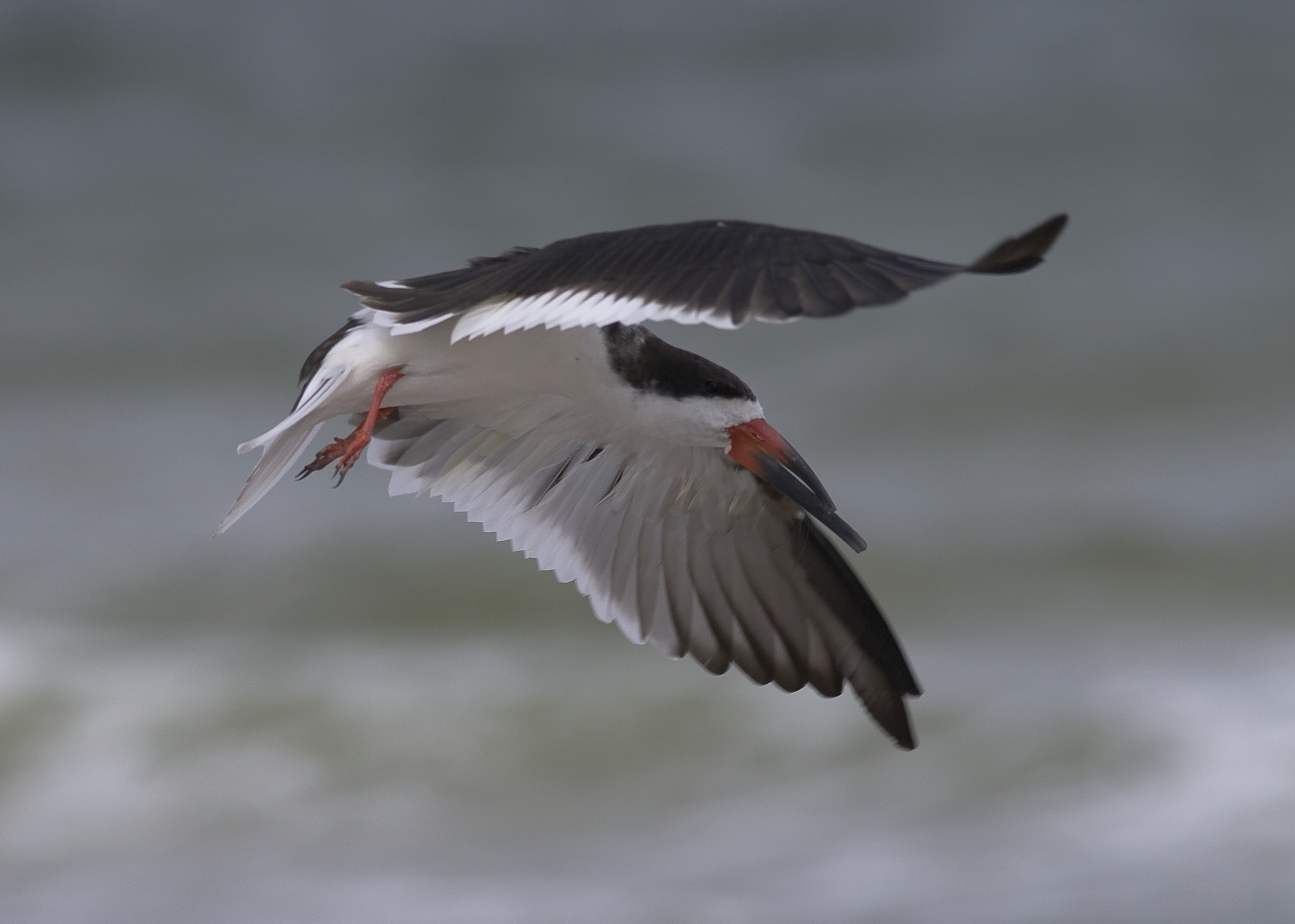We returned o the beach at Pompano yesterday, I needed to try for more, and hopefully improved pictures of the Black Skimmers. Now the Easter break is over the beach was much quieter and consequently the Skimmers were sitting just above the surf in the company of Royal and Sandwich Tern. They were a real spectacle with their stunning black and white plumage contrasting with the enormous black tipped reddish beak. From time to time when slightly disturbed or just whenever they felt like it they would fly around us at tremendous speed in the breezy conditions. Using a commando crawl on my elbows I got quite close to them and got some great shots and lovely views.