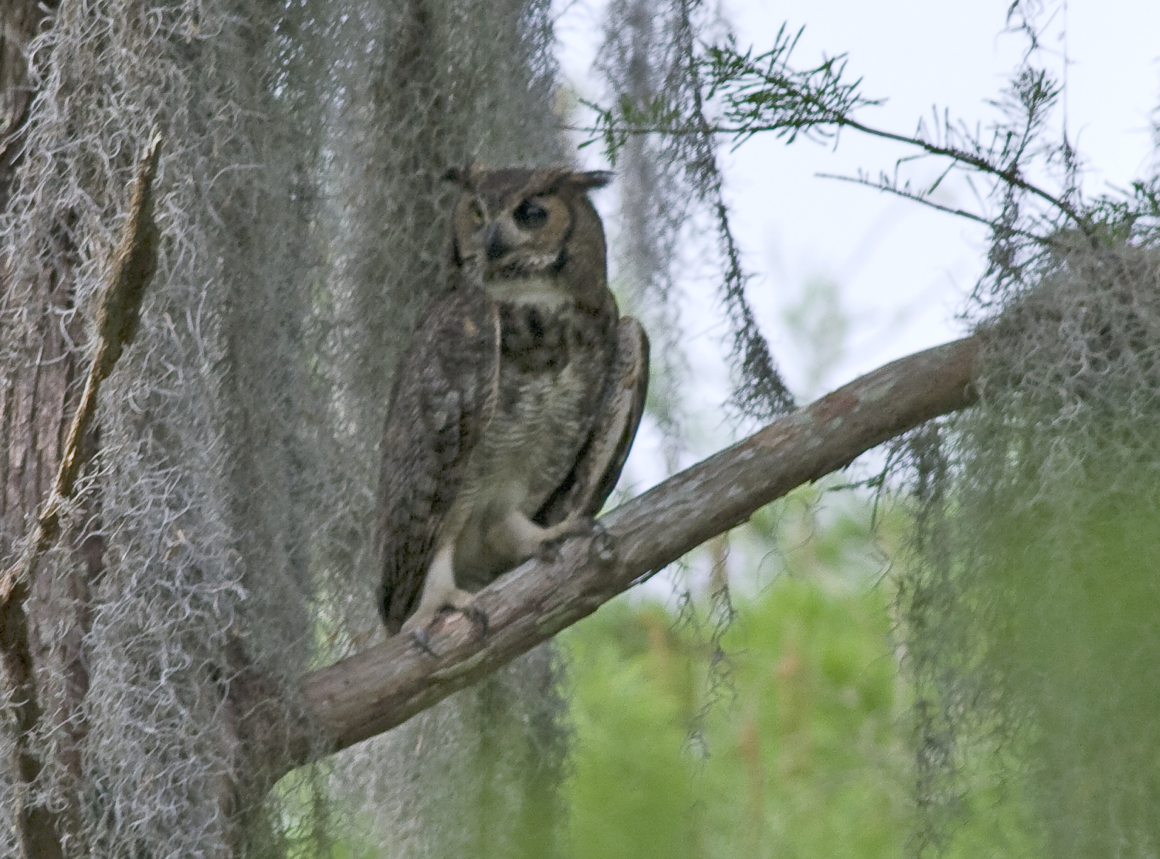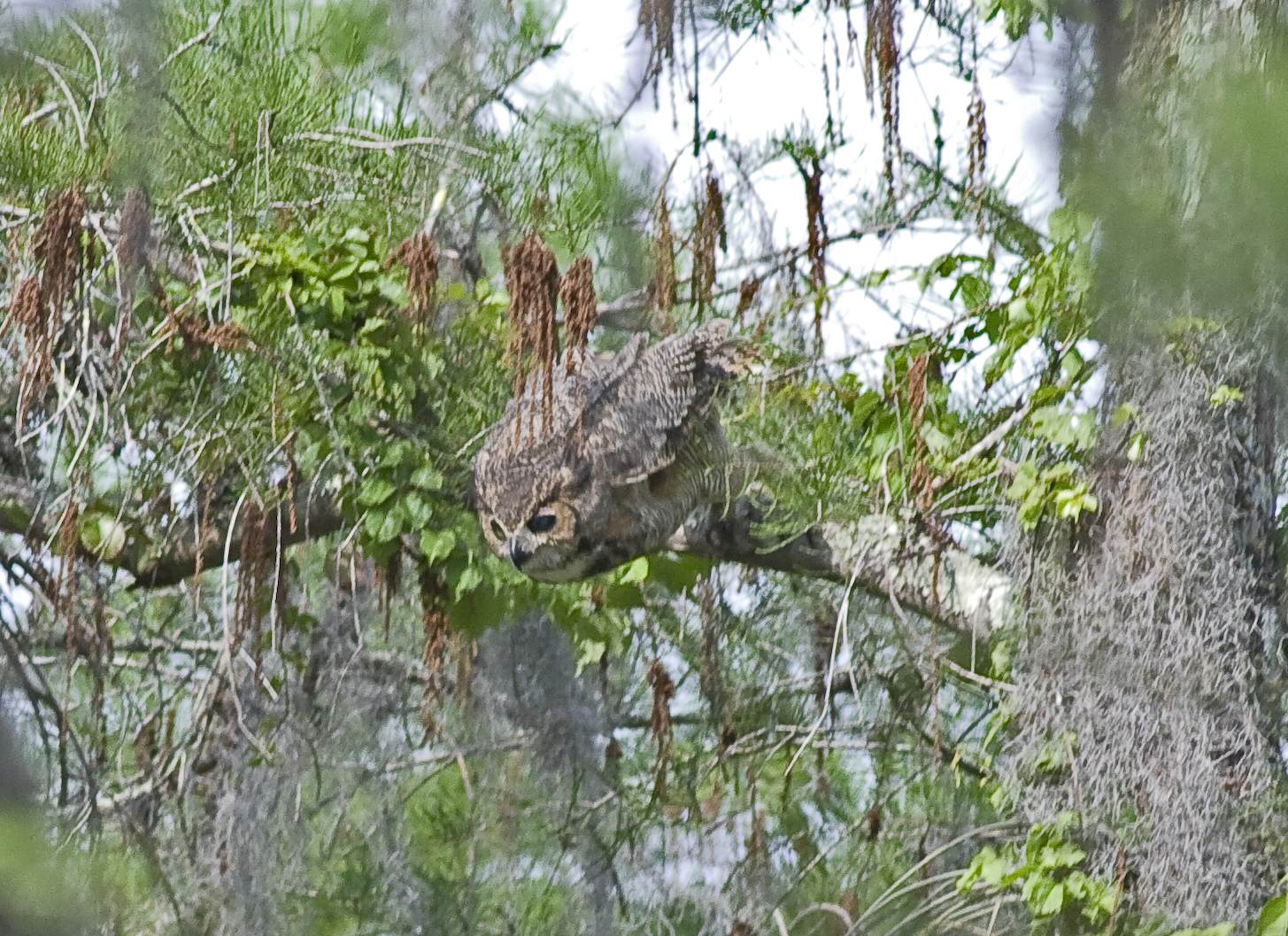 We decided to visit Loxahatchee Wildlife Preserve, north of here on State Rd 7 AKA 441. It is described as the most northerly remaining remnant of the Everglades. The attraction was going to be a nesting Great Horned Owl, North America's largest owl. After some difficulty in finding the nest, even though we had been given good directions, I was disappointed to discover that the young owlets had fledged the nest only the day before! Can you believe that for bad luck? Anyway, to cut a long story short, one of the youngsters was still around as well as both adults. It was hot, very hot………… well in to the 90's and humid. The mosquitos were attracted to my damp puffy white, obviously tasty flesh. I suffered for my art as I tried to get some shots of the owls perched high and a little too distant for a good photo. But perhaps that wasn't the point because this was a lifetime first for me and a big thrill. The bird and Spanish Moss in this photo really did make an attractive photo if not the most technically perfect shot I have taken.