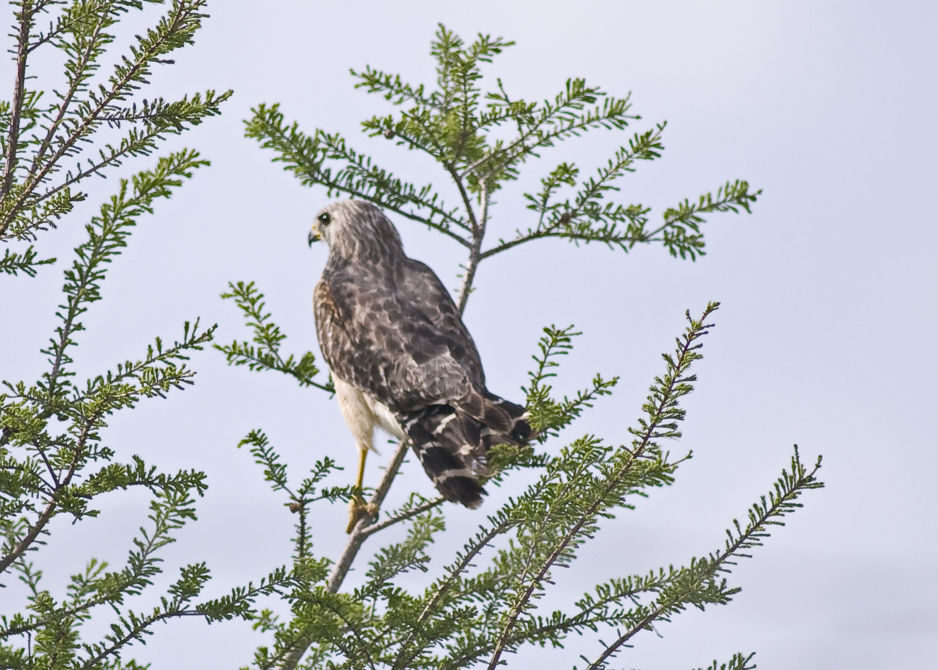 As for the Hawk at above. As we drove up the road inside the reserve this bird was perched in the trees by the roadside. It was lit beautifully by the lowering sun and was not in the least disturbed by the car (and us) only 10 feet away. I had time to lower the window, grab the window and back the car up in to a more photographically perfect position. As Jenny passed me the camera I prayed that it remained and I had time to take a few shots and realise that my camera settings were wrong, re-set the camera and get some good shots as you can see. After a while he drifted off to a bush on our right and now, not in such a good position, I took a few more photos showing the birds back.