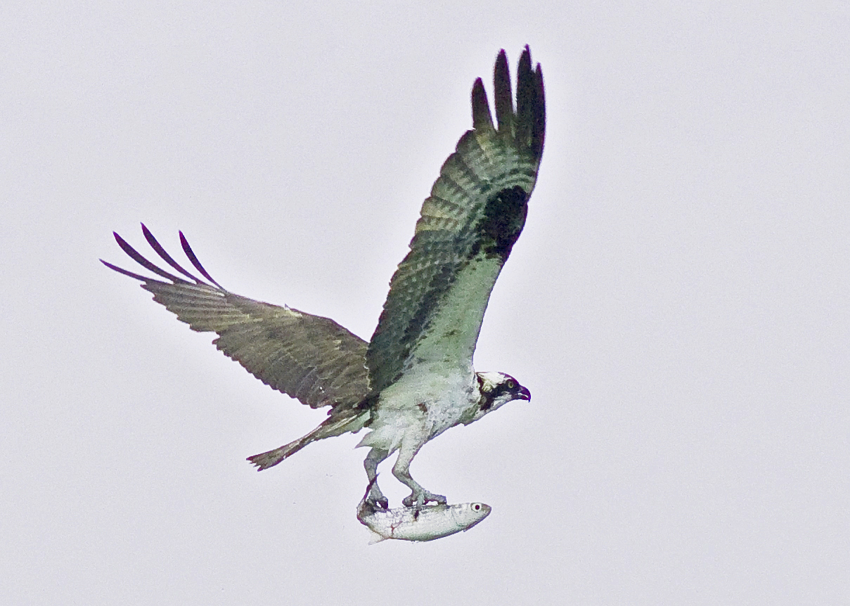 He hovered overhead trying to spot a fish, suddenly he closed his wings and went down in to a dive to emerge with a massive Mullet which he struggled with as he flew in front of me.