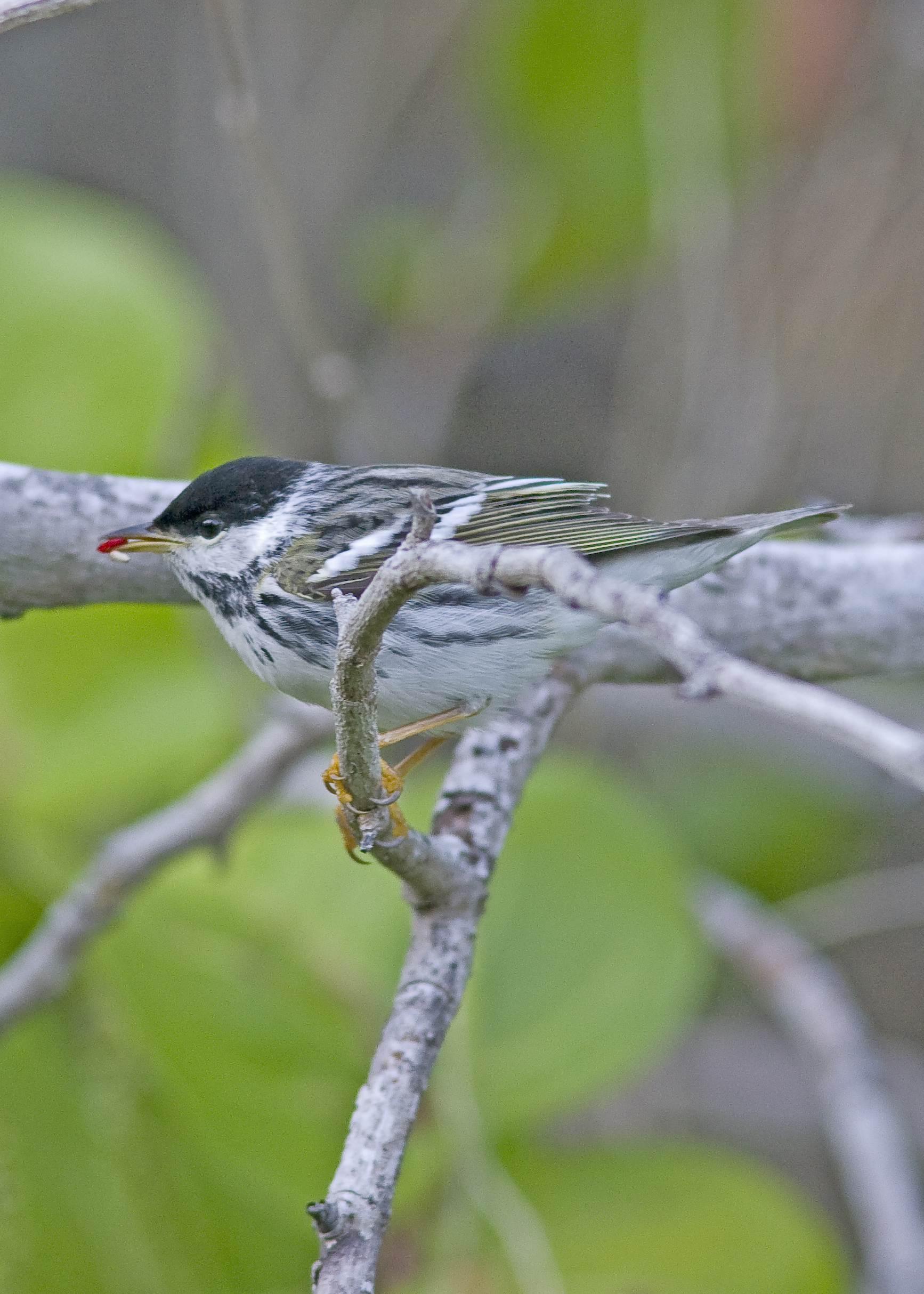 The park has also had some nice warblers in the last few days including Blackpoll Warblers, small well marked birds on migration from Brazil. They have yellow legs and a solid black cap, hence the reference to "pol" which refers to the head. Their diet includes berries as you can see in this shot.