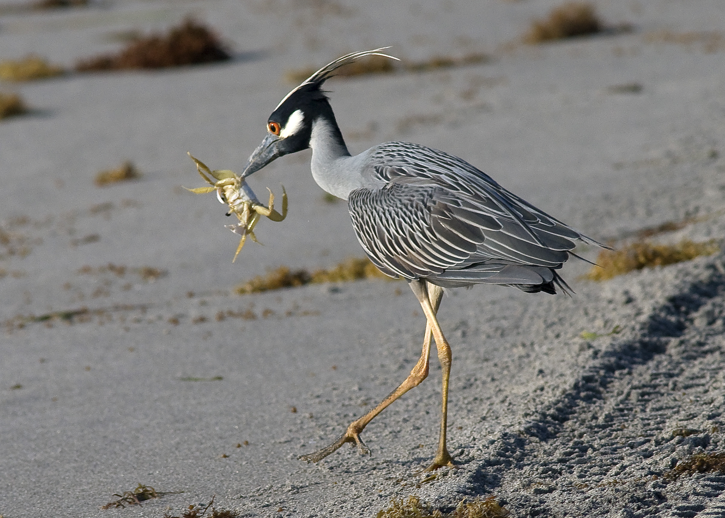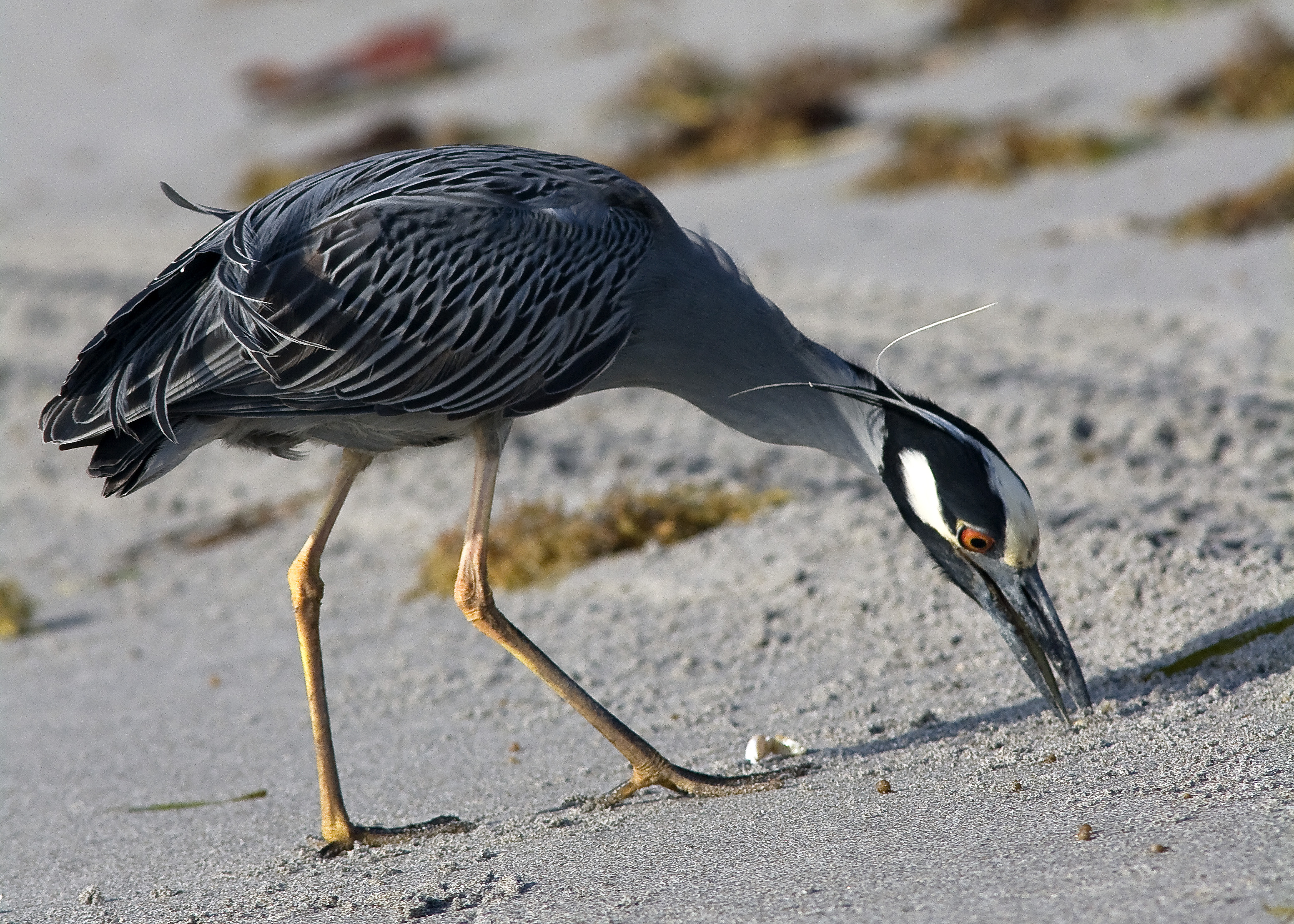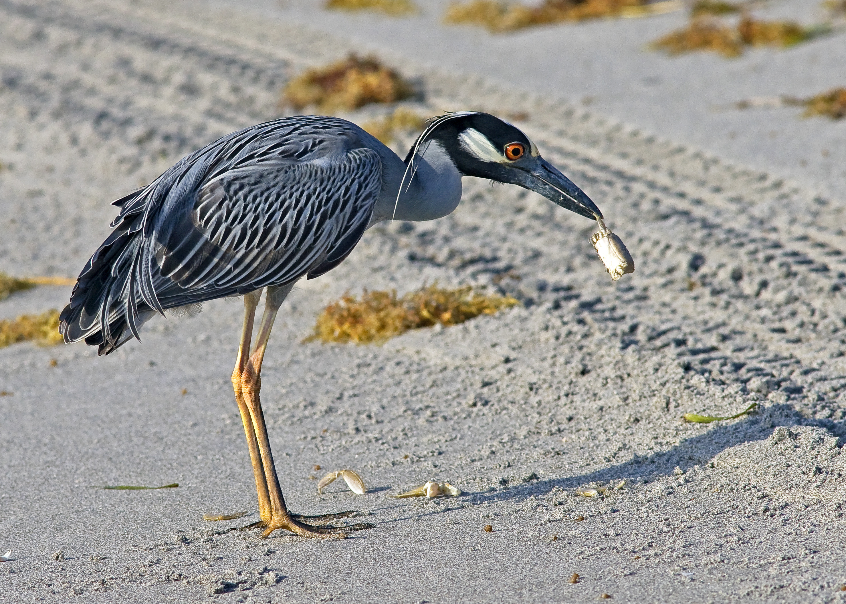 I had an interesting "meeting" with a Yellow Crowned Night Heron this morning. Arriving  at 8  in goodish light,  there was an on-shore breeze that had littered the beach with all kinds of debris including planks of wood, toothbrushes and loads of waste plastic amongst the seaweed. It is distressing to see this day after day, and it never ends no matter how often it is picked. It is a real insight in to the mess our oceans are in, worldwide. Here we are, close to the Gulf Stream, adjacent to the tropics and all the exotic beauty that that offers, but the dark side is the tons of plastic waste waiting to wash up on the worlds most beautiful beaches. The damage is done………….. we have to live with it now.