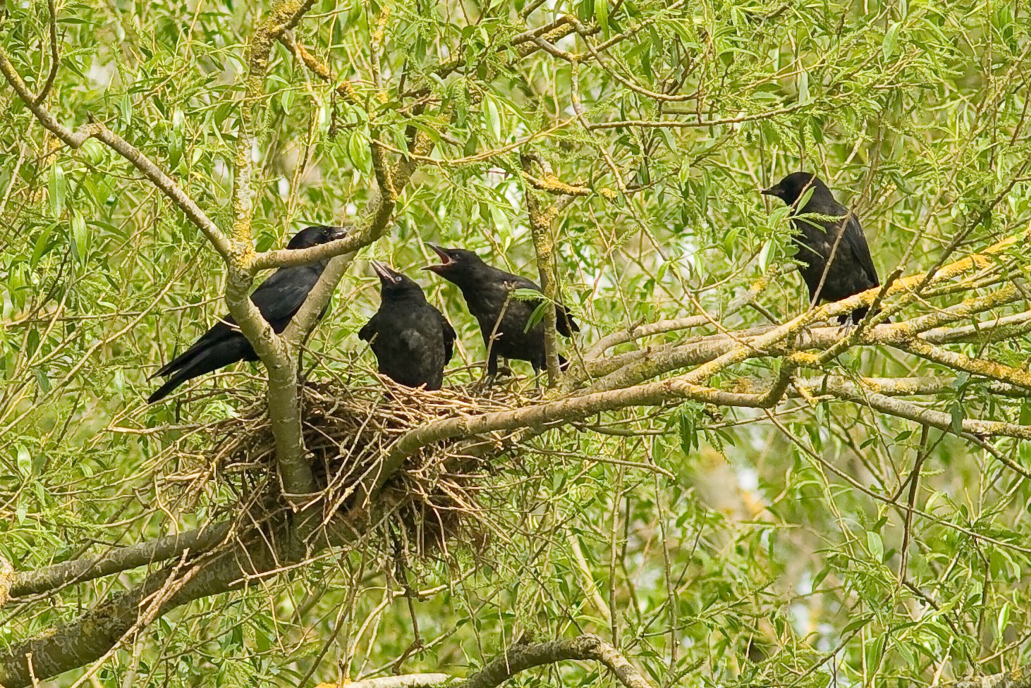 A Carrion Crow has a nest nearby and I took some shots of 3 happy youngsters, almost ready to fly sitting in, and around the nest high in an old willow tree over-hanging the water. About as safe a nest site as they could have chosen.