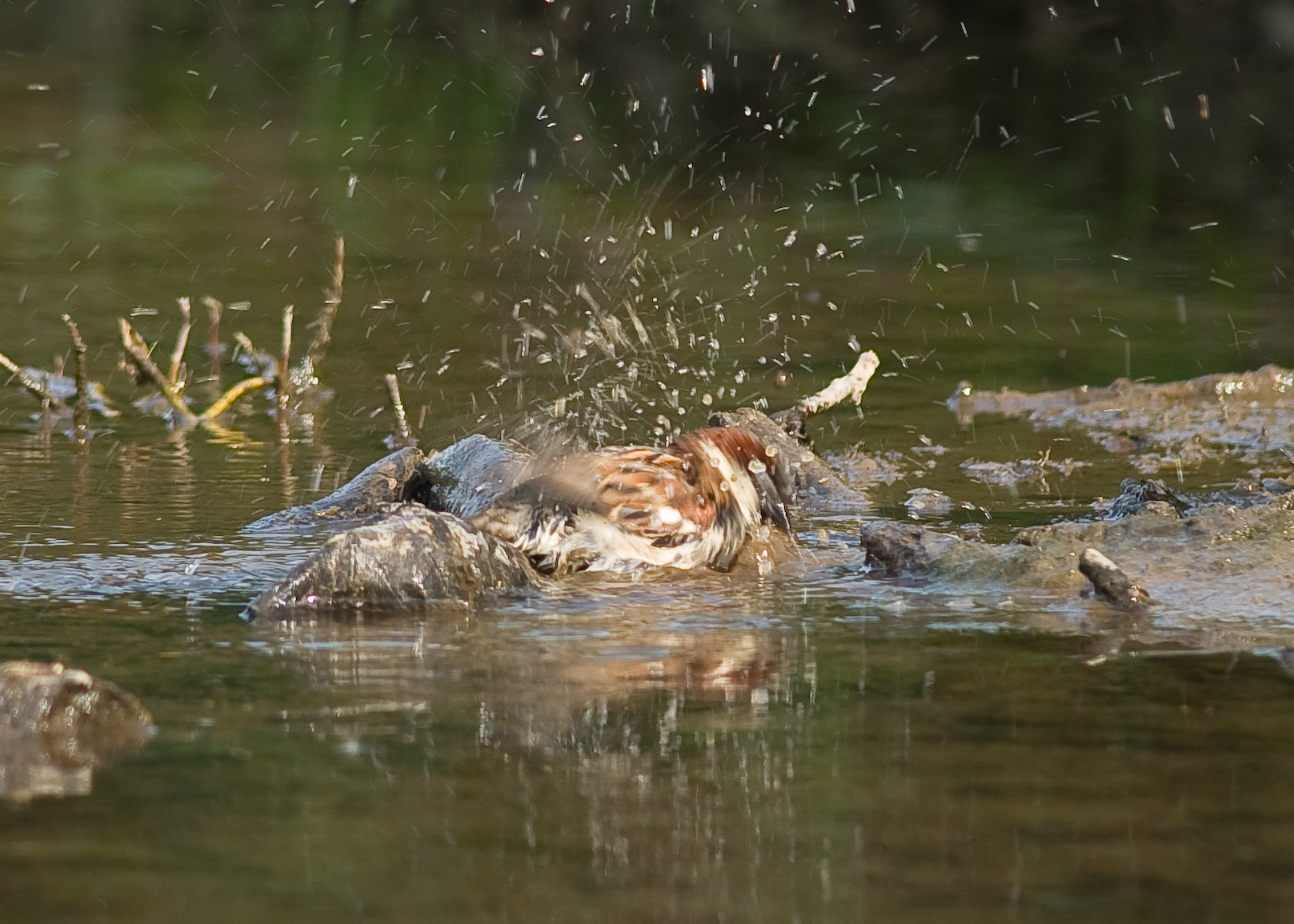 Obviously, this is no crow! It is of course a male House Sparrow bathing in the brook. I sat for an hour still trying for good Kingfisher shots which is still not happening since my return but lots of little "side-shows"taking place.