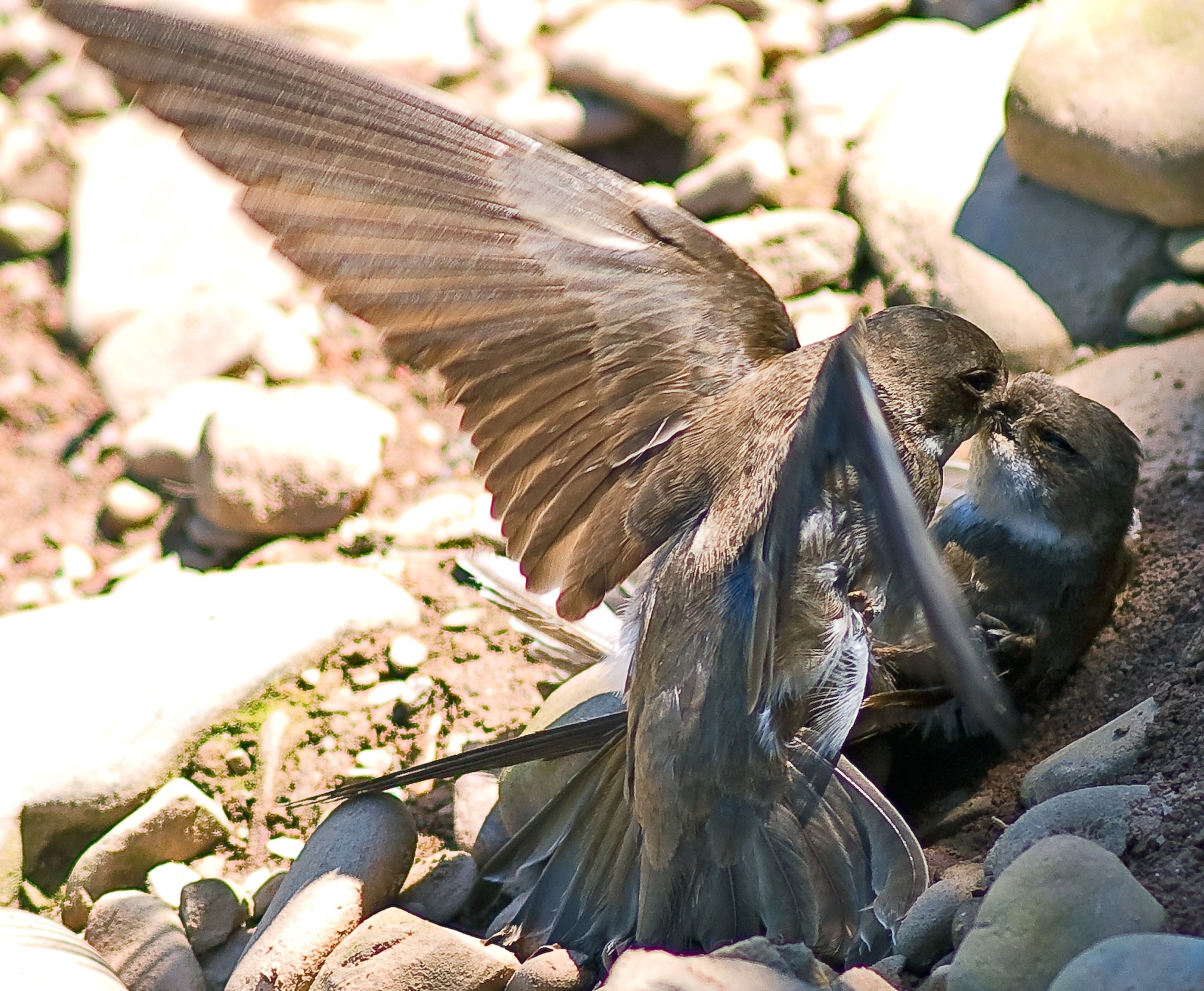 I witnessed some amazing behaviour yesterday at the Sand Martin colony on the River Exe locally. It was, and still is by the way, glorious cloud free, blue sky weather. I sat and watched the Martins coming and going, one pair particularly had a nest hole quite close and they didn't appear to be disturbed at all by my close presence. Suddenly, a really big commotion started and I watched this pair tussling and literally rolling in the dirt. This went on for at least a minute. One bird seemed to have the upper hand and I wondered what had caused this breakout of mayhem and violence. After a short while, an out of control dog splashed through the water towards the birds who, up until then had been oblivious of everything else going on around them. They felw up and over the water, momentarily still locked together. It was an interesting few minutes.