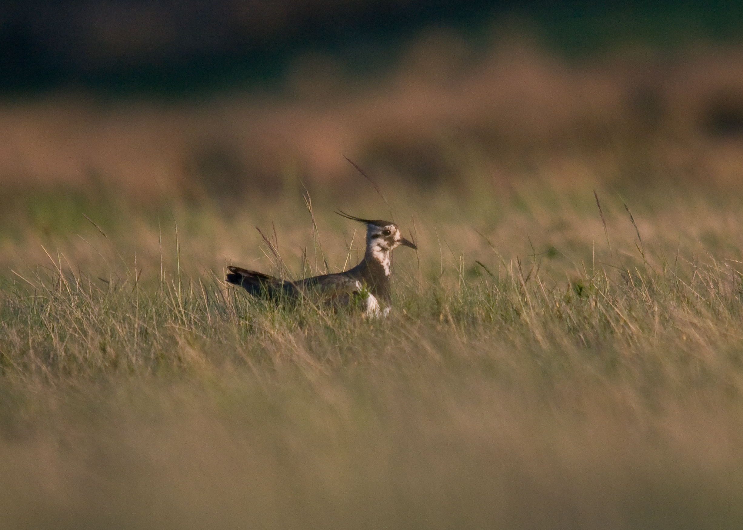 I had discovered the "nest" by watching a bird, also known as a Green Plover or Peewit, land in a field and then settle and sit. There was something about the behaviour of the bird that made me certain that she was sitting on eggs. Her strategy was to place the nest smack in the middle of the field where she could see clearly in all directions. Here she is, settling down on to her eggs.