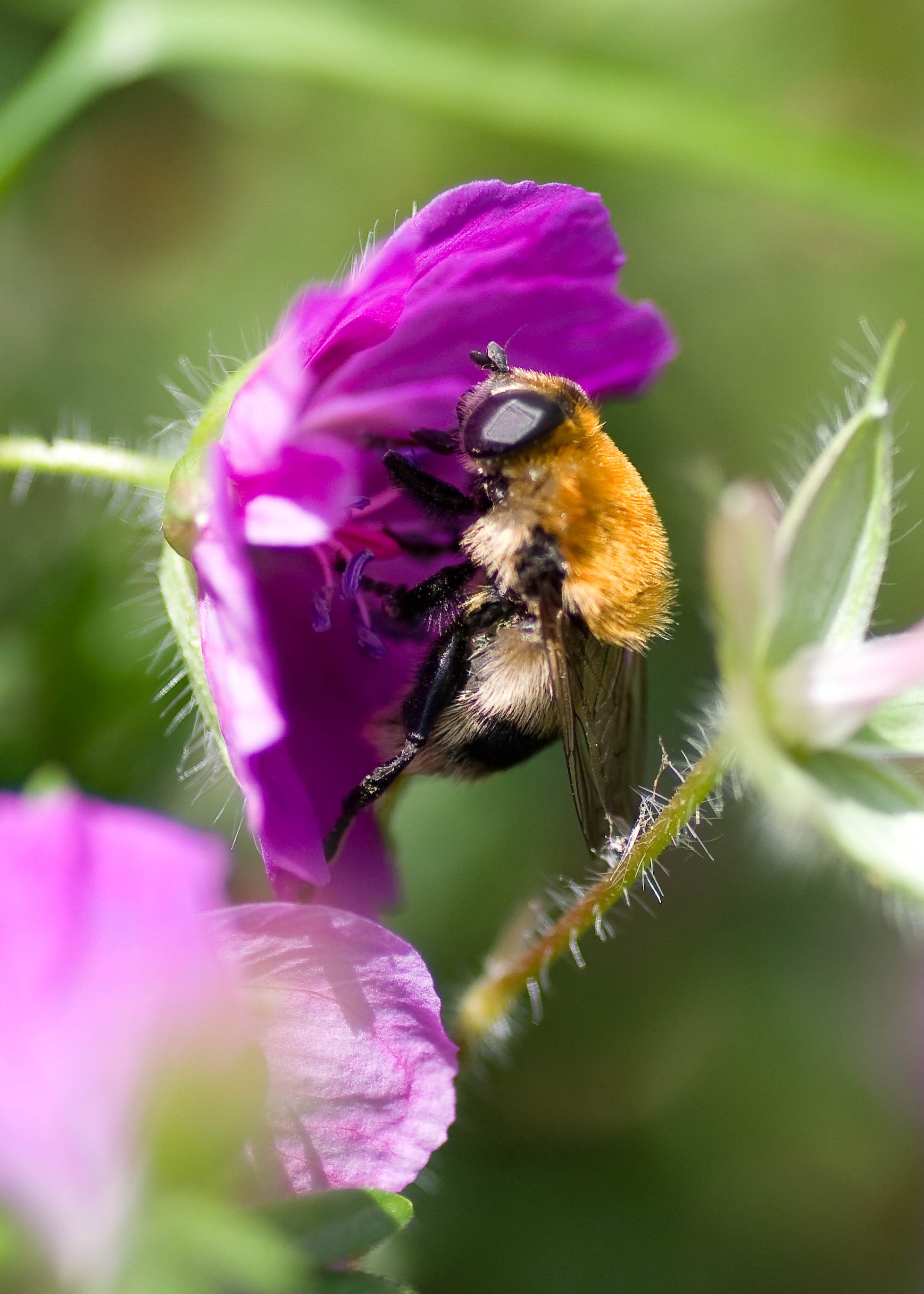 I have to say that the garden has been very quiet this last few months. Even insects have been scarce and I put this down to the use of pesticides in adjoining gardens over the last year. However, yesterday we had the first of the "special" hoverflies in the garden. Hoverflies are an interesting insect that we probably take for granted and ignore, but close inspection reveals an interesting group. There are 276 species of Hoverfly in the UK, I have recorded 23 in the garden. Some are quite familiar and common but as I said easily, and often over-looked. Many are colourful, some are frankly stunning but all of them are interesting because they use imitation as a strategy to escape predation. Not only are they attractive in the garden they are, in the main useful both as pollinators and predators in their own right. In common with other flies, they have 3 stages of development, egg, larva and adult. It is as larva that they are usually most beneficial to gardeners because at this stage they eat mainly greenfly and other aphids. Hoverflies need to be encouraged and their presence in the garden is a sure indication of a healthy environment. There are very few exceptions to this rule and today the Narcissus Fly (Meredon equestris) was on the wing in my garden, feeding on pollen from the new summer blooms. The Narcissus Fly gets it's name from the annoying habitat of damaging daffodil and tulip bulbs as a larva, foraging underground on the bulbs of these plants. This Hoverfly is a Bumble Bee imitator an could easily be confused as such. But have no fear, all Hoverflies are harmless to humans and carry no sting, nor do they bite.