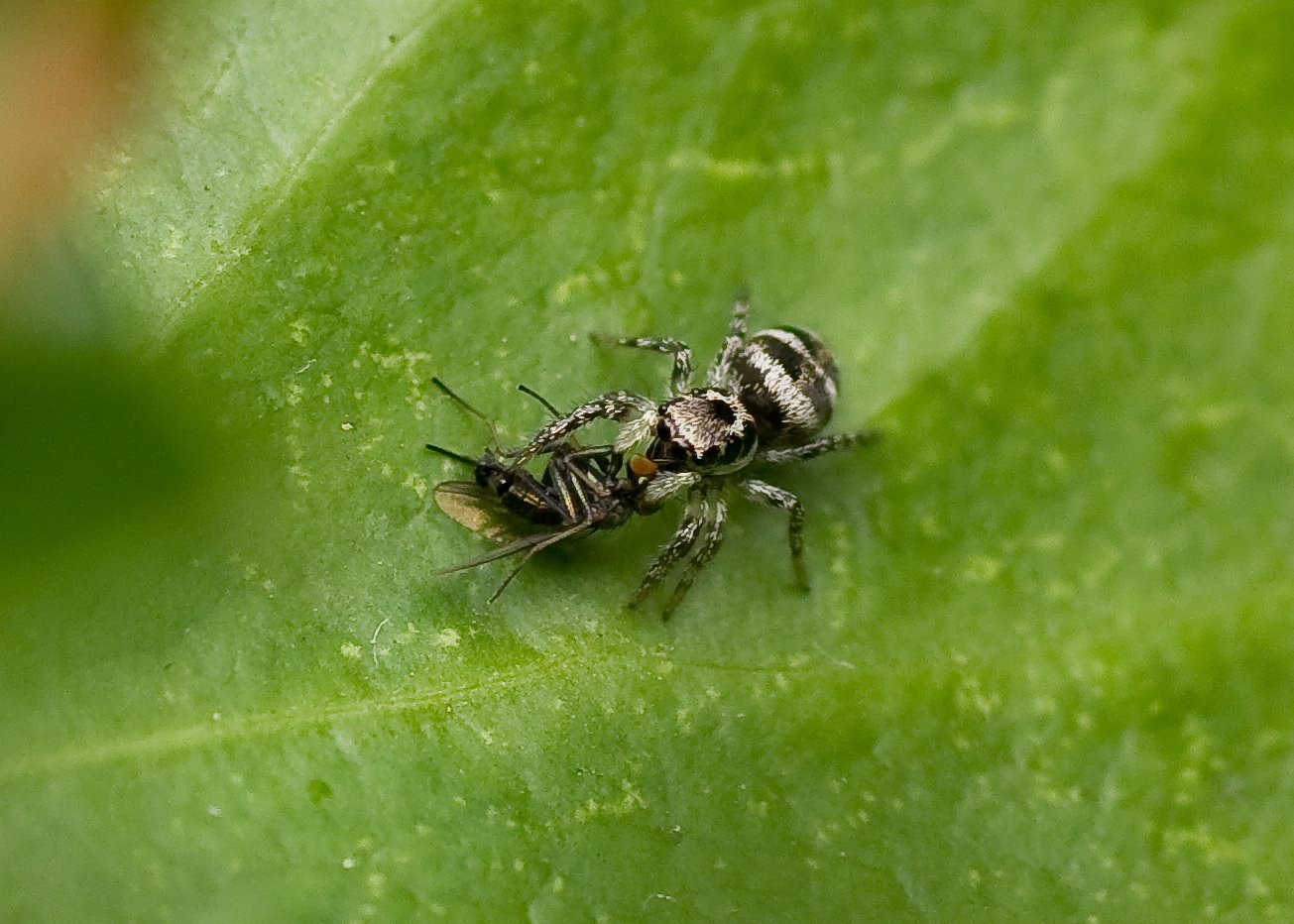 This is a Zebra Jumping spider photographed at around 10 times life size, they are actually 3-mm long. I noticed it this morning in bright sunlight close to my house. I love these little spiders. They are always very endearing but also voracious hunters. They do not use a web to catch their prey but instead hunt by stealth using their brilliant eyesight , well they do have 8 eyes! They are capable of creating thread from a spinneret which they use to anchor themselves if a leap is unsuccessful, like a rope they can then crawl back up. Notice in the top picture that it has a fly in it's jaws which it is in the process of consuming. If you double click on the image it will open up larger in a new window and you can see a little better. I find it fascinating that this species is also found in the USA as well as Europe proving that they are a very ancient species that lived when their was a common continental land mass millions and millions of years ago. A bit more searching as the day went on found me 2 more so I suspect that they are quite common in the garden at present.
