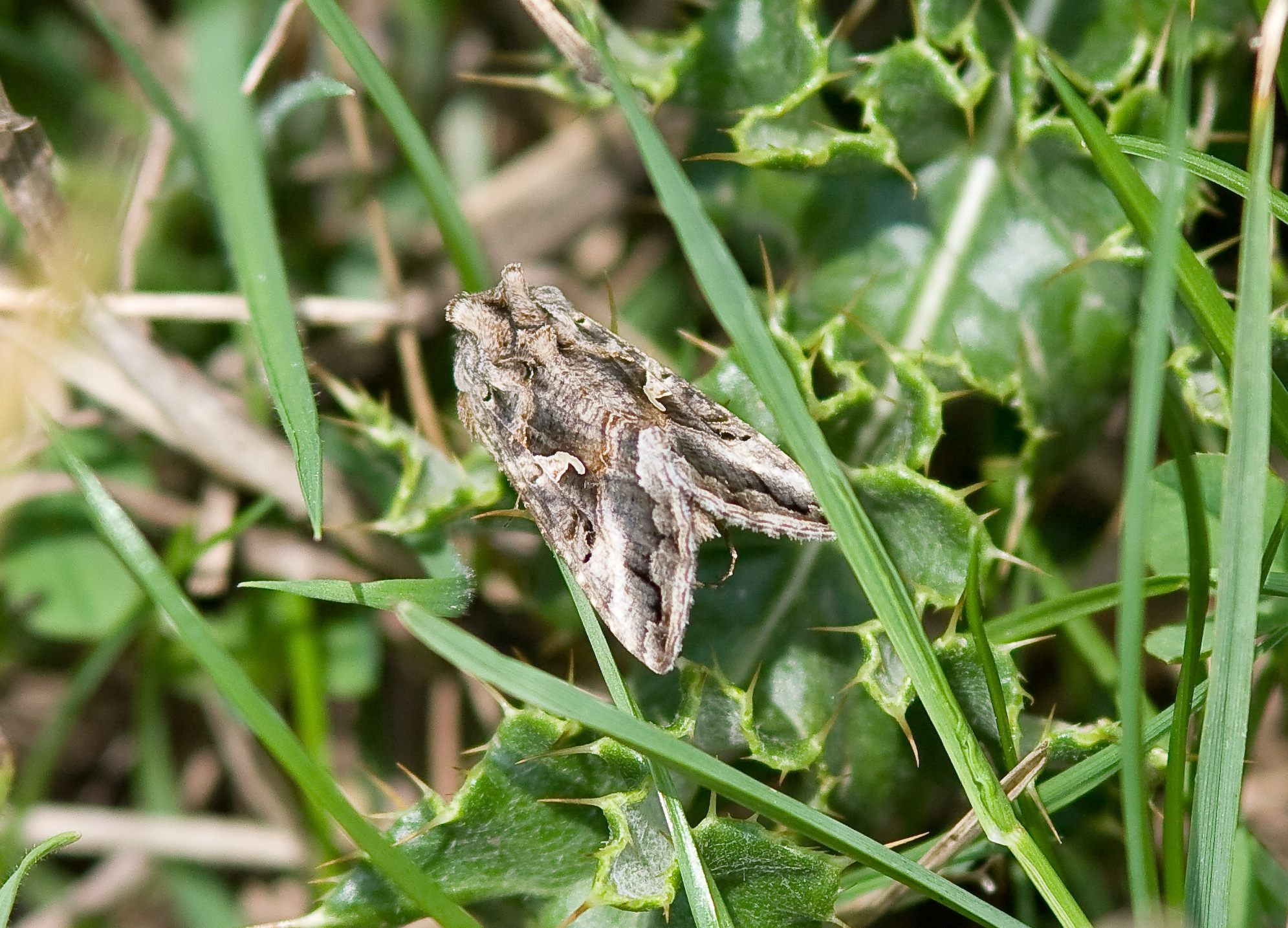 This is a Common Blue Butterfly – Polyommatus icarus. There are several on the banks of the brook and today, in between waiting for Kingfishers I had a closer look. The other day I had seen a Painted Lady but there was no sign of one today, nor Comma which I have also seen a few times. I took this next photo of a moth, A Silver Y – Autographa gamma species. (Thanks Phil)