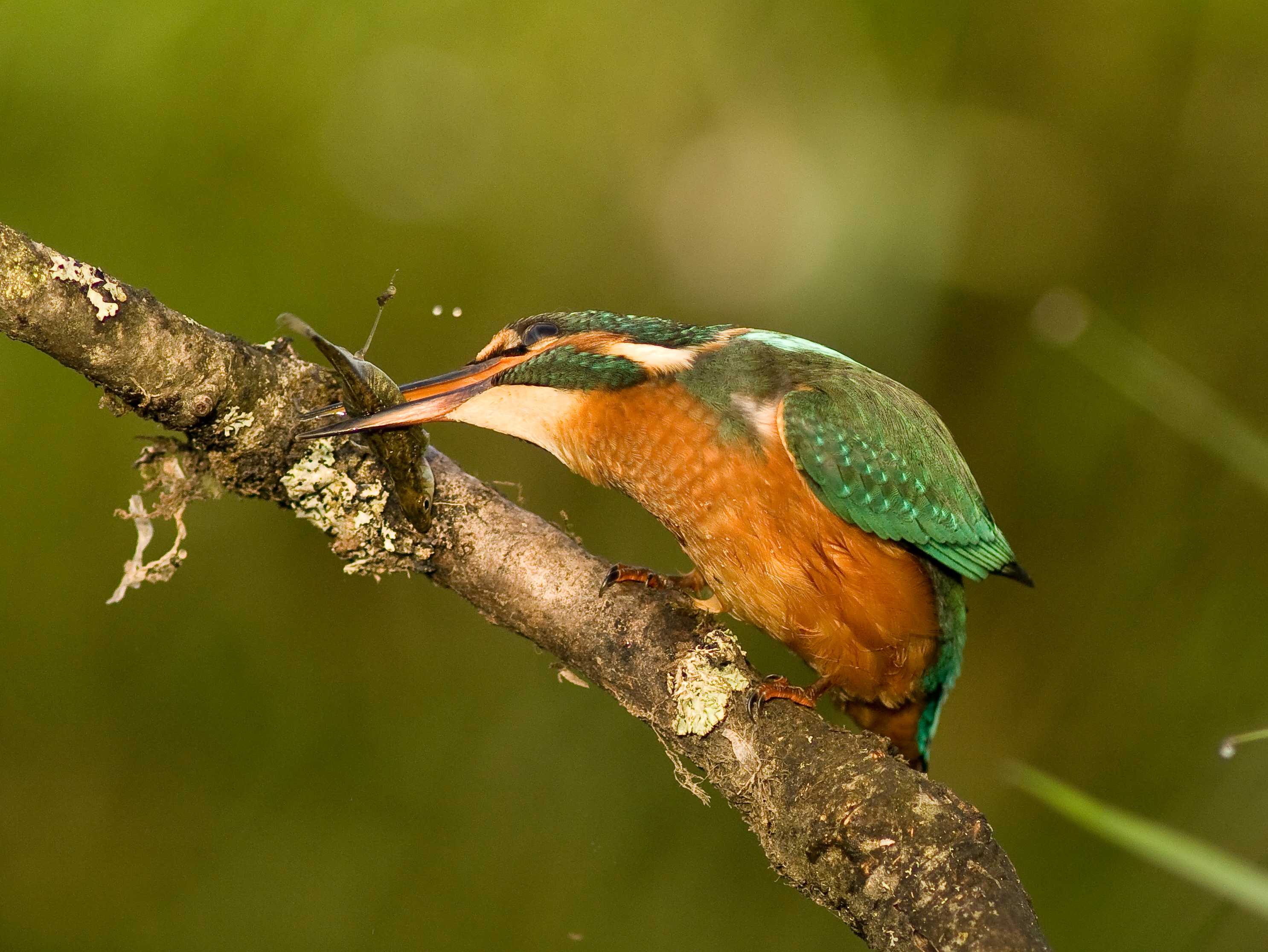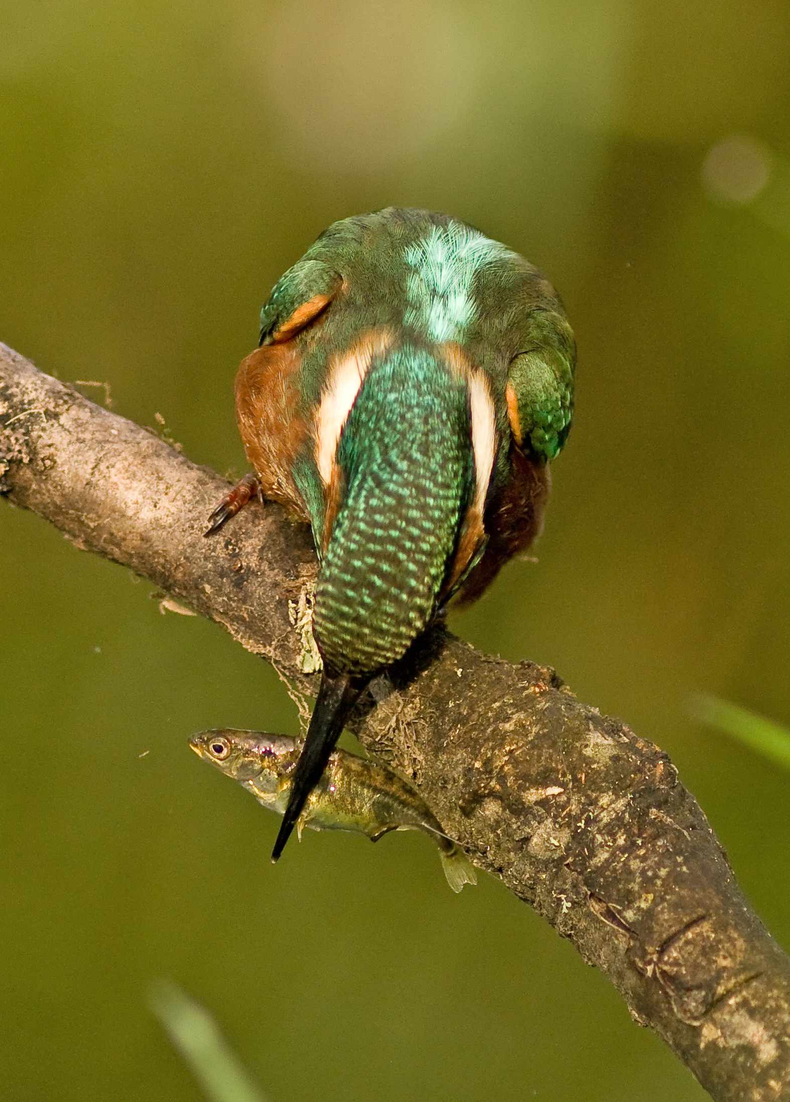 Carrie and I went to the hide at just before seven this morning and we were, in the end trapped in because not only did one KF come and really perform another came momentarily and the usual aggressive dispute took place. I am confused now? Are there actually 2 KFs using the perches, obviously at different times, but this morning made think, "Which bird is which?" The light was just about as good as it could be, and I said to Carrie, "imagine if she comes now", and then there she was with a massive stickleback which she really beat up before eventually managed to get down. It must be disappointing when you are a KF to catch a Stickleback when they are so hard to deal with compared to a big fat ,meaty minnow.