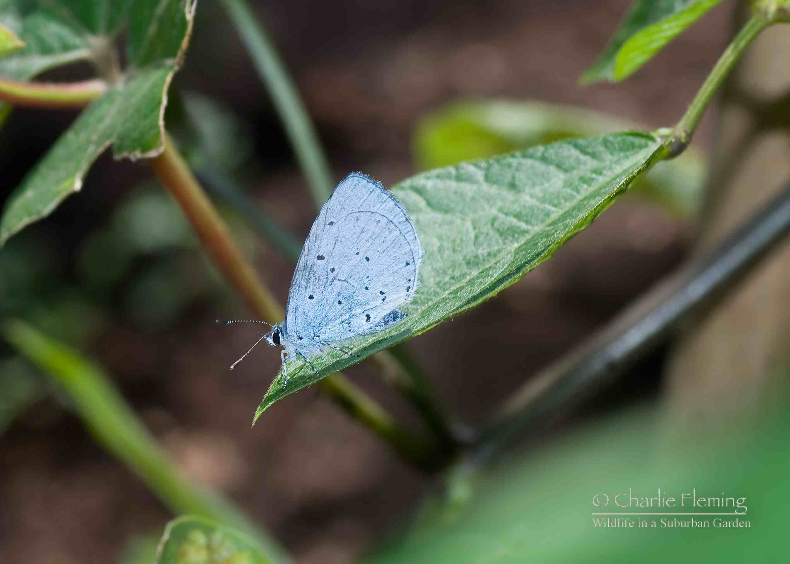 We have had several flying Holly Blues in the garden this last few days and today I managed to get a nice photo of the species to make a record. Last year, I think I am correct in saying, they were totally absent from the garden but I have had them in previous years. This is probably due to the involvement of a parasitic wasp that is solely dependant on the Holly Blue, I have read that their populations do fluctuate from year to year. They apparently also have a preference for honey dew which will explain why this one was on my bean plants and not on a flower.