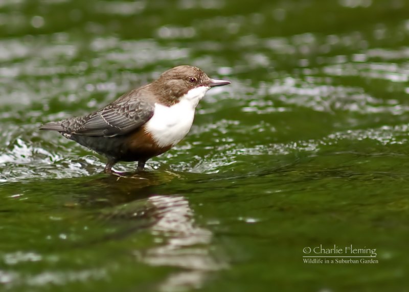 His plumage is obviously very well cared for because each time he emerged totally dry as the water tumbled off his back. His plumage is interesting. He has a bright, clear and clean white breast which extends to the belly, here there is a band of rich chestnut brown changing to a dark, almost black under the tail. The rest of the plumage is a very dark chocolate brown, and dependant on the light, almost black apart from a lighter browner hue on the head. Each feather on the back is delicately fringed with a lighter colour which is more pronounced on the edge of the wing coverts forming a very narrow wing bar.
