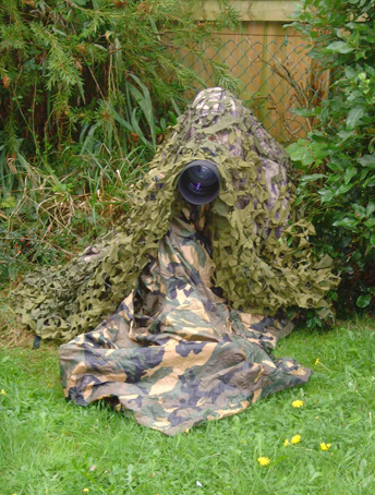 “I have a combination of cam gear. I always wear cam clothing which I bought from the USA on a visit, it is called Mossy Oak by Readhead but I also like the range by “Jack Pike” here in the UK which you can get from any hunting shooting and fishing shop. Also Government Surplus shops are good. I was a musician in the Royal Marines for 35 years so I am used to a bit of military gear (although I hatred wearing it when I was serving). A cam poncho is a good bit of kit. I basically sit down on a military roll mat (from the surplus shop) this will keep your backside dry as well, then put the camera (on a tripod) between your legs with the camera at eye level. Find a spot where you can lean back so your back is already hidden and you feel comfy, youre going to be there for 2 hours! Then cover your lens with a military face veil…. obviously not the front… I mean just wrap it loosely around. Get your ‘poncho’ and drape it around yourself, then cover everything with good quality “scrim’ or cam netting (also government surplus) pay about £20 for a piece 8 feet by 8 for example. Finally pull the poncho over your head so that you are now covered with a combination of netting (called scrim), and the poncho. If you want to make doubly sure use bracken… already prepared before you sat down, to cover your legs and you can even thread it in and out of the netting. I have an acquaintance who was a recent Major in the SBS ( Special Boat Service) and he was telling me that this method of camo was good enough to fool a Jaguar in the jungles of Belize and Guatemala when he had one pass within 6 feet of him as he was covertly watching Guatemalan soldiers.”