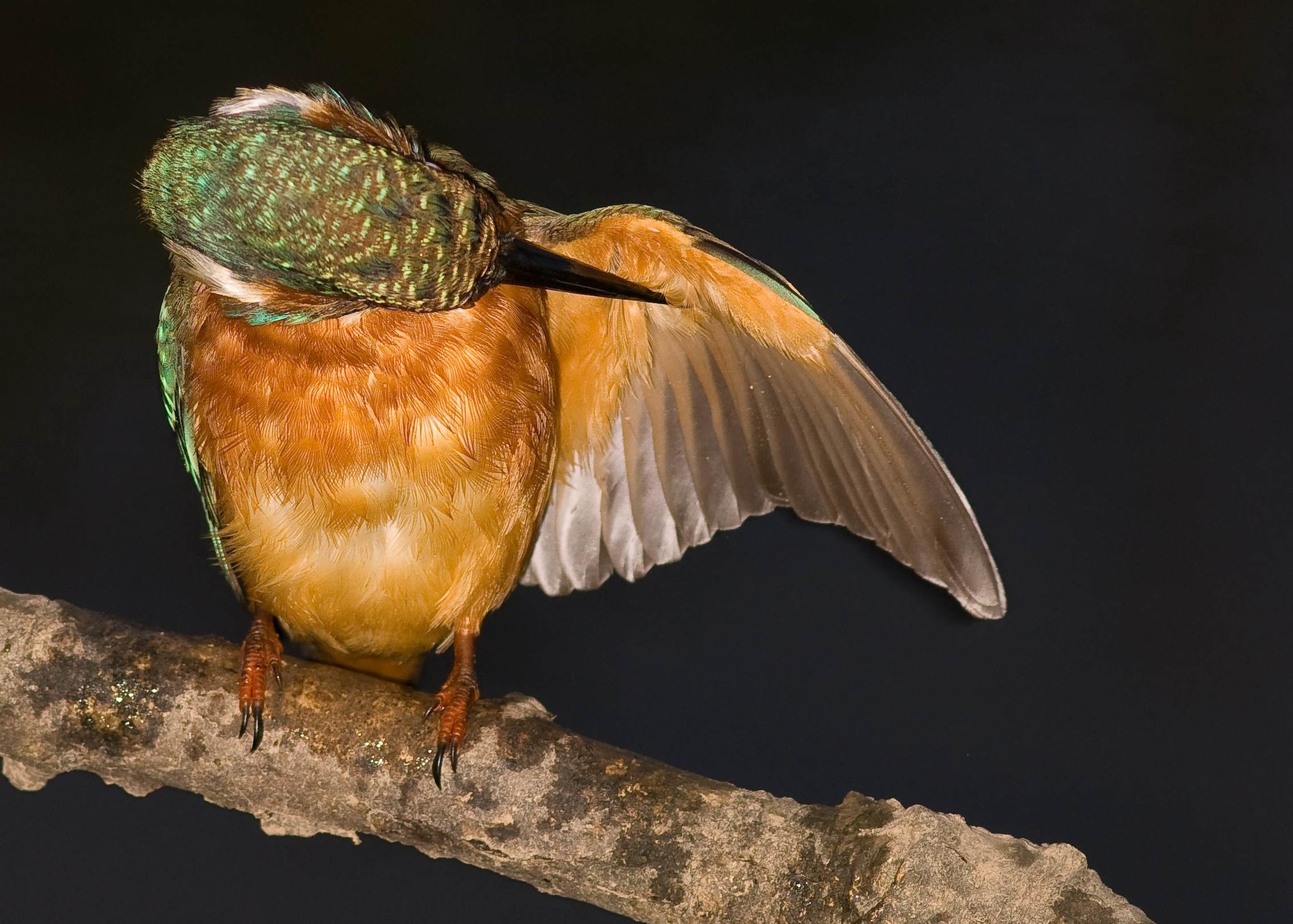 I had a look at my hide this evening just to keep tabs on my Kingfisher really. I was pleased when she put on a nice show for me, bathing and preening. The only real difference was the state of the light, in fact it was almost dark and there she was bathing which was a big surprise to be honest. Using the flash, I managed some nice shots of her which were a bit different. I don't think she is the prettiest of Kingfishers at the moment to be honest. She seems to have a very long beak and she is a bit ragged around the chest but that should improve when she completes her moult.
