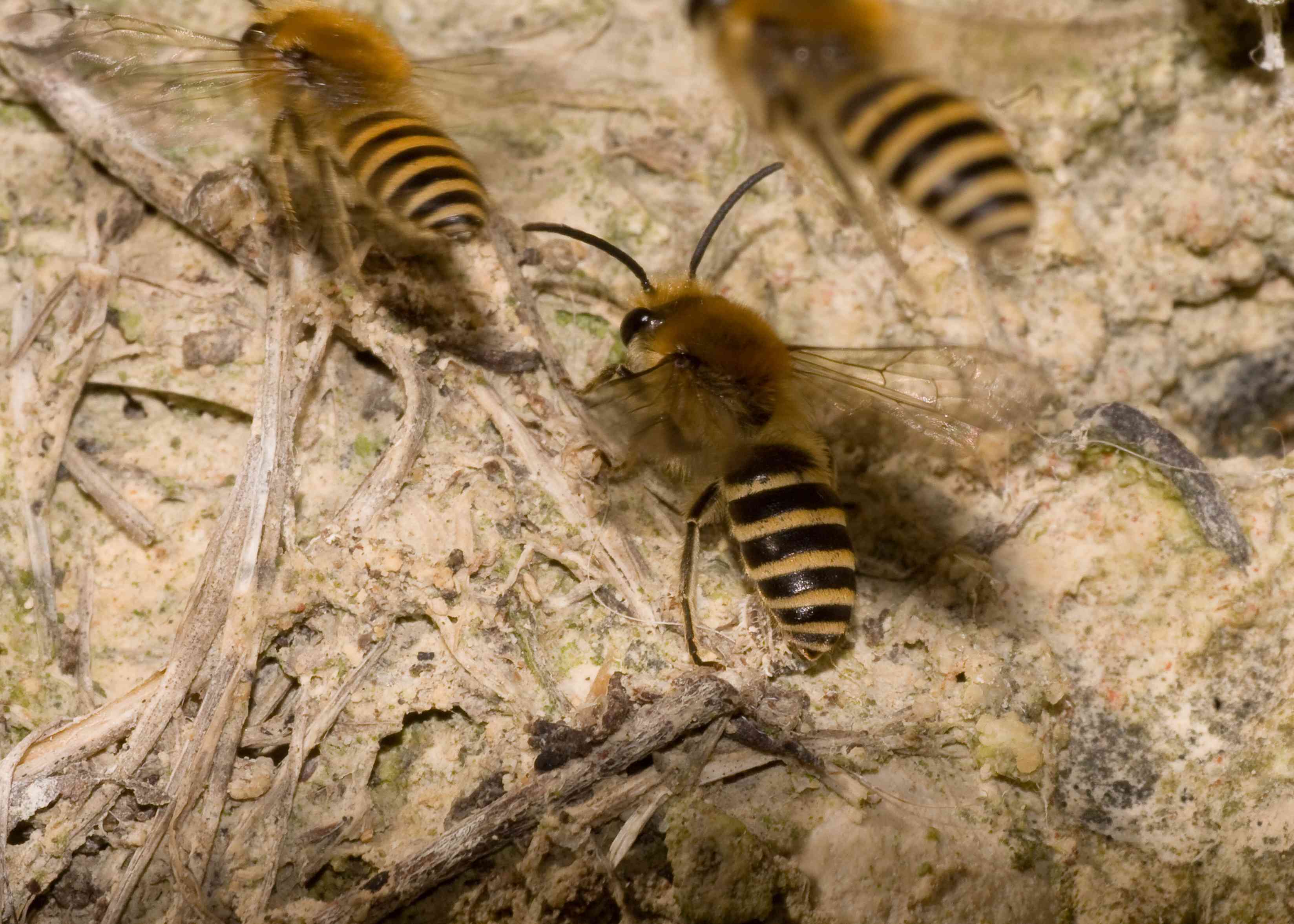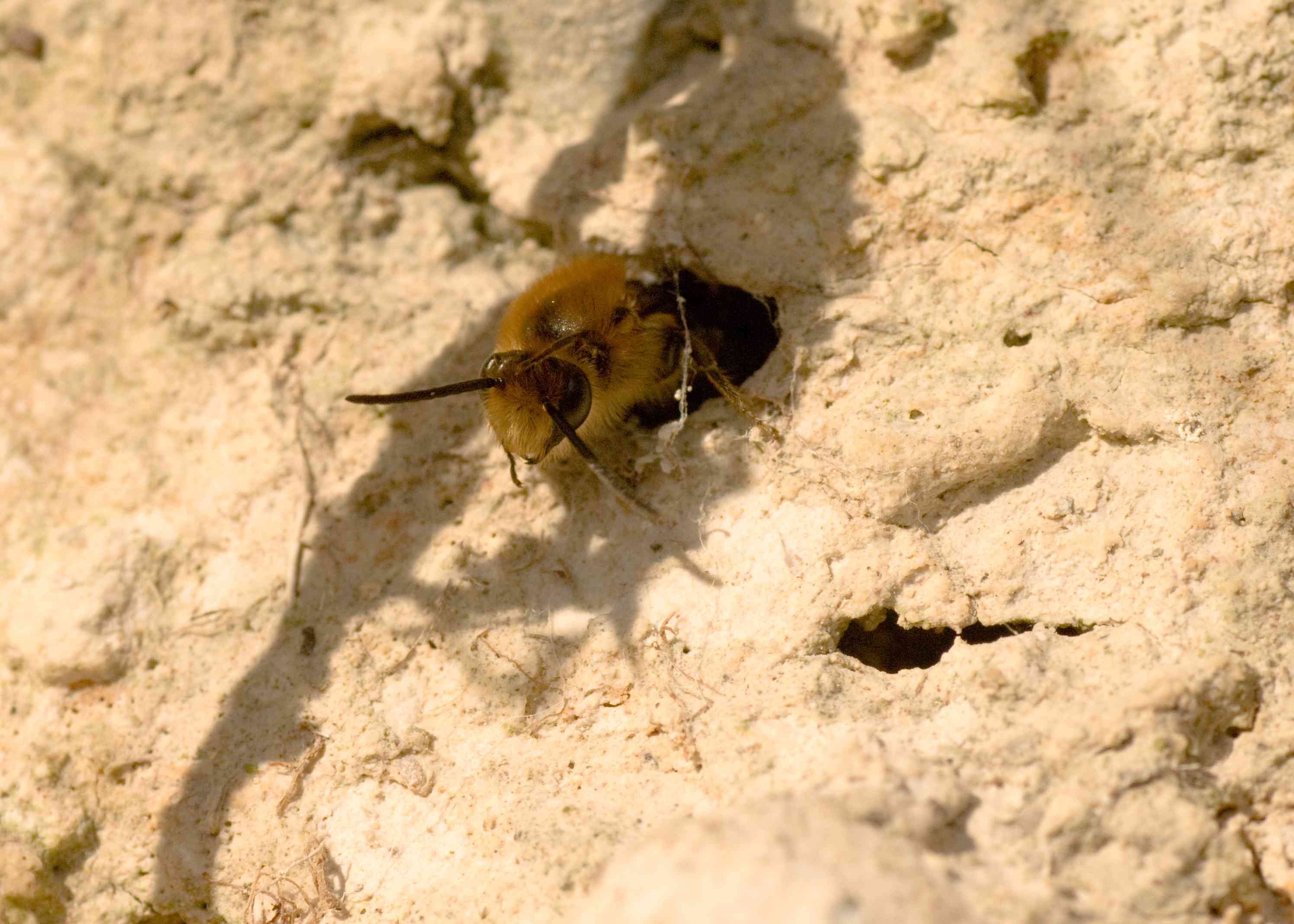 It was fascinating to see literally thousands of Mining Bees on the cliff face at Beer, East Devon this afternoon, in very strong sunshine. They were using small holes which they have excavated themselves. It was very interesting to see them coming and going. Apparently it is not unusual to see Mining Bees in large aggregations when conditions are right. They are only active in sunlight, and it was very sunny this afternoo! There were two obvious sizes, the larger ones were females I think, and the much smaller ones males who were coming and going with laden pollen sacks. I am sure that this is not an unreported phenomenon here at Beer. At the moment I don't know the exact species except to say that they belong to the Colletes species of Mining Bees. There are 8 species resident in the UK so it will not be too hard to name this species accurately. I have just noticed in the photograph that they are all facing the same way, not sure if there is any significance in that but when I see them agin, because I plan to return and try for better photos, I will look more carefully.