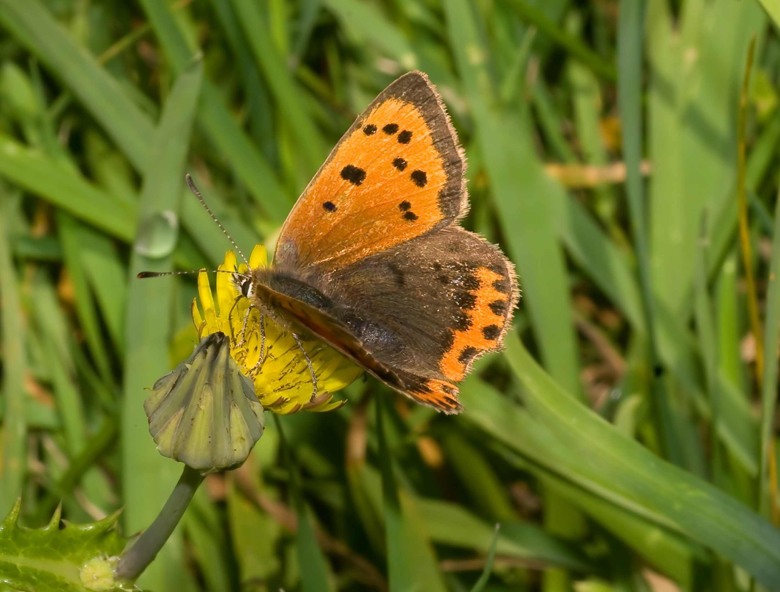 It has been a glorious day today with non-stop sunshine from dawn till dusk. We did however, have some rain again in the night and when I went to the hide first thing this morning, it was almost flooded again. I sat, very uncomfortably in water, (I was wearing waders), and it didn't take long to get cold. I was not really all that interested in getting a photo of the Kingfisher, I just wanted to see her and know that she is OK because, apart from a very quick glimpse of her yeaterday I have not seen her for almost a week now. No sign of her this morning, nor this evening either……… very worrying! I did see some very interesting Butterflies though. At least four Small Coppers flying in the morning sunshine on the banks of the Alphin Brook, quite a sight. They are very pretty, but also very small. This picture (below), is twice life size. Apparently, if conditions are good they can have as many as four different hatchings, so this is what I was wtnessing today. A nice sight in the first week of October.