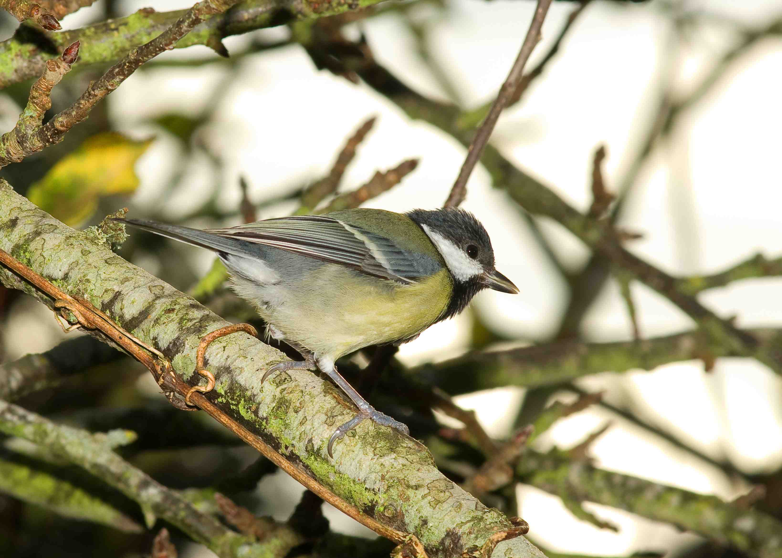 The picture above was captured by placing my camera 6 feet high on my chicken run and then on a tripod. I pre-focused on the apple, knowing that Blackcaps and at times, Blue Tits potentially feed on the fruit. Then I moved back in to the house and waited, some 30 feet away to for the arrival of my subject. The camera (and flash) were activated remotely and here is the result……… quite interesting and I like it! Below is another of a Great Tit, I had positioned the camera and pre-focused on a branch in the tree and then watched and waited and fired the shutter remotely when I knew the bird was "on the spot". Also a good-n!