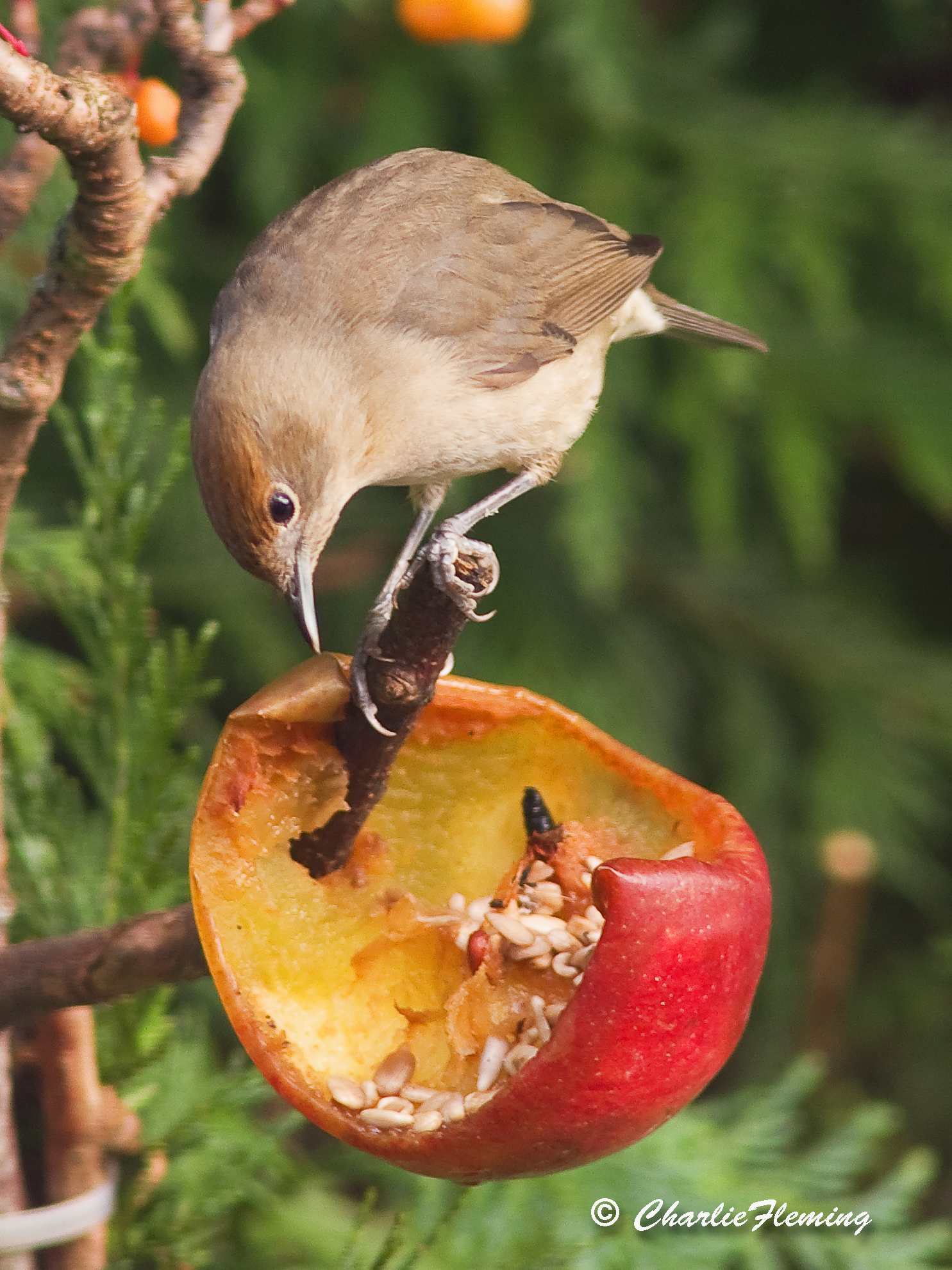 Here's a picture of the Blackcap female, yet again on the apple which she loves.