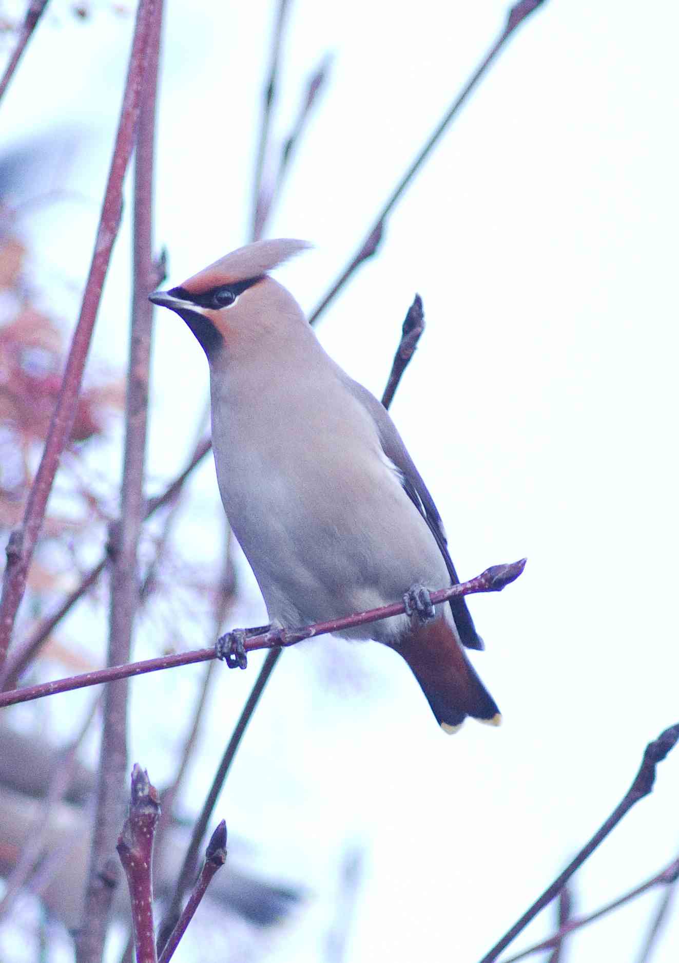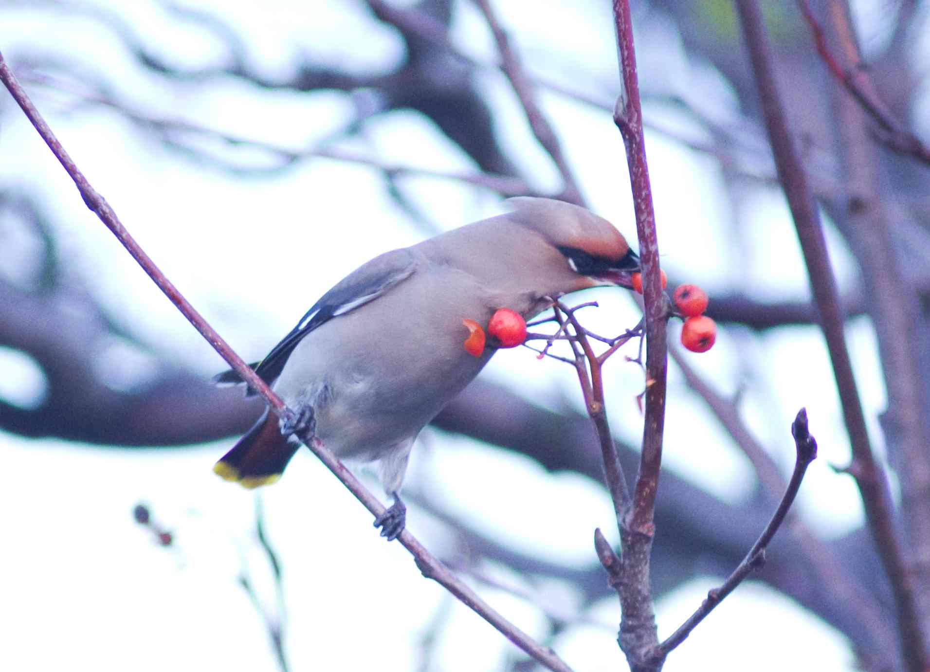 We had a nasty day today, dark, wet and overcast so I wasn't particularly disappointed not to have any transport until mid-afternoon. Fortunately that coincided with some bright weather arriving so, at 3.15, I decided to go out to the local trading estate, just minutes from home, where a flock of 30 Waxwings had been reported for the last couple of days. A quick drive around the garage forecourts proved a negative at first but eventually, as I came around the corner, there they were! What a sight, 30 Waxwings (I counted them), completely smothering a small berry laden tree. They were right on the pavement and next to one of Exeter's busiest roads. It was probably one of the most impressive sights I have had as a bird enthusiast, almost crazy, so close to the road, a tree only 6 foot high, completely covered in birds! By now the sun had almost gone down and dusk was approaching so the few photos taken, pushed the camera equipment to the limits, but I did get some pretty photos. This is my third encounter with Waxwings this winter, twice close to home and of course, the first of the year. If I was a list keeper I would have been pleased to add the bird to this years list as are all the locally based twitchers. I am sure that eventually, and it won't take long, all the berries on this little tree will disappear so it was good when I was looking for them, to find another tree still laden with berries that they will probably find. It was in a quieter road and might give some really good photo opportunities.