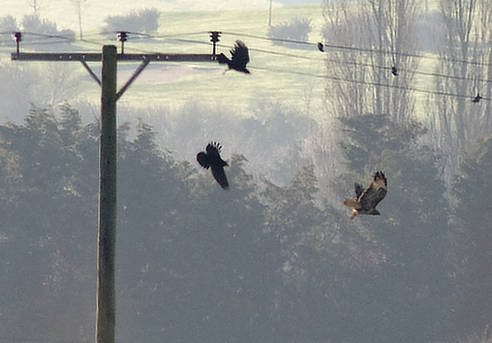 The weather continues to be nice and clear, bright blue sky and frosty morning, a good day to be out and amongst it all. The only problem with that of course, is that everyone else thinks the same and the marsh was like Old Trafford on match day! Birdwatchers, walkers and cyclists all over the place making it hardly a peaceful, idyllic wildlife haven. So it was with some surprise when I reached the area that I had seen the Hen Harrier yesterday to find it very easily again. This time, I almost got up close to it. As I walked on one of the public paths across the marsh….. there it was on a fence and not too far away. It was being worried by a couple of crows and I quickly realised that they were trying to get a share of the prey that the Harrier had caught. Almost immediately it lifted off carrying it's prey, which I could not make out, and landed on the telegraph pole that you can see above, with the two crows in hot pursuit. As soon as it had landed the crows gave up and I watched it eating the prey through binoculars. Unfortunately it was just too far for the camera and there was a mist in the air that made any kind of photography really hard. I sat on the ground and waited, and watched and then waited some more. I could see it feeding and I was hoping that it would fly back in my direction, and who knows how close it would perch. But it didn't. Eventually the crows returned and continued their pestering and after a few minutes of that, it left not to be seen again.